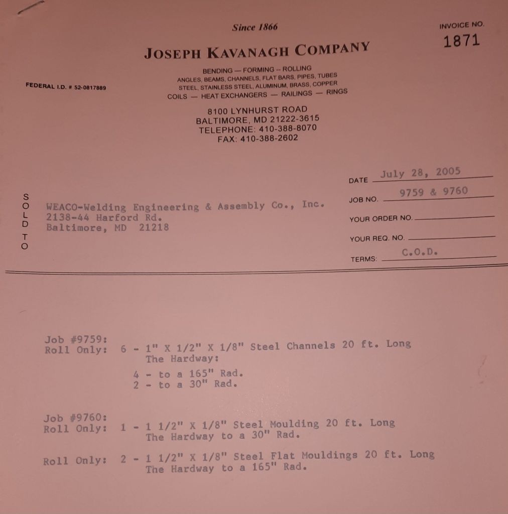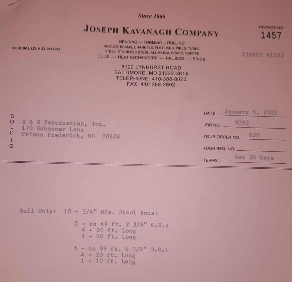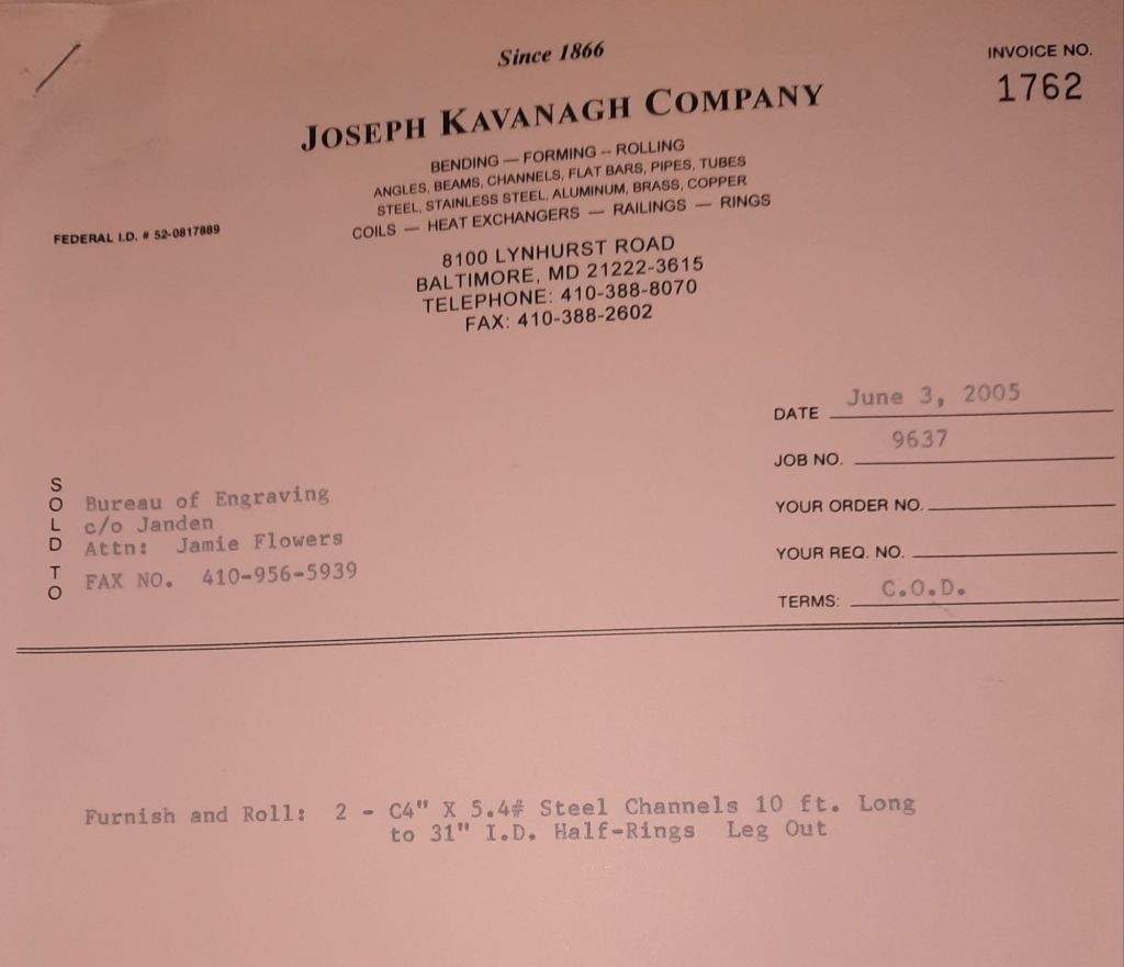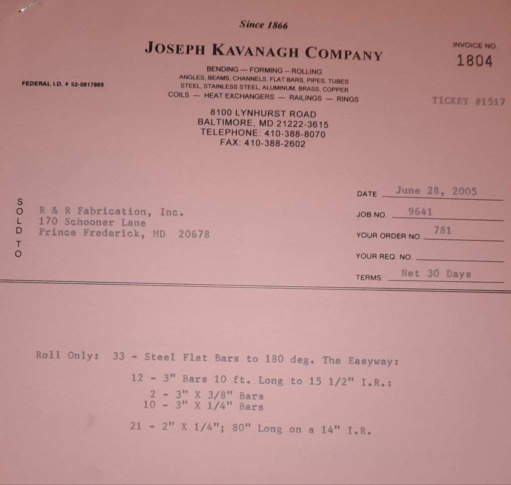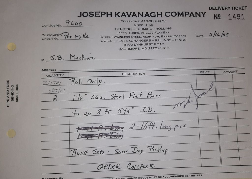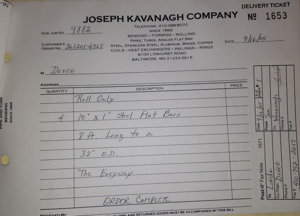 I sit at my desk and check for emails. I have a few. The website with emails is a success to me. The biggest positive is customers can send me a drawing or a picture or even a rendering. Being able to see any version of what the customer wants is a great help to my job. It’s like getting a fax only faster. I can decide if it’s something we should bid in a matter of moments. The items we clearly can’t do can be dismissed with a polite reply. Most of my dealing with vendors and buyers is via the phone but I think that will change. The internet will change that but we still have to bend and roll. Do our jobs. The Shop rolls along with more channels for the Bureau of Engraving and Printing, some tubes for a ship repair, pipes for the Hagerstown Wastewater Treatment Plant and some pool parts for Five Oaks Swim Club.