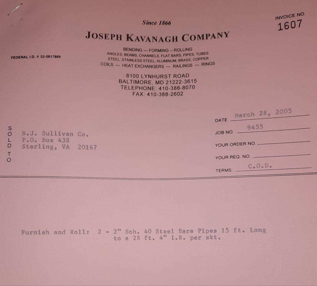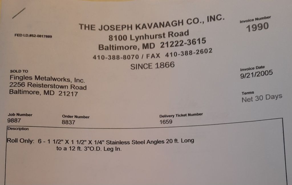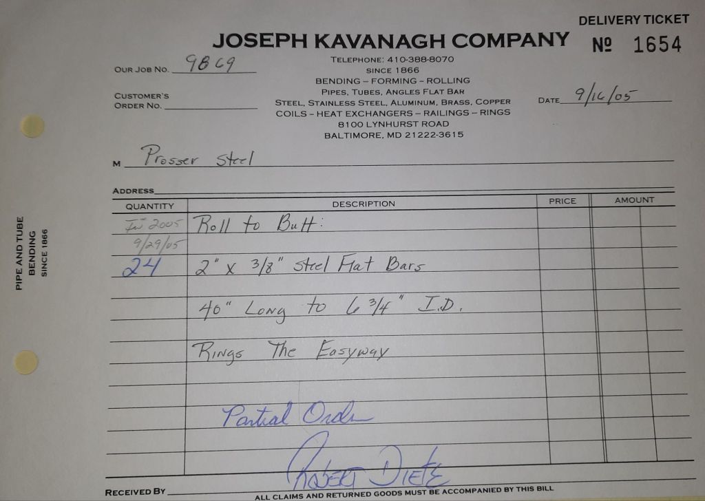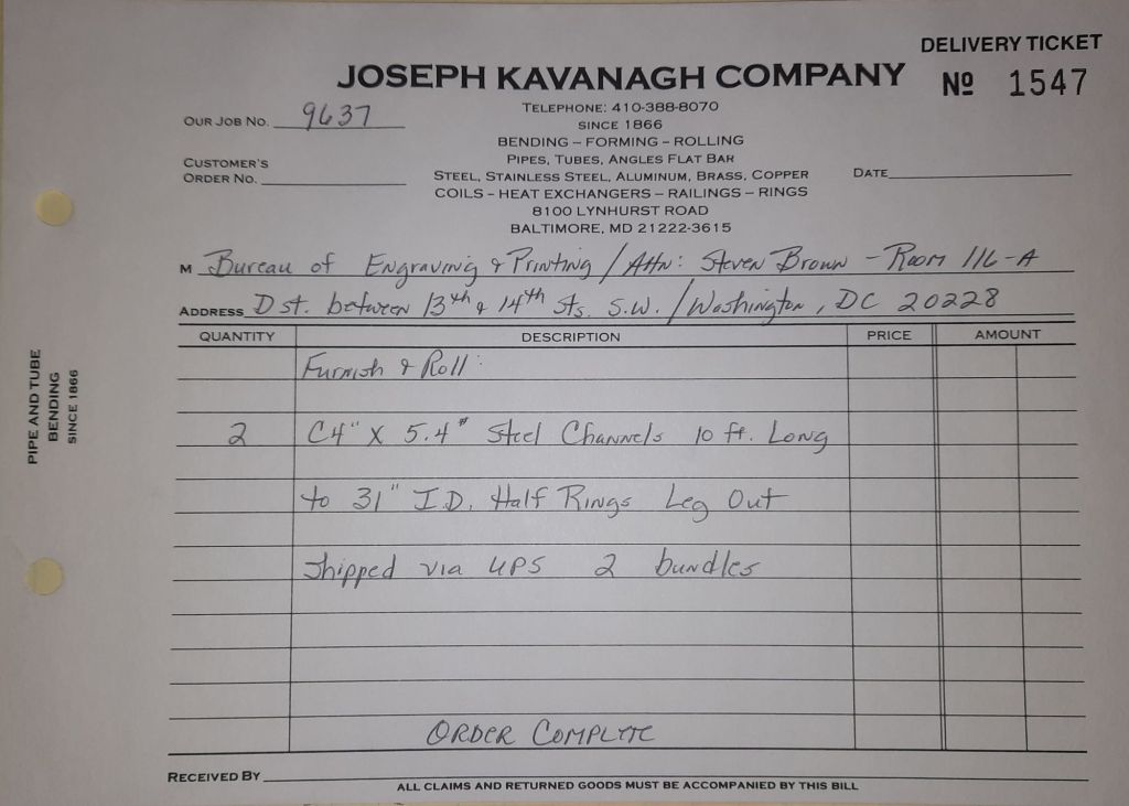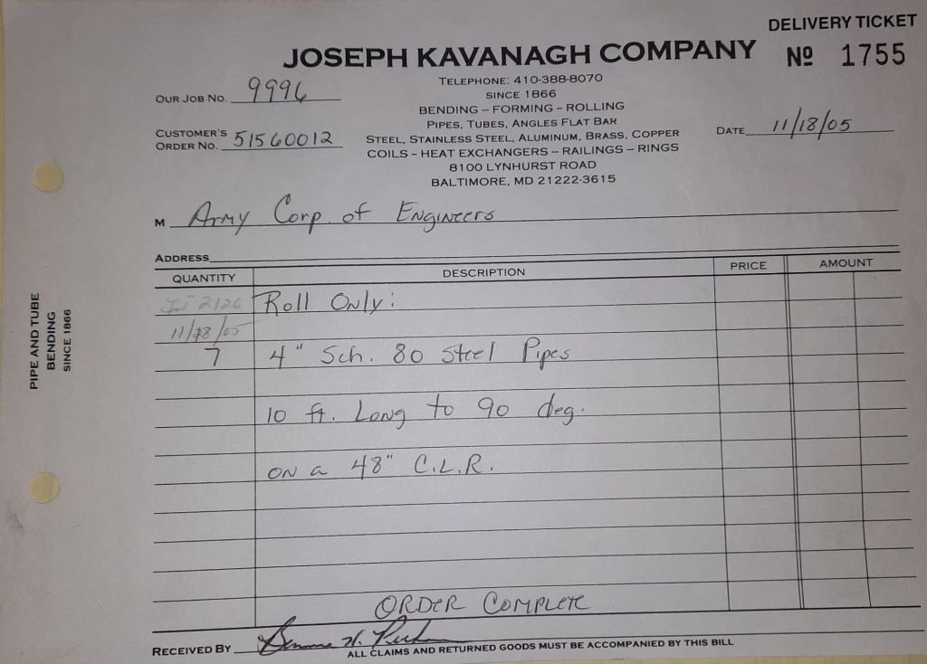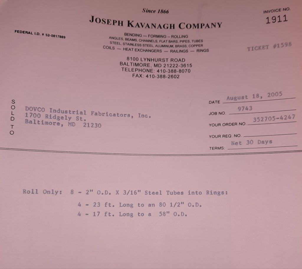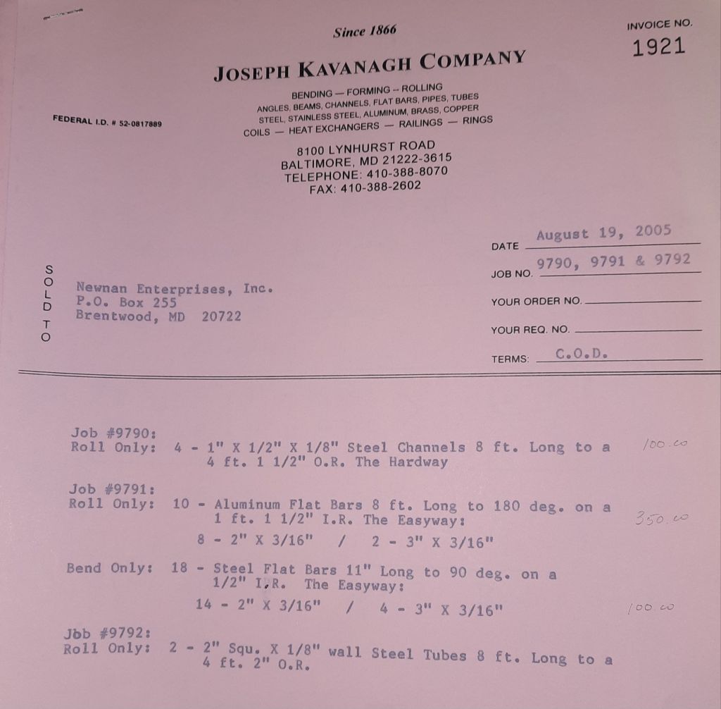 I sit at my desk and check for emails. I have a few. The website with emails is a success to me. The biggest positive is customers can send me a drawing or a picture or even a rendering. Being able to see any version of what the customer wants is a great help to my job. It’s like getting a fax only faster. I can decide if it’s something we should bid in a matter of moments. The items we clearly can’t do can be dismissed with a polite reply. Most of my dealing with vendors and buyers is via the phone but I think that will change. The internet will change that but we still have to bend and roll. Do our jobs. The Shop rolls along with more channels for the Bureau of Engraving and Printing, some tubes for a ship repair, pipes for the Hagerstown Wastewater Treatment Plant and some pool parts for Five Oaks Swim Club.
