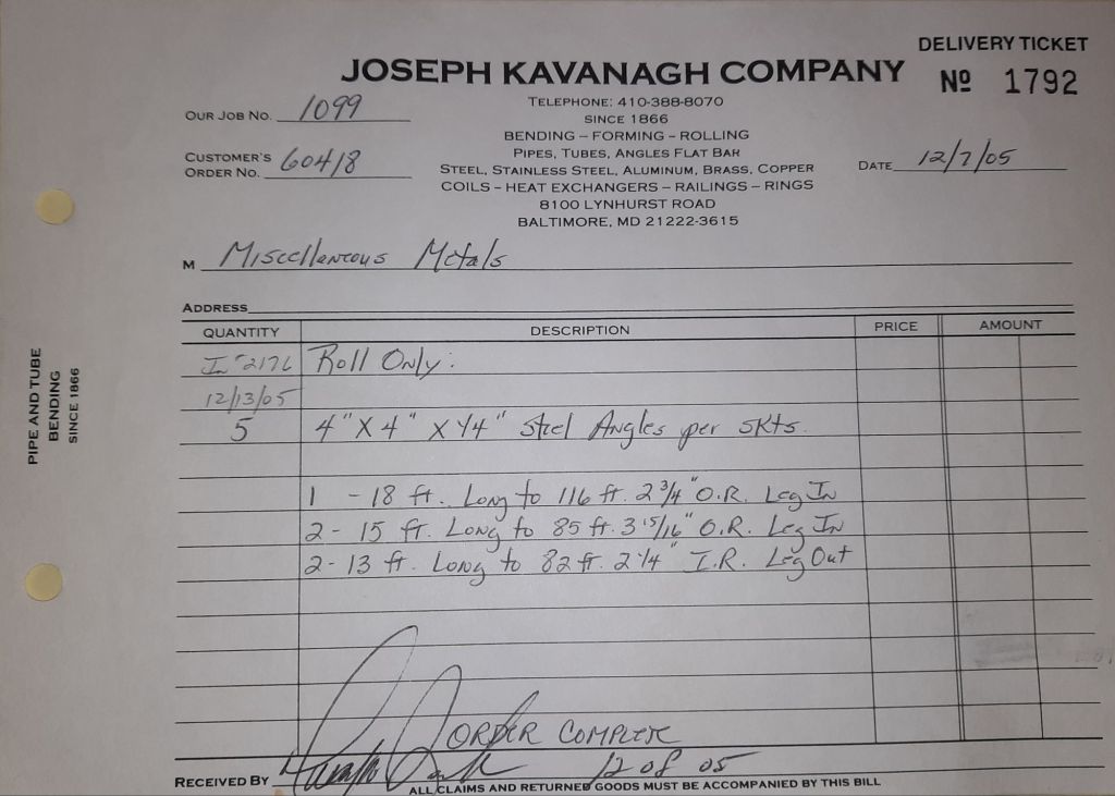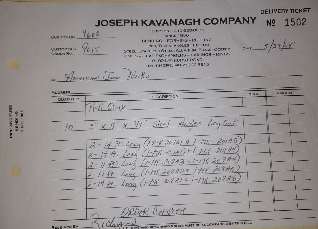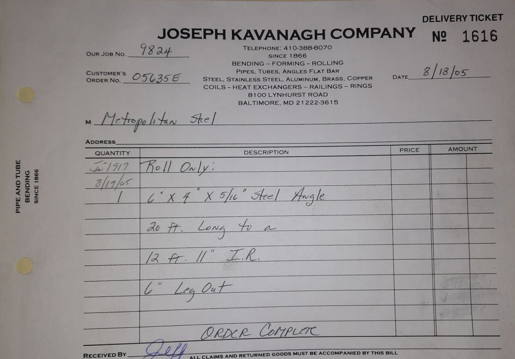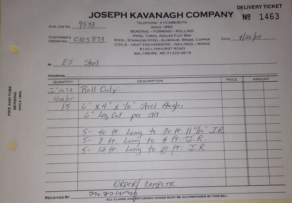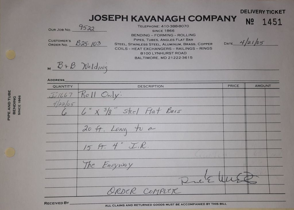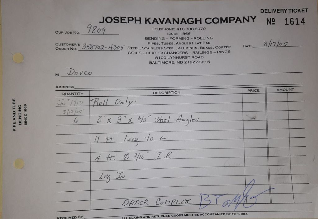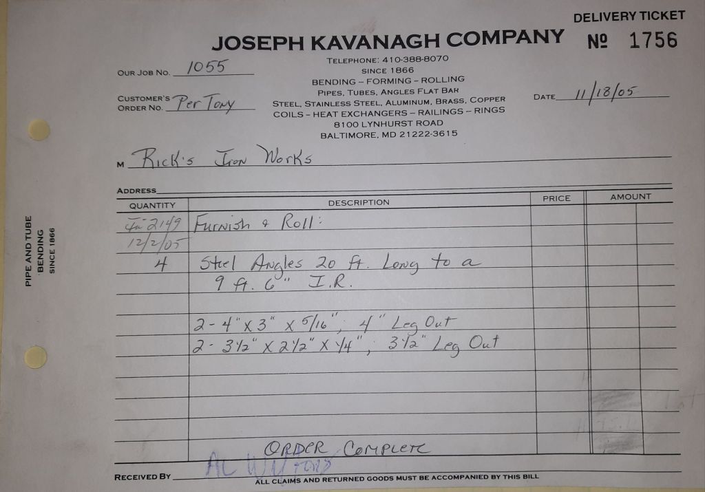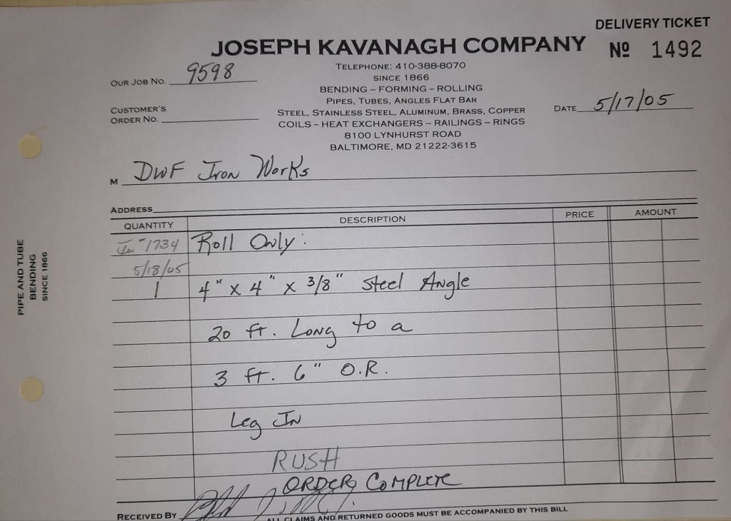 Today is Friday. The day most working people wait for patiently. That’s true for Kavanagh’s and crew. We finish some small jobs today including some formed angles for Beltway Iron. Formed means they are bent from plate and not made in a steel mill. A press brake is used to fold over the plate into an angle. It’s always challenging to roll these because they are thinner than mill angles and more irregular. Still, these work out fine. I finish filling out some delivery tickets and it’s time for everyone to head home.
