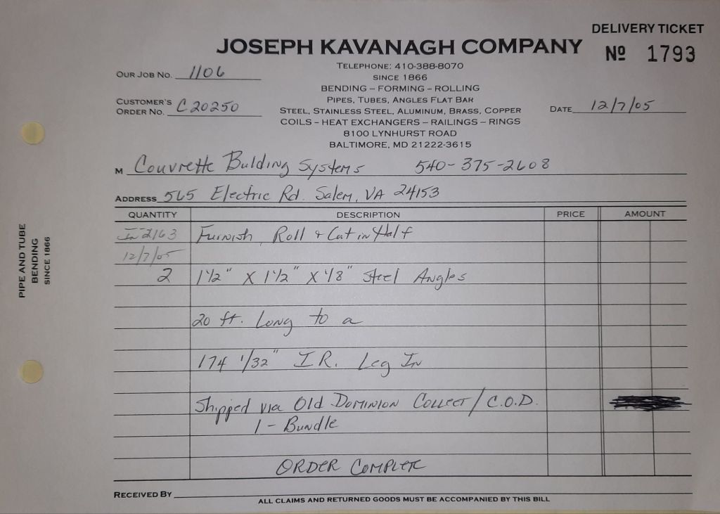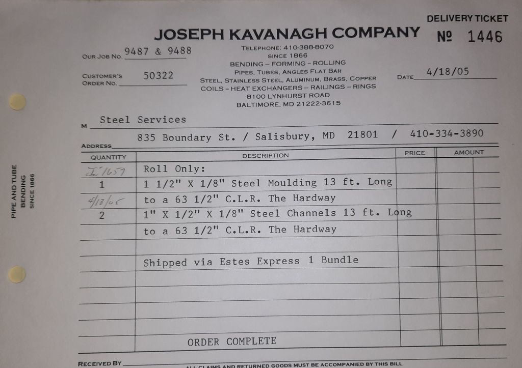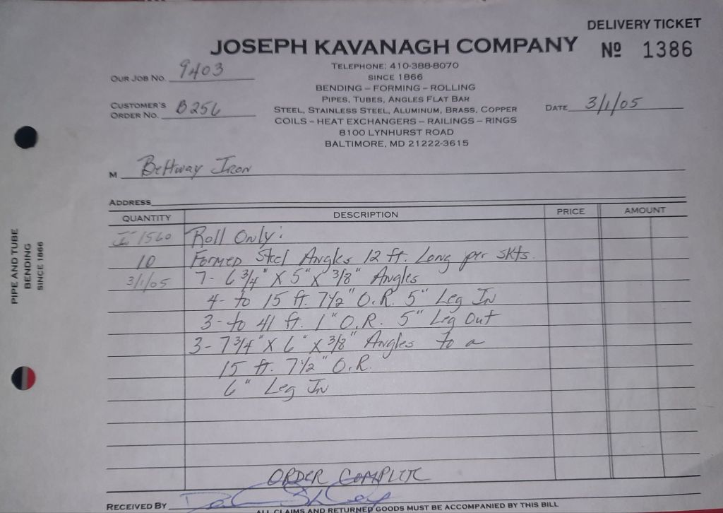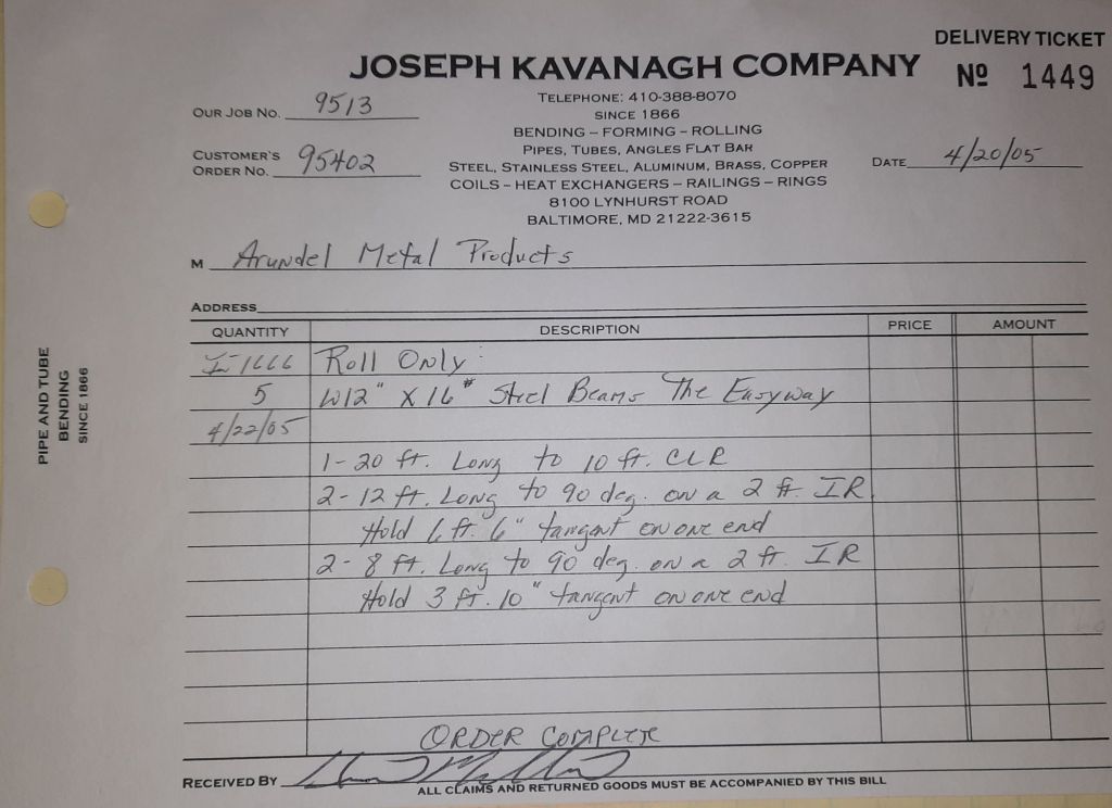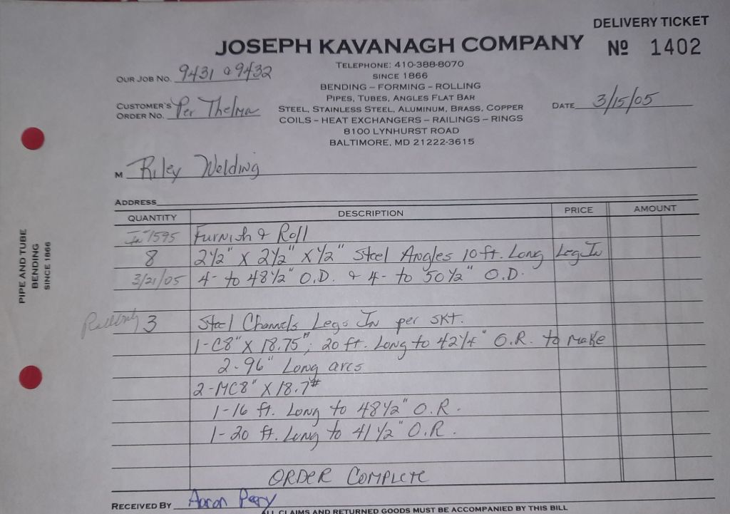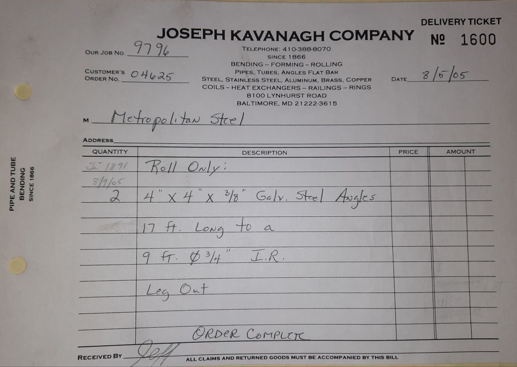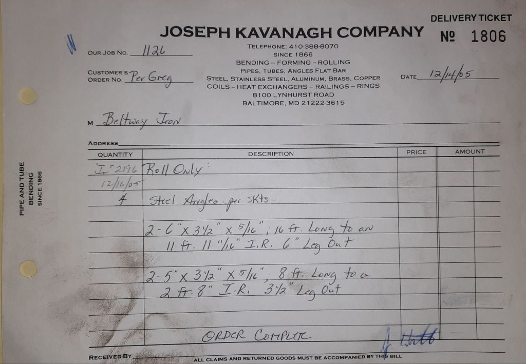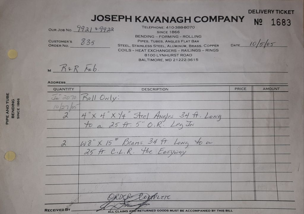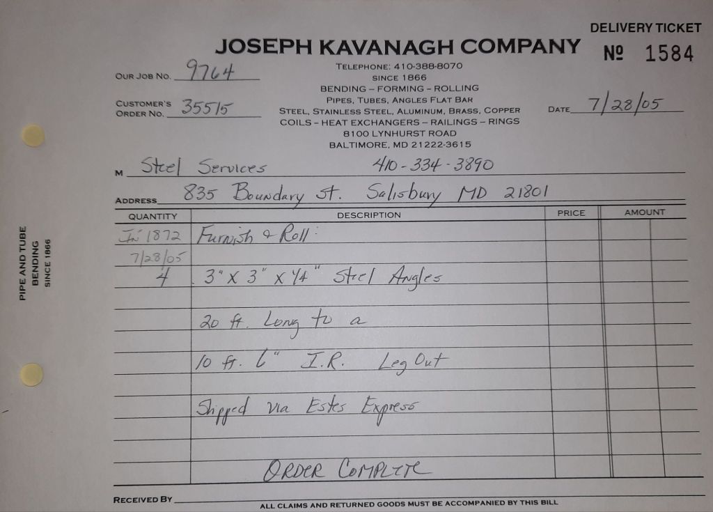Today is Friday. The day most working people wait for patiently. That’s true for Kavanagh’s and crew. We finish some small jobs today including some formed angles for Beltway Iron. Formed means they are bent from plate and not made in a steel mill. A press brake is used to fold over the plate into an angle. It’s always challenging to roll these because they are thinner than mill angles and more irregular. Still, these work out fine. I finish filling out some delivery tickets and it’s time for everyone to head home.