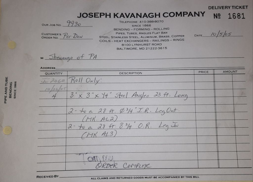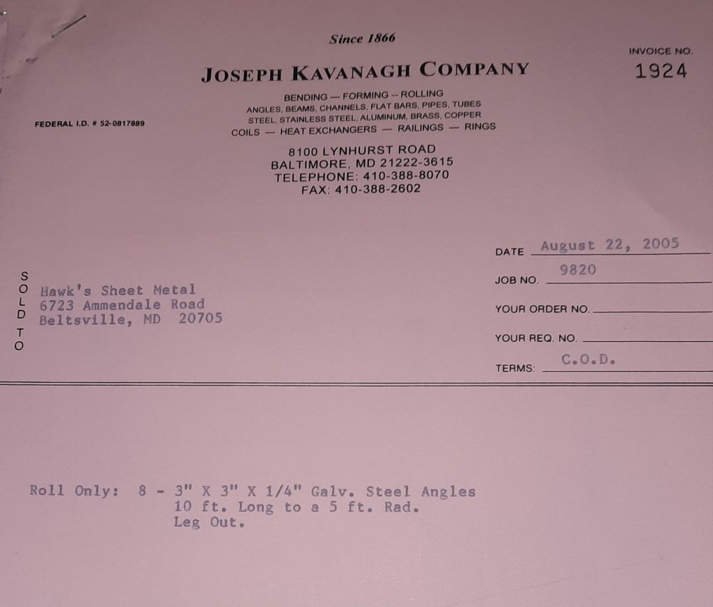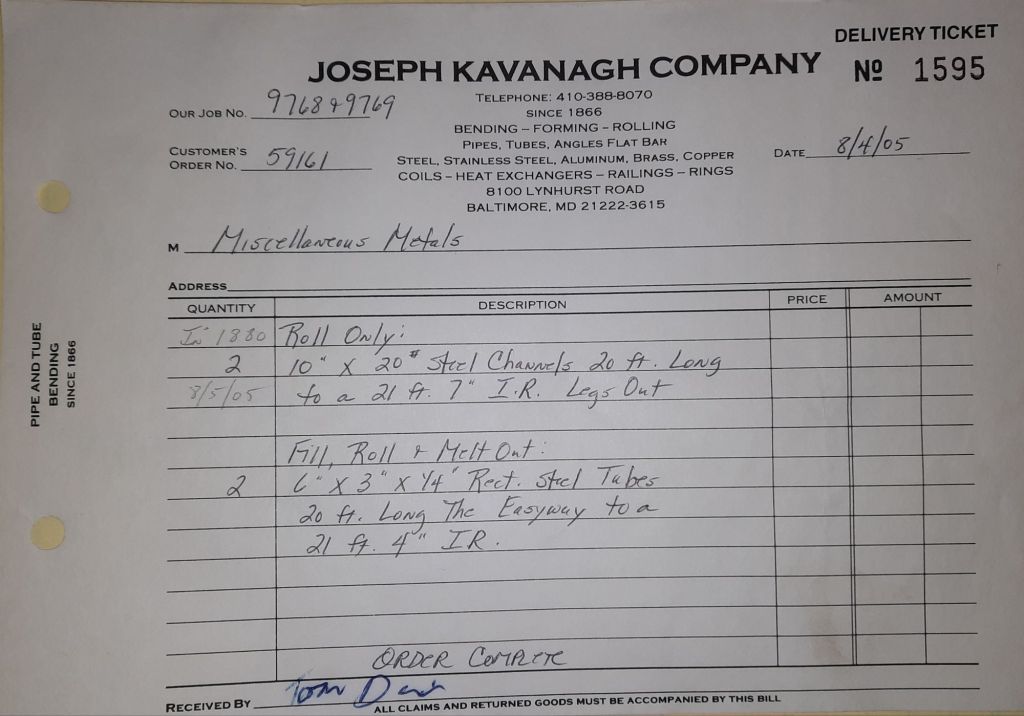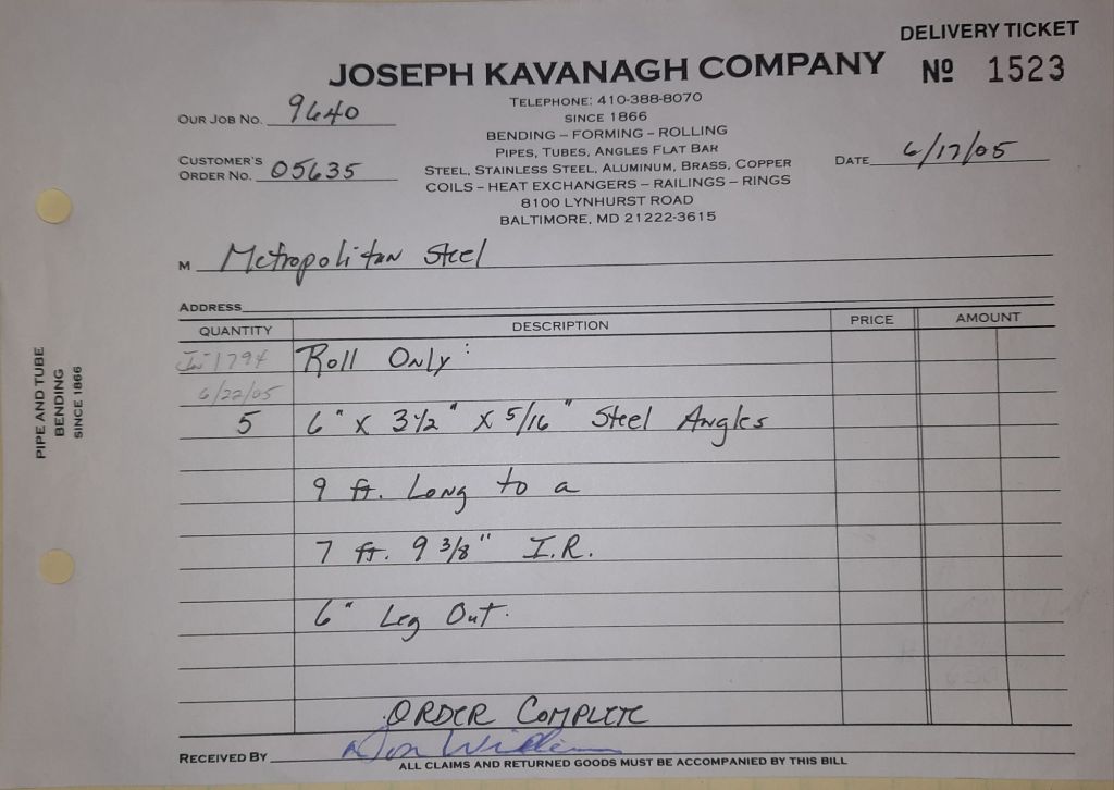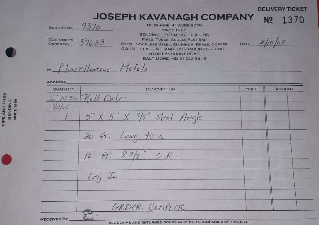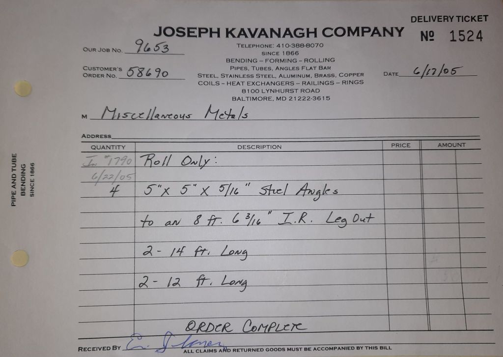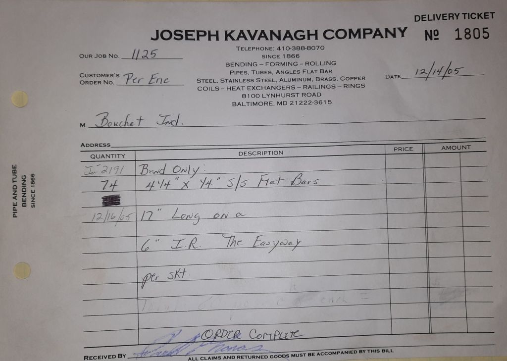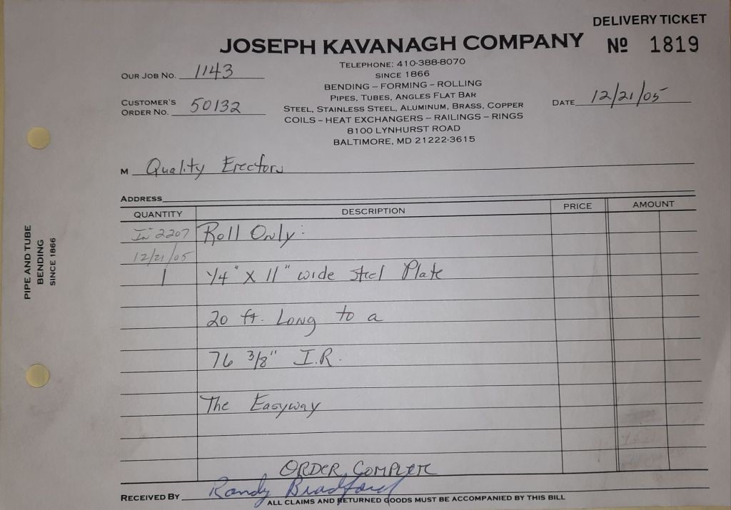 Today is Friday. The day most working people wait for patiently. That’s true for Kavanagh’s and crew. We finish some small jobs today including some formed angles for Beltway Iron. Formed means they are bent from plate and not made in a steel mill. A press brake is used to fold over the plate into an angle. It’s always challenging to roll these because they are thinner than mill angles and more irregular. Still, these work out fine. I finish filling out some delivery tickets and it’s time for everyone to head home.