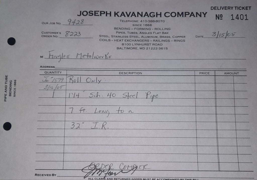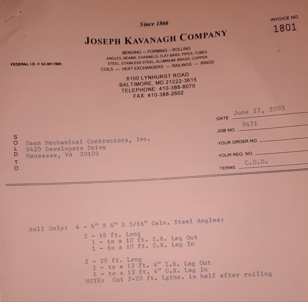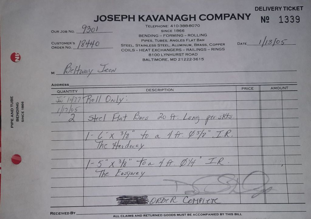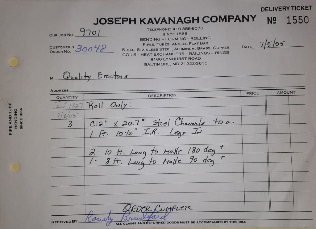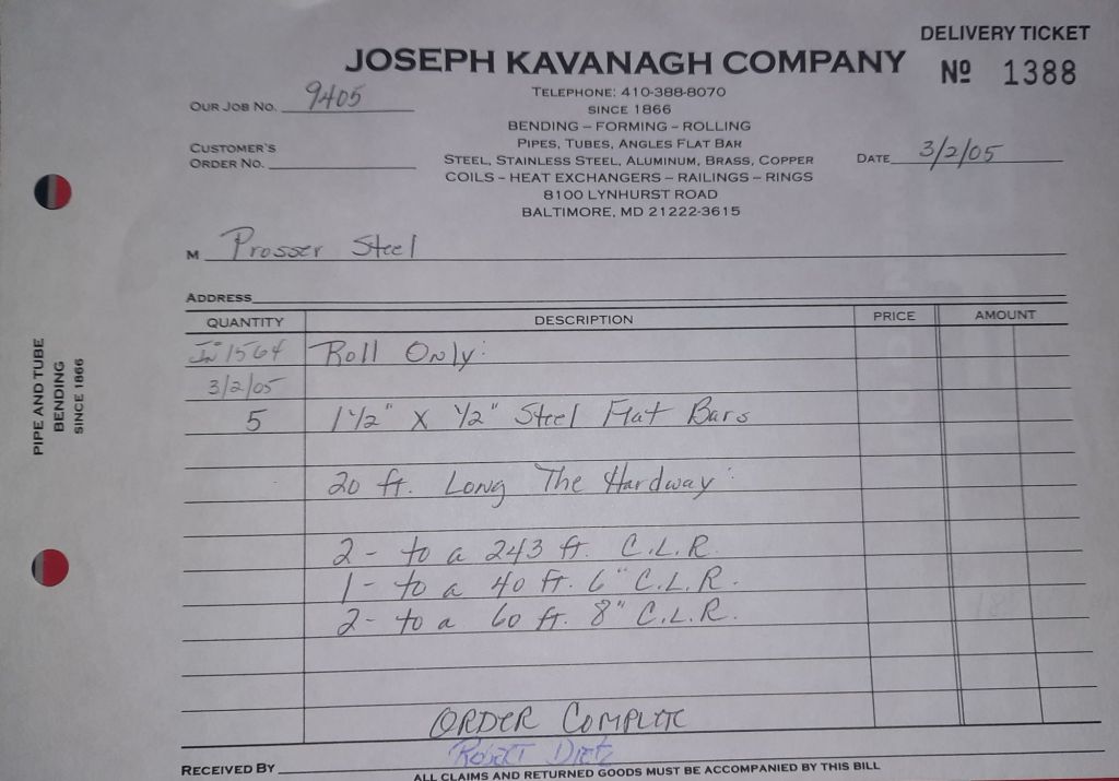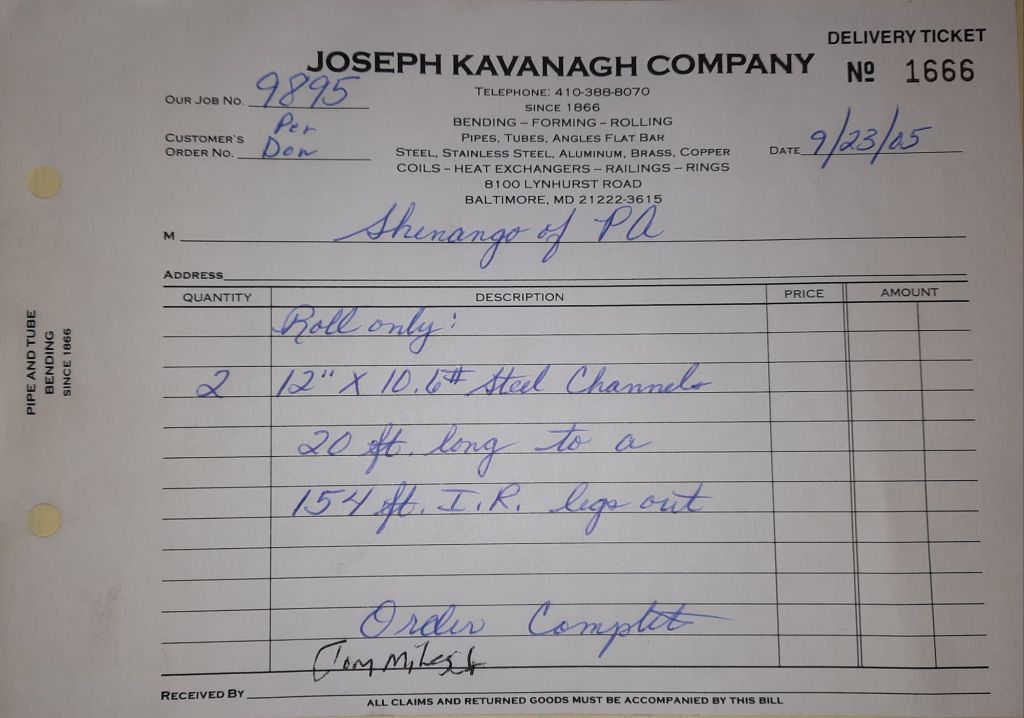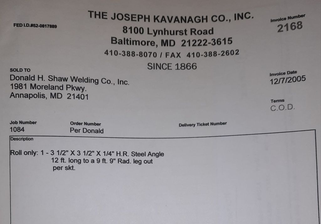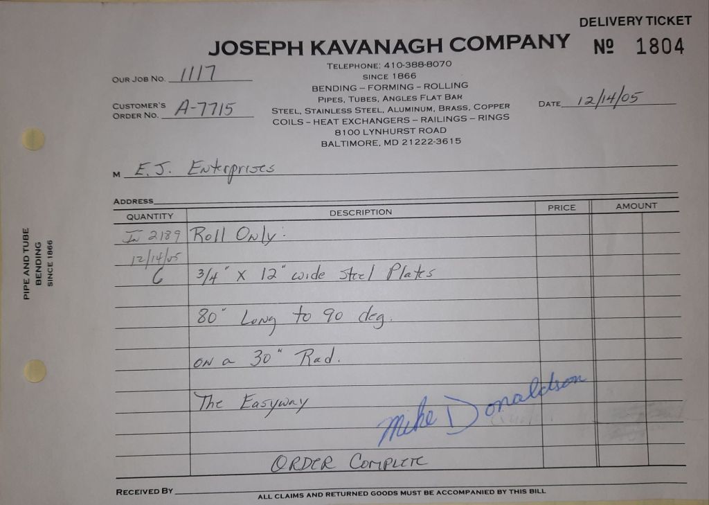 Today is Friday. The day most working people wait for patiently. That’s true for Kavanagh’s and crew. We finish some small jobs today including some formed angles for Beltway Iron. Formed means they are bent from plate and not made in a steel mill. A press brake is used to fold over the plate into an angle. It’s always challenging to roll these because they are thinner than mill angles and more irregular. Still, these work out fine. I finish filling out some delivery tickets and it’s time for everyone to head home.