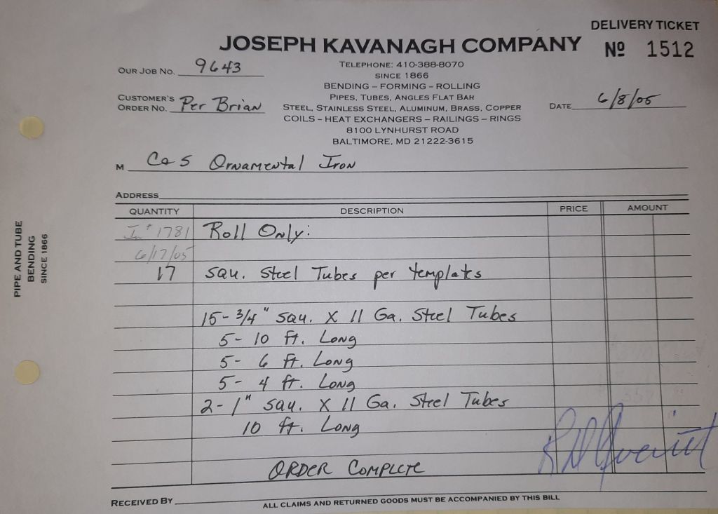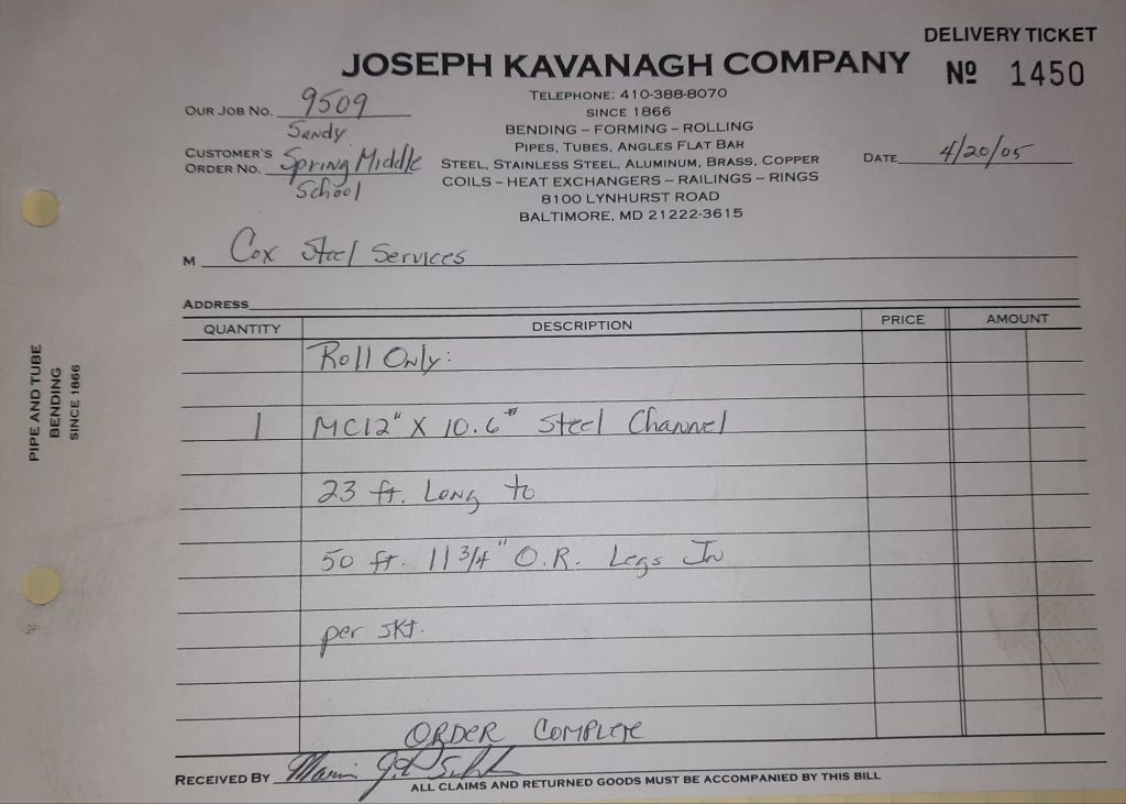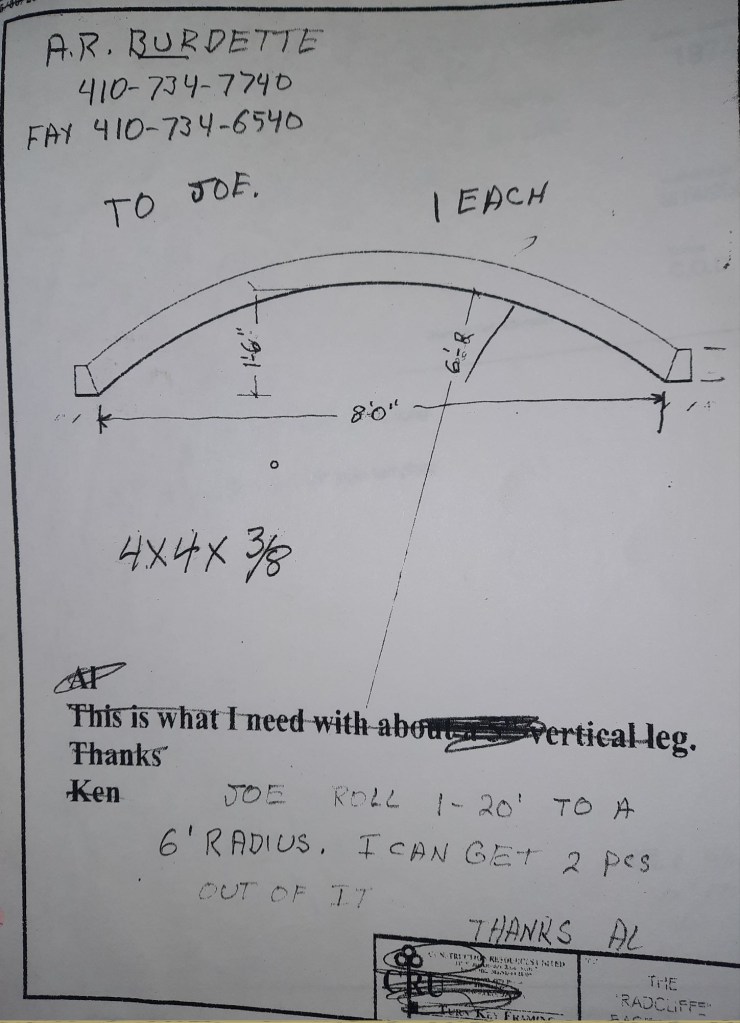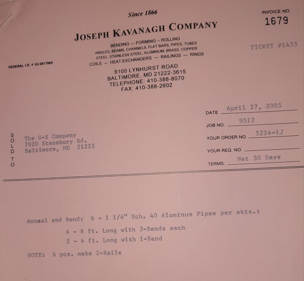 The Orioles are off to a great start at 13 – 7 and baseball is the talk of the Shop. We talk about our Birds obviously, but I also mention to Jack and Ann that I am going to look for any baseball programs for kids like Joe. He’s seven and I’m hoping there might be something for him. He wouldn’t be able to play in a typical T-ball league. It’s just not possible but I’m going to find something. I make calls and scan the internet. While I do that, the guys are working on some railings, some fancy brass tubes and a structural channel for a repair to Sandy Spring Middle School.