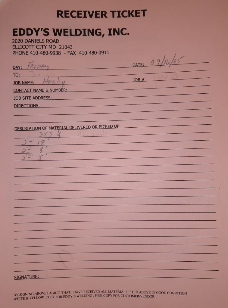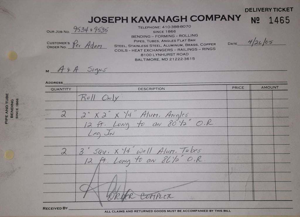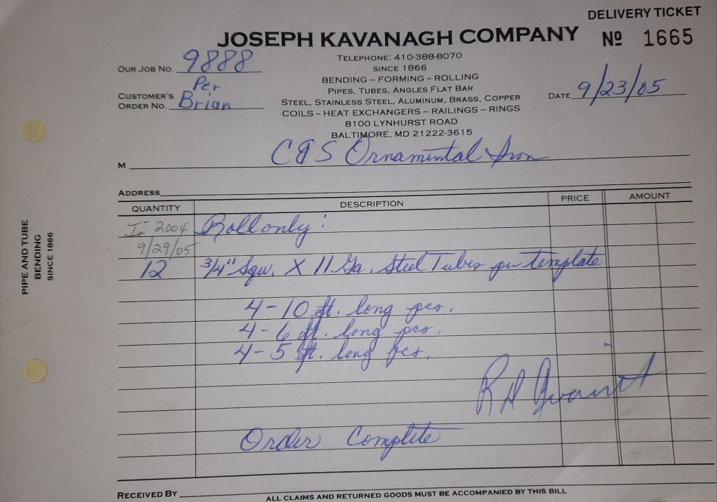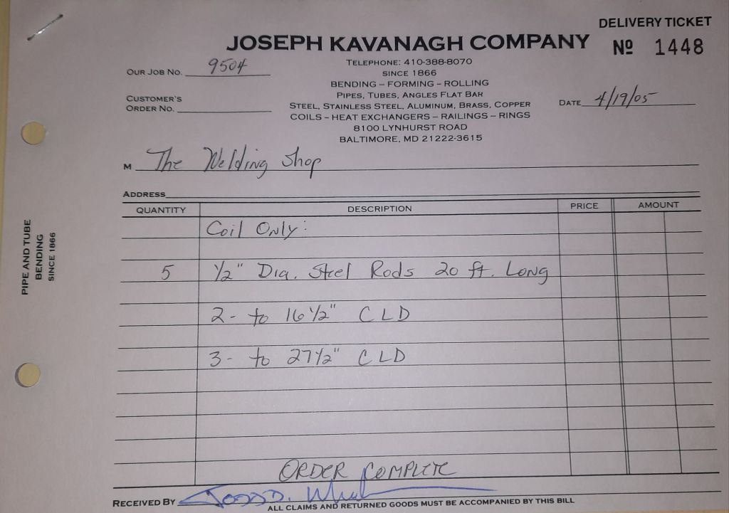 The Orioles are off to a great start at 13 – 7 and baseball is the talk of the Shop. We talk about our Birds obviously, but I also mention to Jack and Ann that I am going to look for any baseball programs for kids like Joe. He’s seven and I’m hoping there might be something for him. He wouldn’t be able to play in a typical T-ball league. It’s just not possible but I’m going to find something. I make calls and scan the internet. While I do that, the guys are working on some railings, some fancy brass tubes and a structural channel for a repair to Sandy Spring Middle School.
