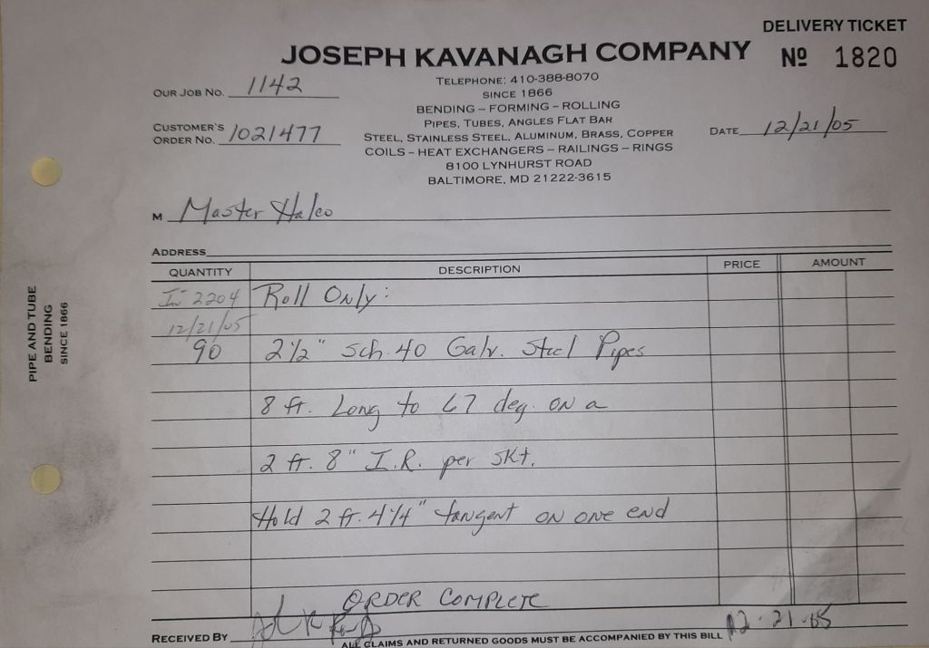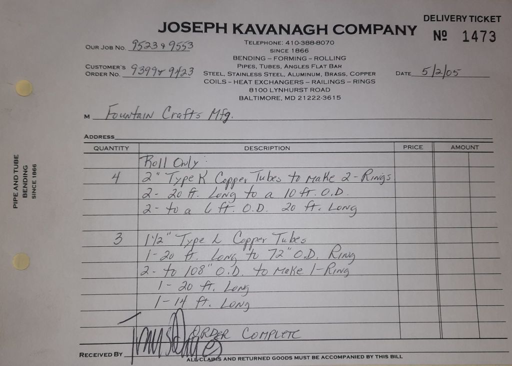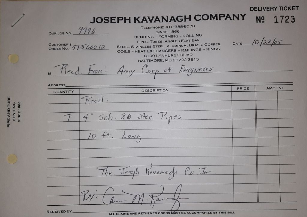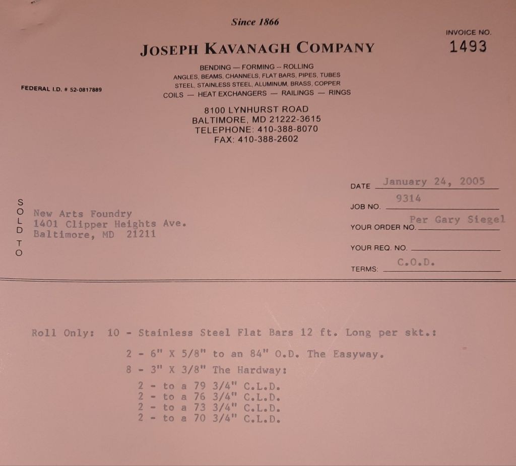 It’s Halloween and I look forward to taking my boys trick or treating after work. In the Shop, jobs are completed for our neighbors down the Boulevard, B and B Welding and one of our sculptor friends, David Hess. We also received some pipes for the Army Corps of Engineers this week. These are for some work on the Washington Aqueduct to be done next month.