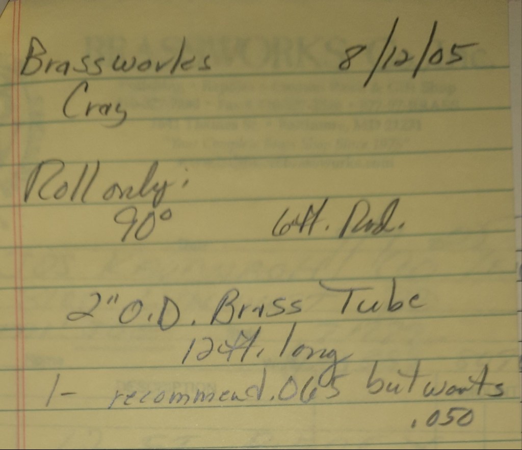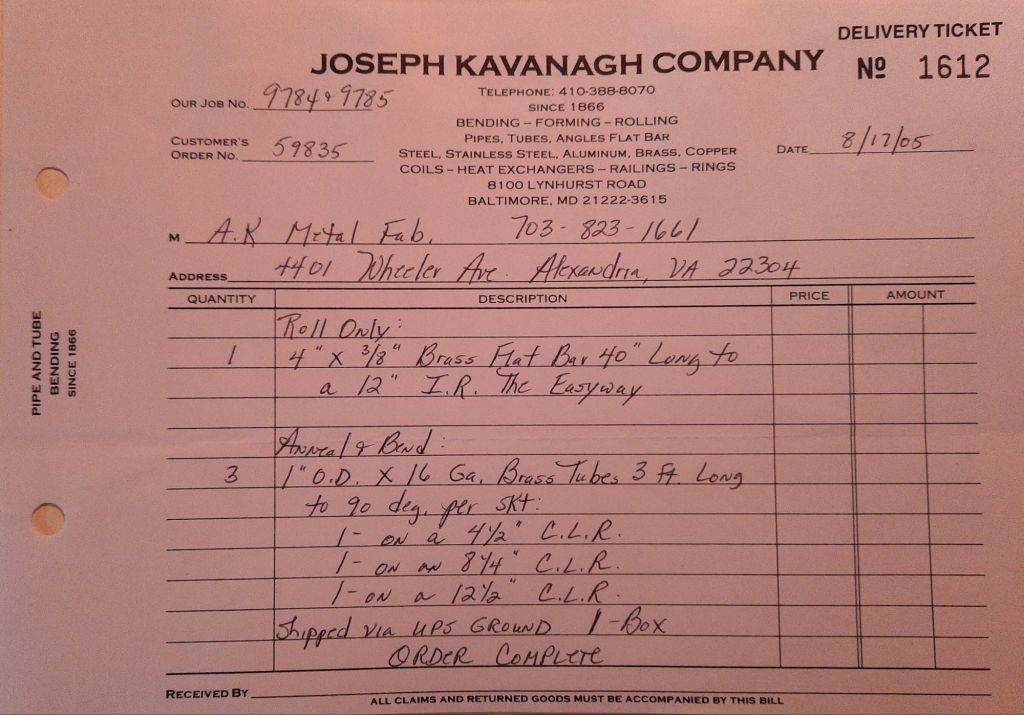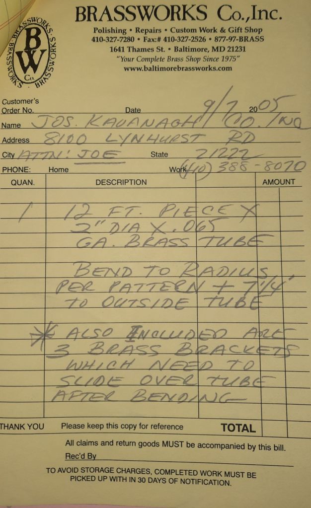 It’s a warm Friday on Lynhurst Road and I’m hoping it doesn’t rain tomorrow as predicted and cancel Joe’s soccer game. A cooling rain would be nice today because we have some tubes to fill with rosin which means torch work. We fill and melt out tubes under the porch in the back of the building. This is much better than in the building like at Central Avenue. It’s hot work but it doesn’t effect the whole Shop anymore. These tubes are for a sign job and we also roll some ornamental bars and a fancy brass foot rail for Brassworks.