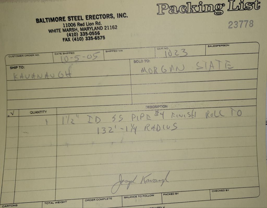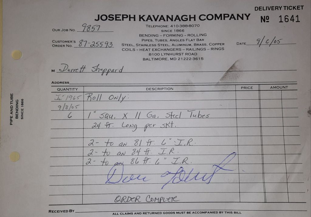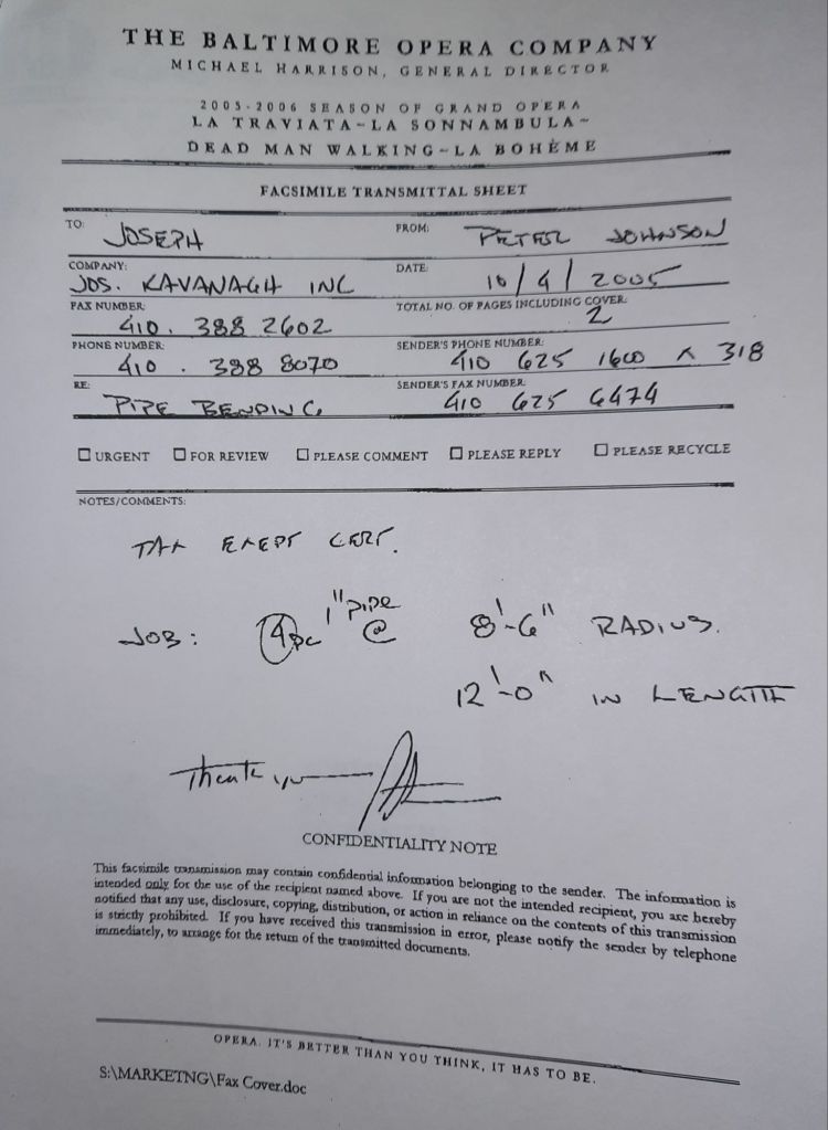 It’s looking like a rough year for Baltimore sports. The Orioles are going to finish under .500 and the Ravens have lost their first two games. They have a bye this week so maybe they can reset. There’s some grousing about the Ravens among the crew. They are bigger football fans than baseball fans. We bend some pipes for Fisher Theater today along with some angles for a Harley Davidson store and a few other small orders.