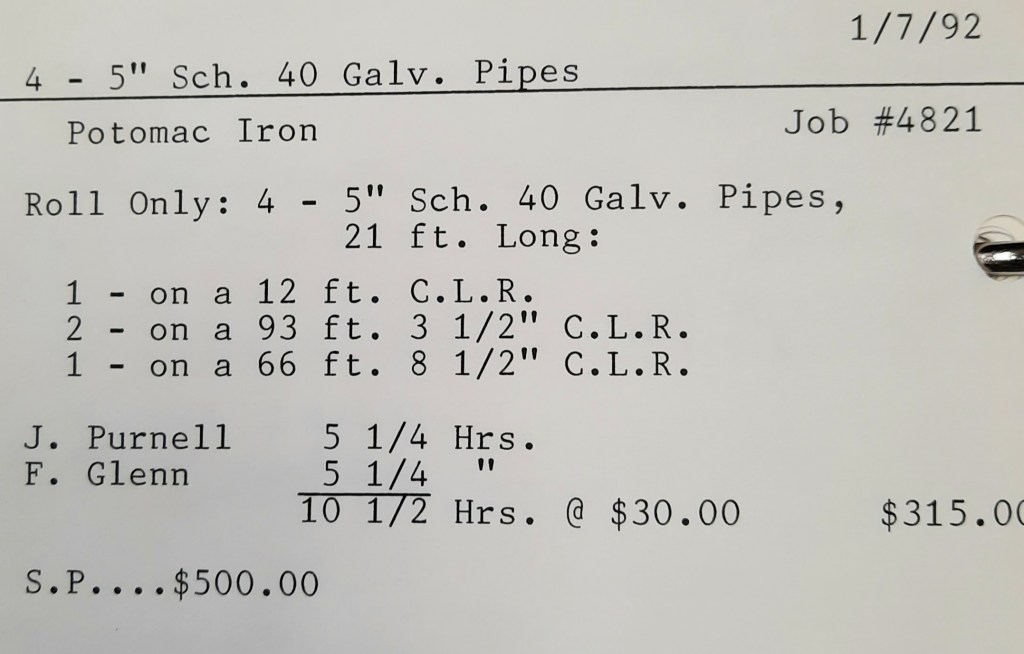 It is the start of a new year at the Joseph Kavanagh Company and a big change for me personally. I am buying a house on Charlesmont Road in Dundalk from my sister Jackie and her husband, Richard. Everything is agreed upon and we are settling at the end of next month. The Shop starts the year with a few things on the books including angles for Anderson Industrial Contracting, Ackerman and Baynes and Miscellaneous Metals. Today a 5” steel pipe we rolled for Potomac Iron is picked up and they drop off a large order of 3” angles to add to our schedule. There are enough pieces in the Potomac job to run two machines if necessary. This is a nice spot of work to start things off for us.