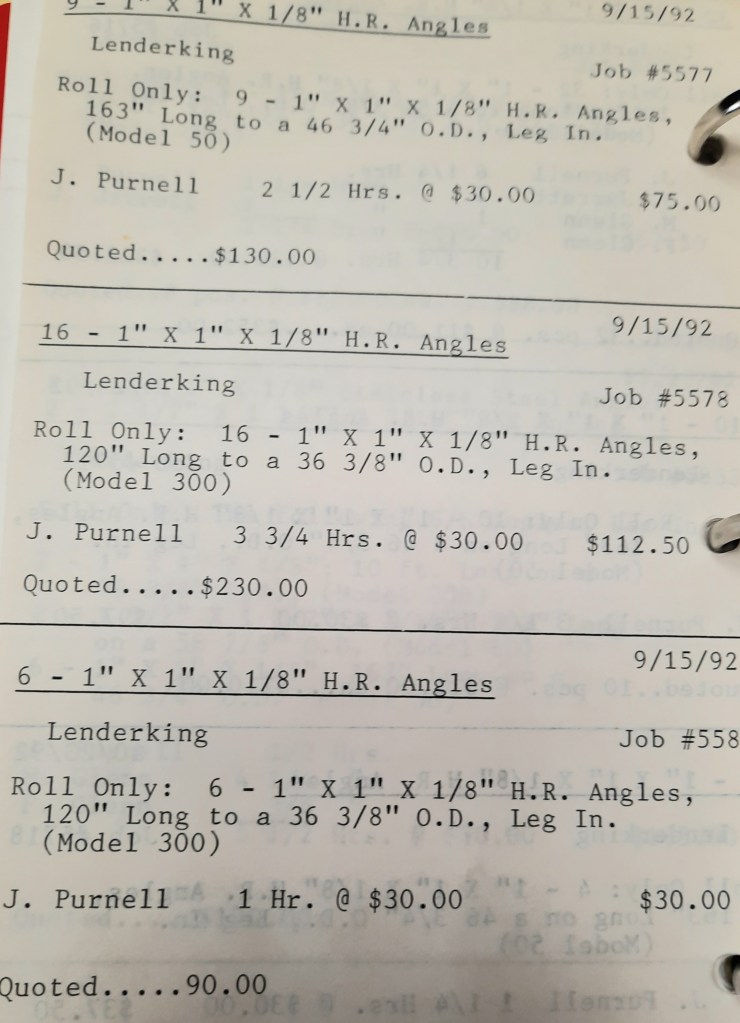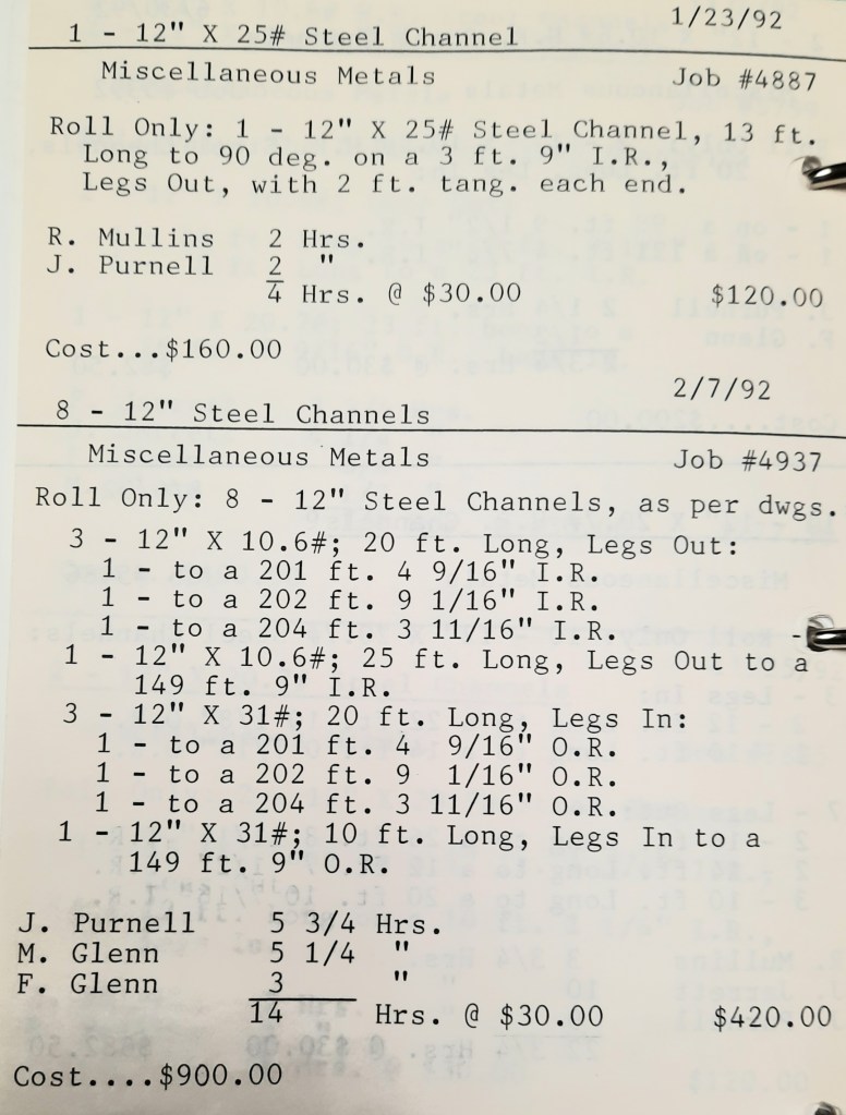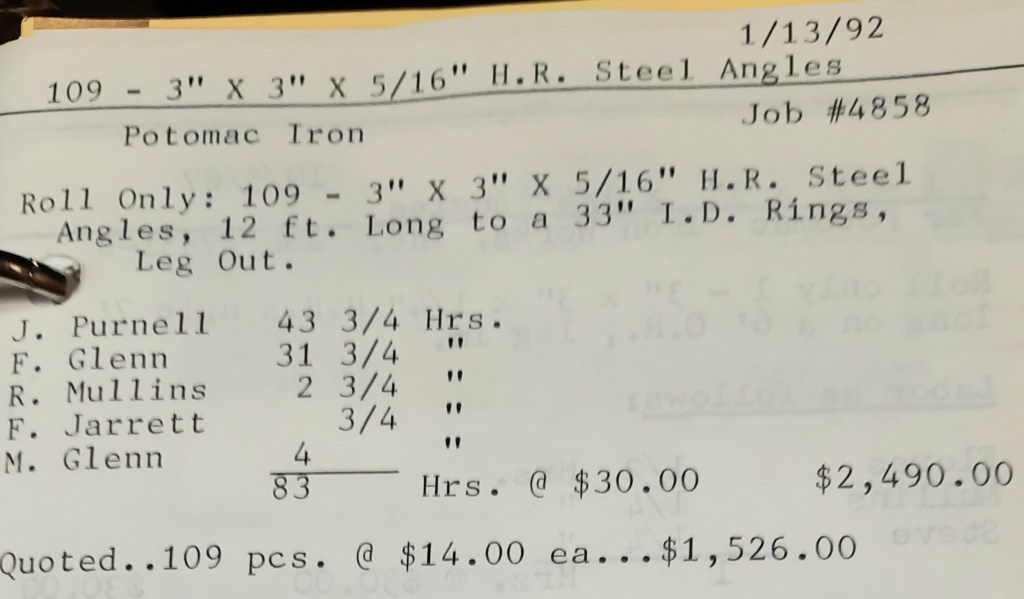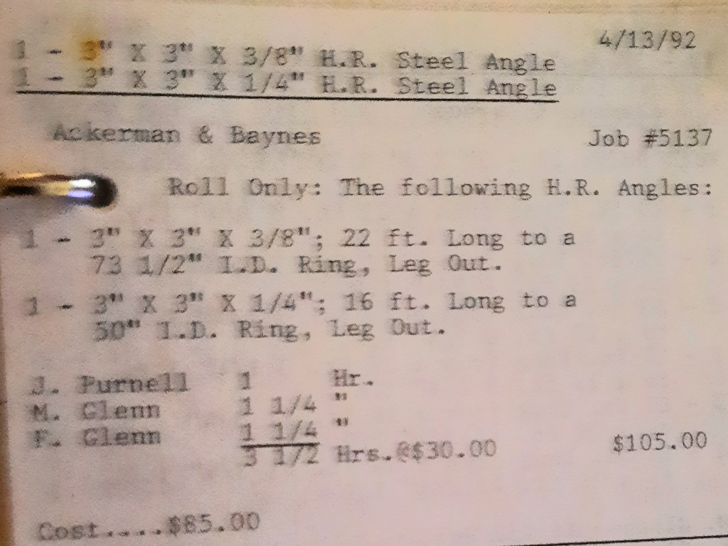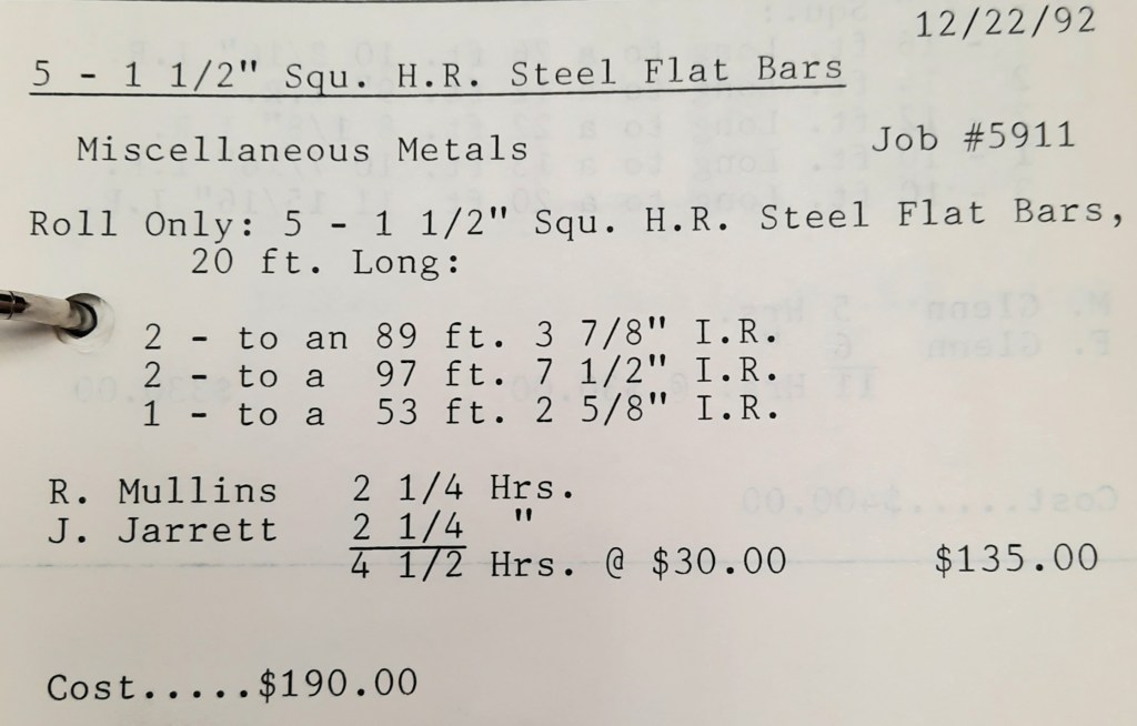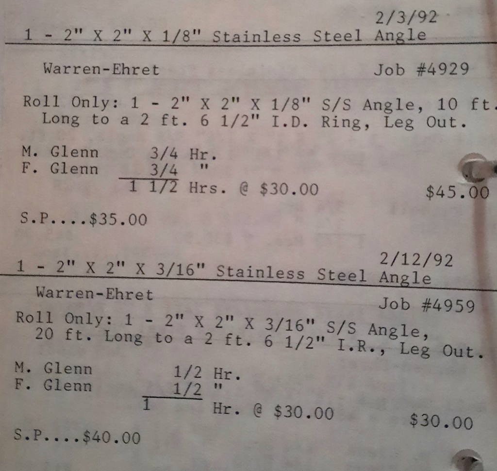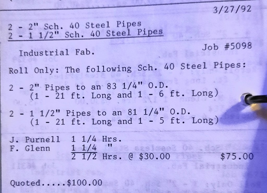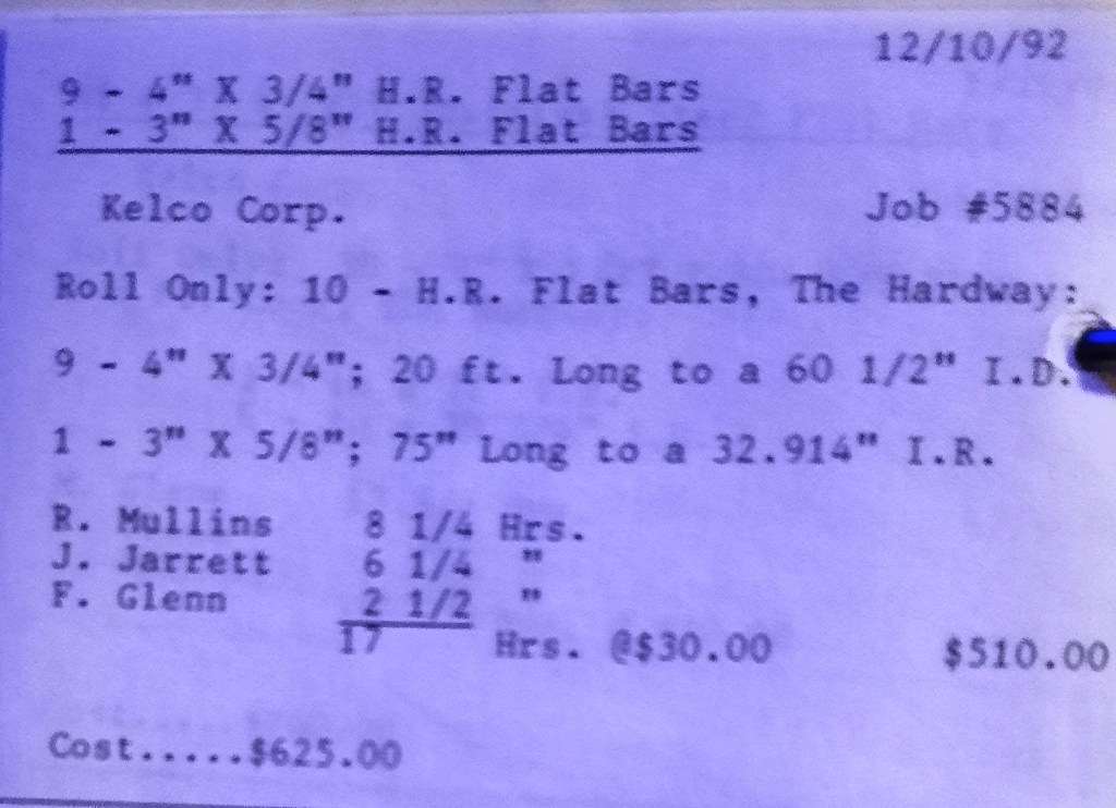 It’s mid September and the Orioles aren’t out of it yet. The Toronto Blue Jays and the Birds have battled most of the season for first but my Orioles are running out of time. I fold the newspaper up at my desk then head out to the Shop. We have three sets of angle rings for Lenderking Metal Products to finish by noon and another order for Miscellaneous Metals. Their work seems to have no end in sight. This one is for bars rolled into tight half-circles. When we are done with those, we have four pipes for Warren-Ehret to curve.