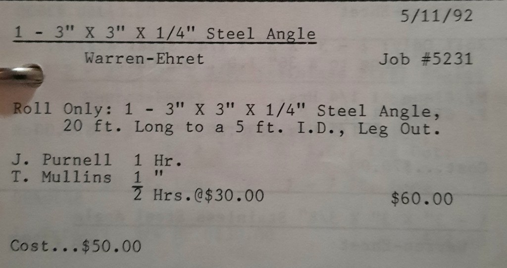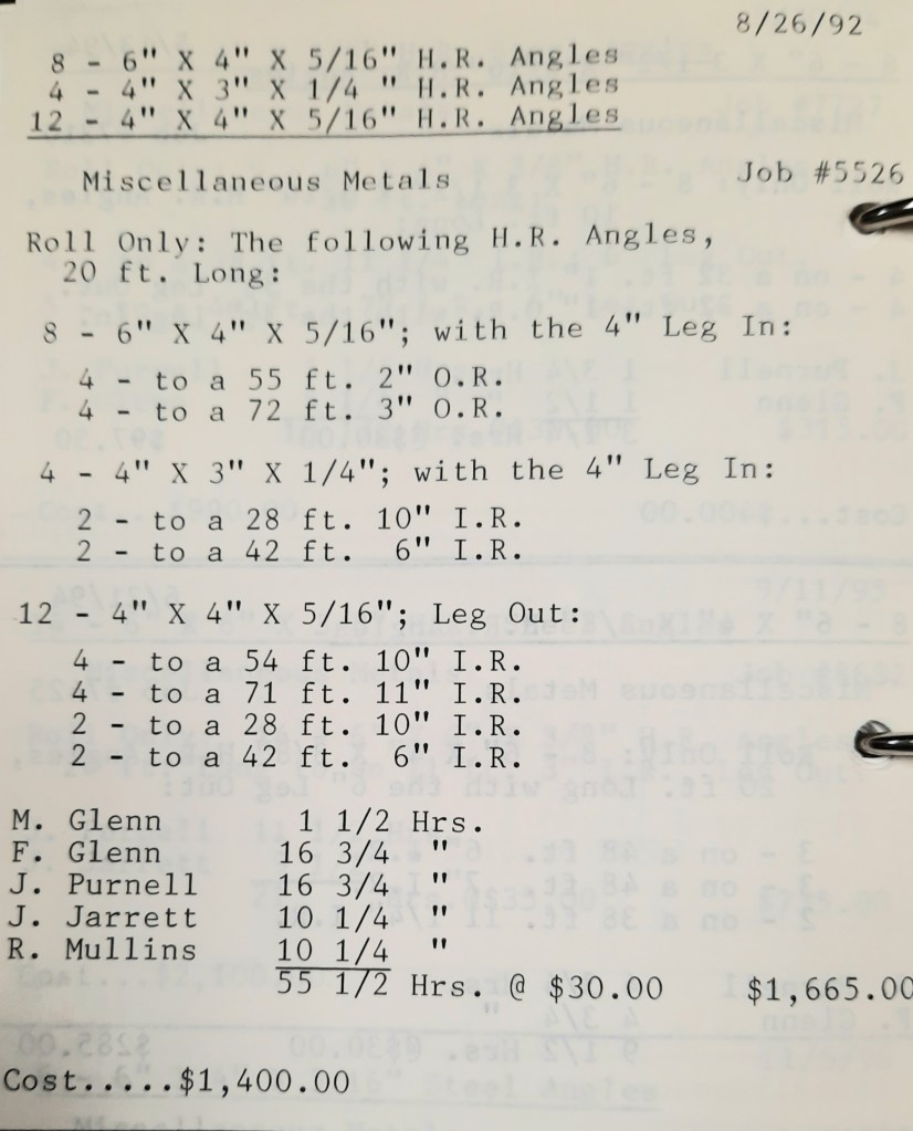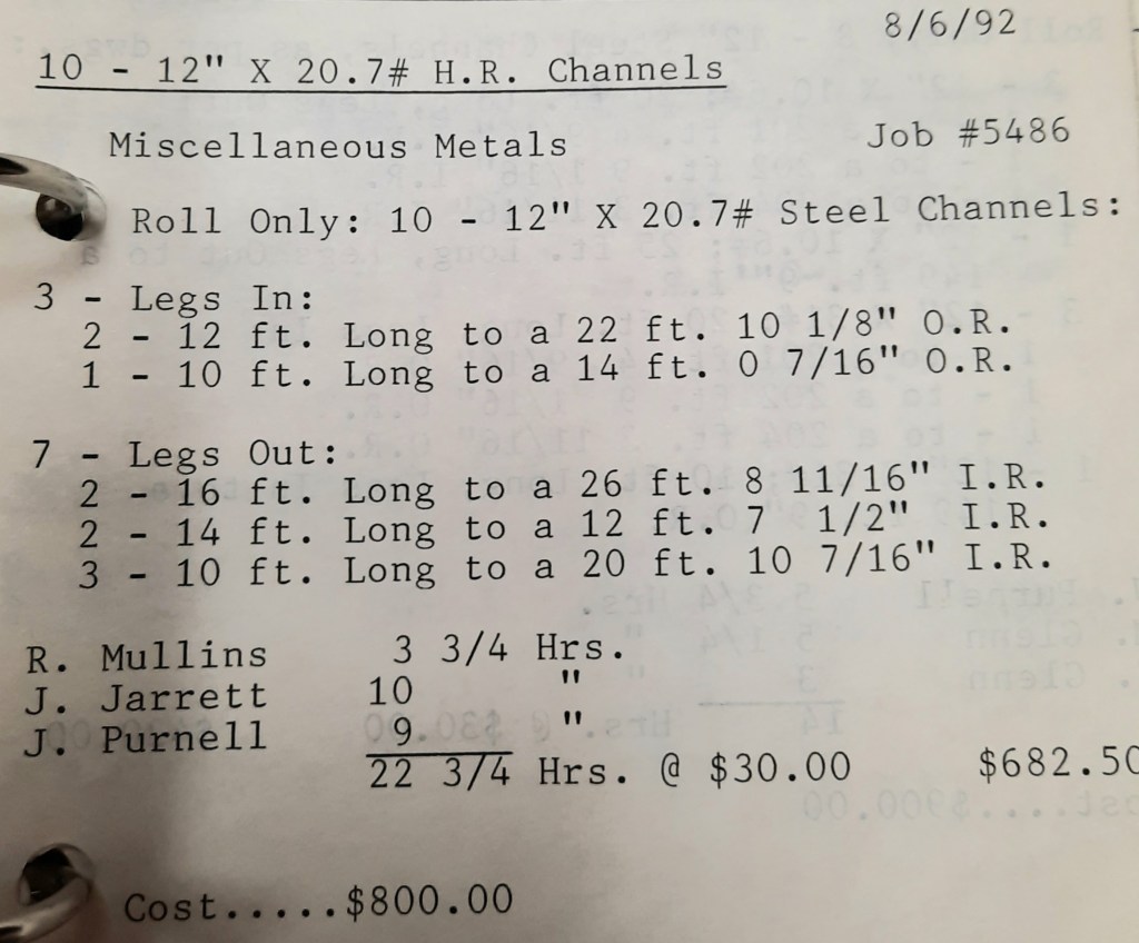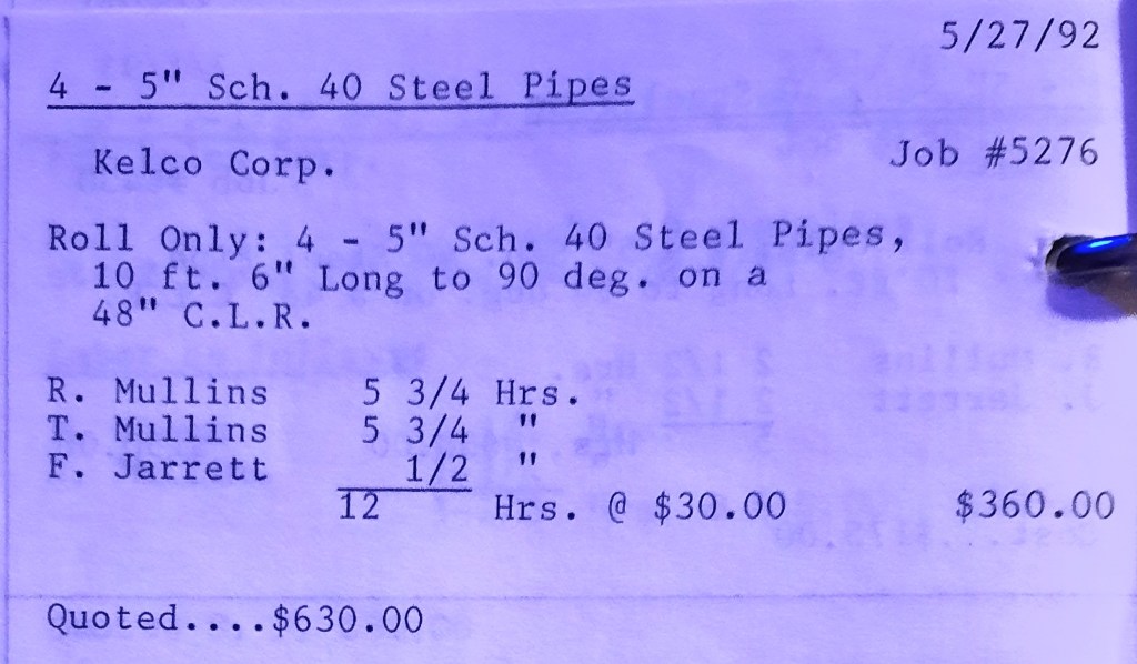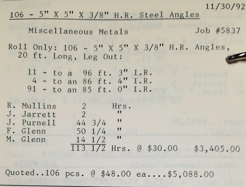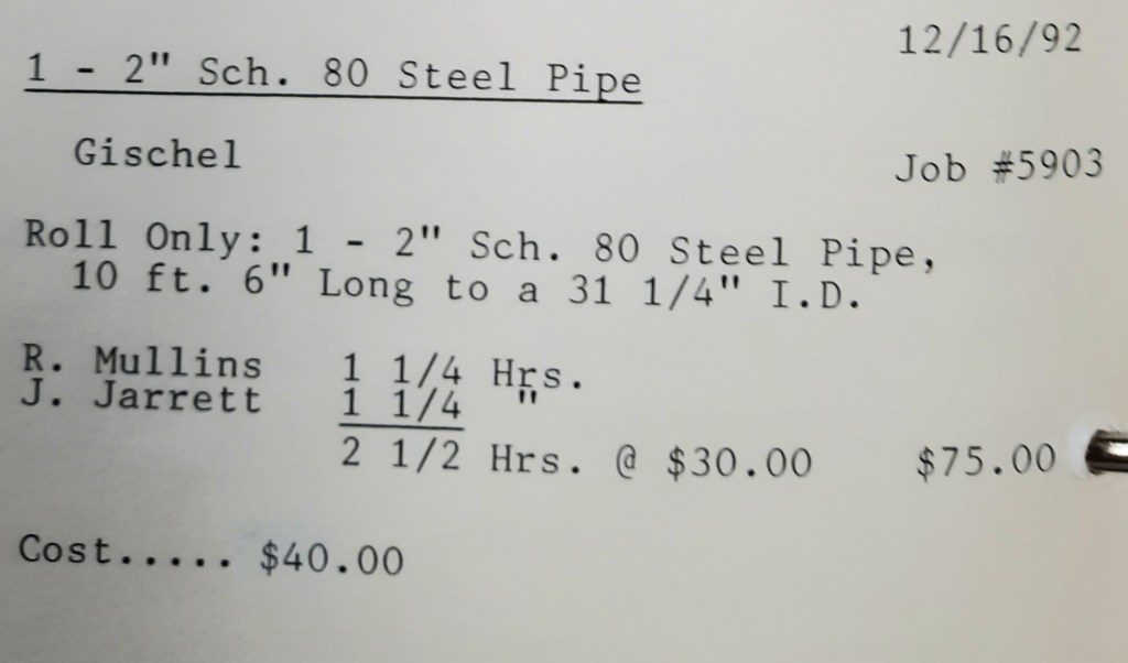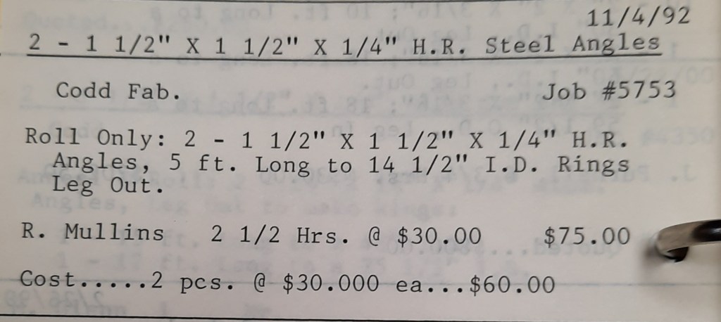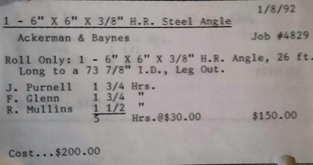 It’s mid September and the Orioles aren’t out of it yet. The Toronto Blue Jays and the Birds have battled most of the season for first but my Orioles are running out of time. I fold the newspaper up at my desk then head out to the Shop. We have three sets of angle rings for Lenderking Metal Products to finish by noon and another order for Miscellaneous Metals. Their work seems to have no end in sight. This one is for bars rolled into tight half-circles. When we are done with those, we have four pipes for Warren-Ehret to curve.