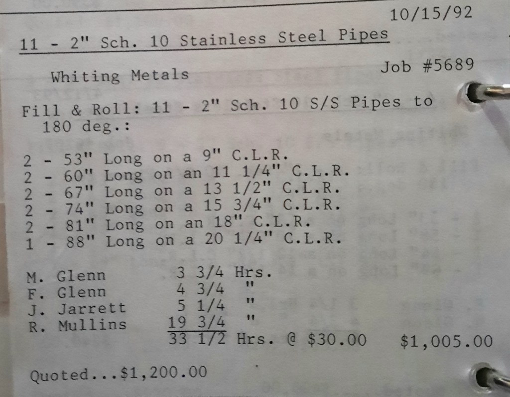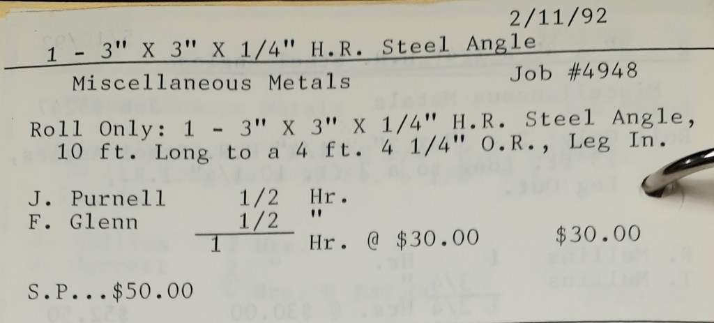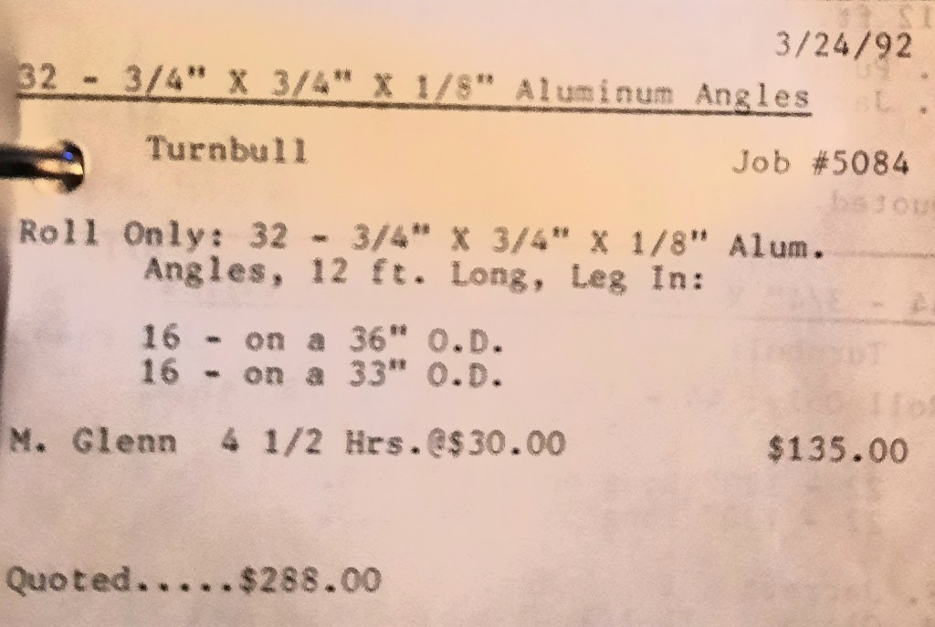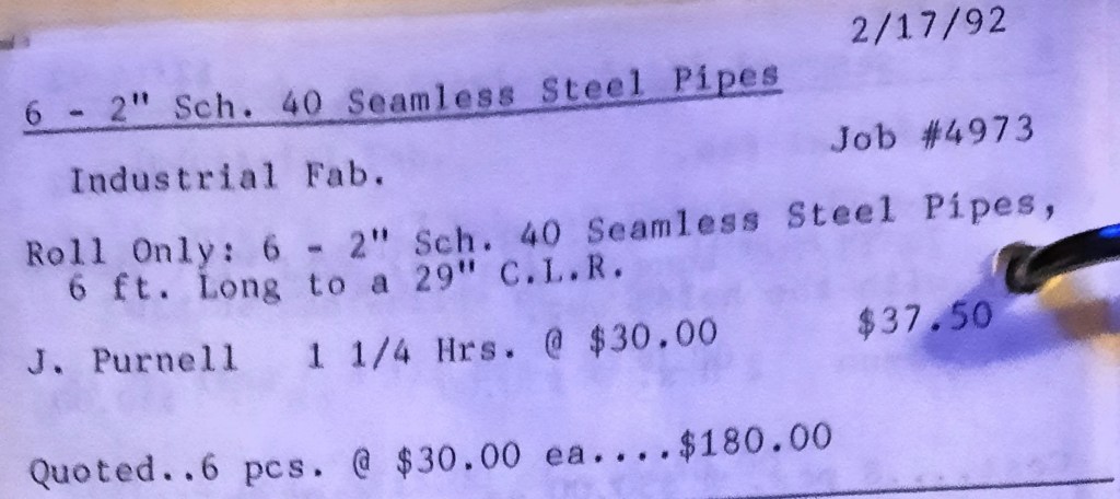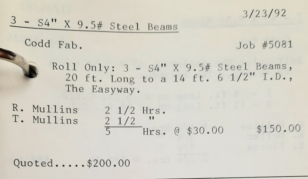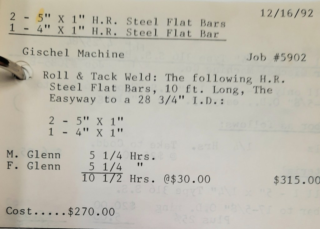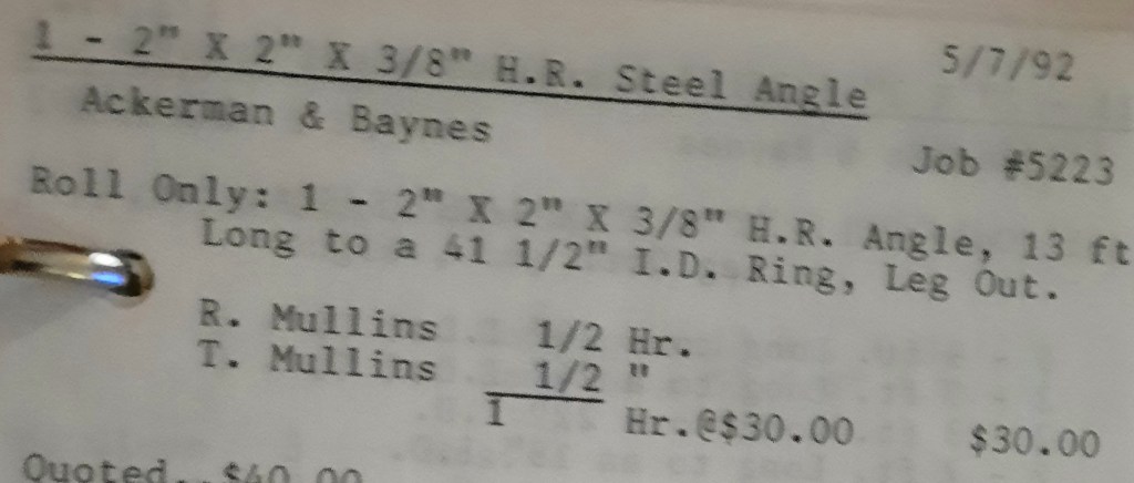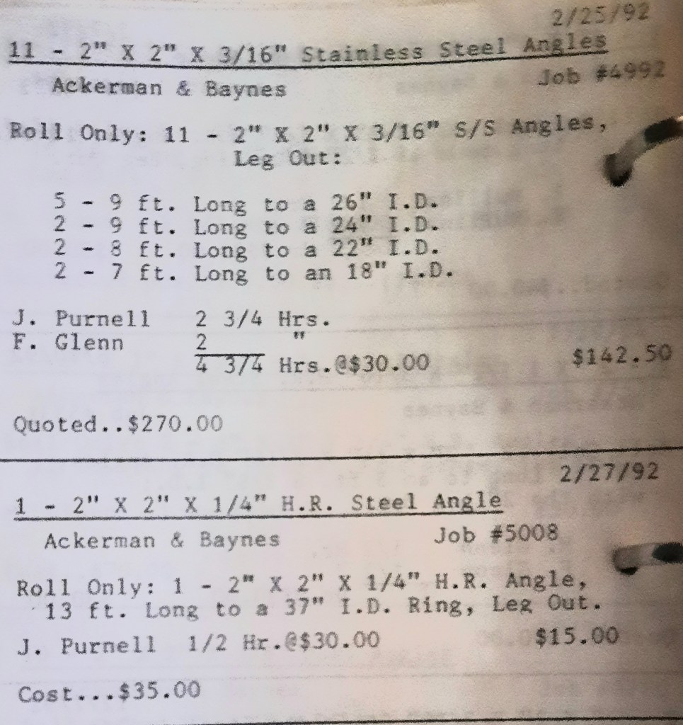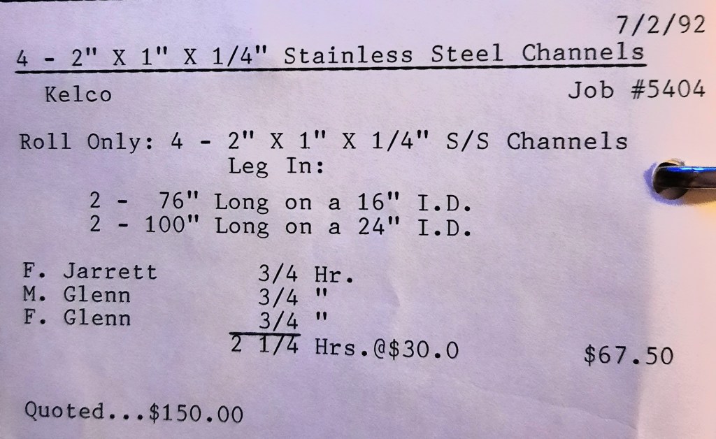 It’s mid September and the Orioles aren’t out of it yet. The Toronto Blue Jays and the Birds have battled most of the season for first but my Orioles are running out of time. I fold the newspaper up at my desk then head out to the Shop. We have three sets of angle rings for Lenderking Metal Products to finish by noon and another order for Miscellaneous Metals. Their work seems to have no end in sight. This one is for bars rolled into tight half-circles. When we are done with those, we have four pipes for Warren-Ehret to curve.