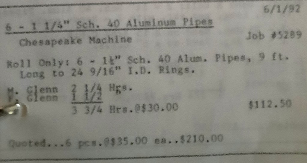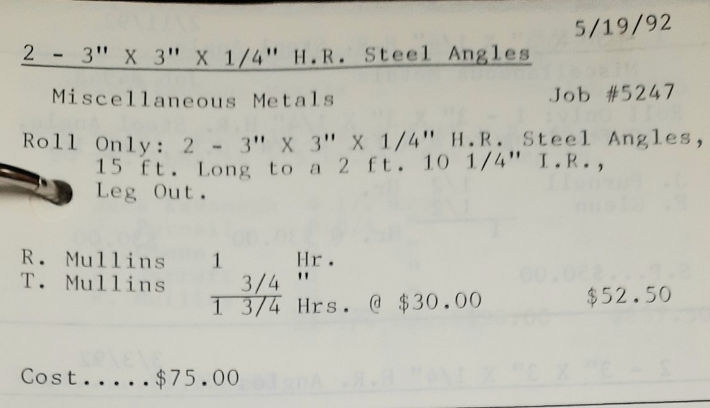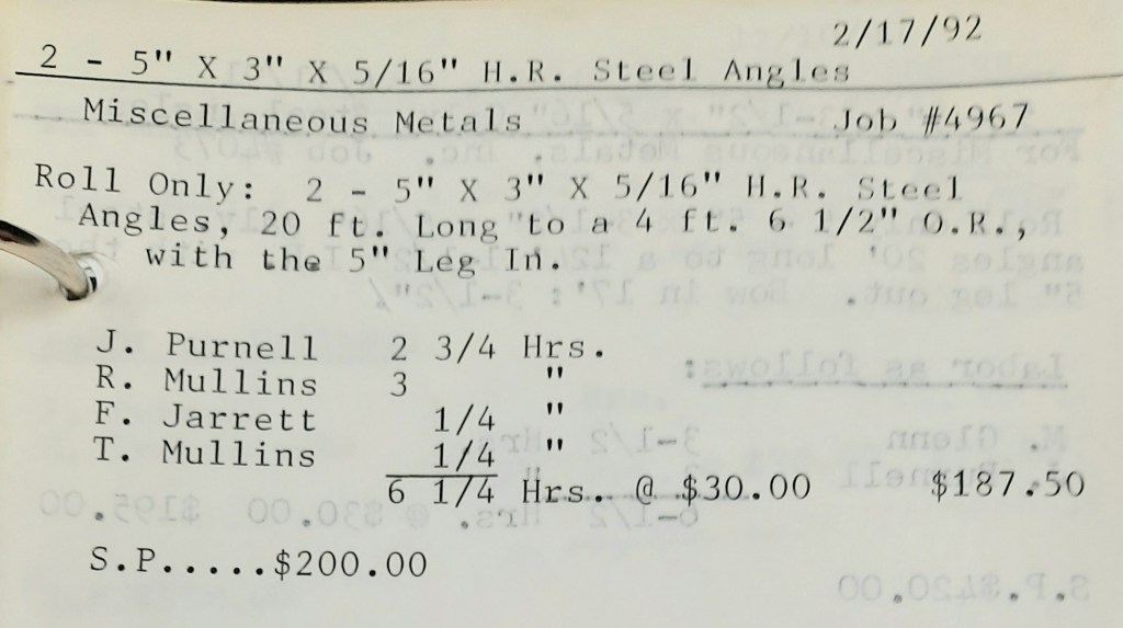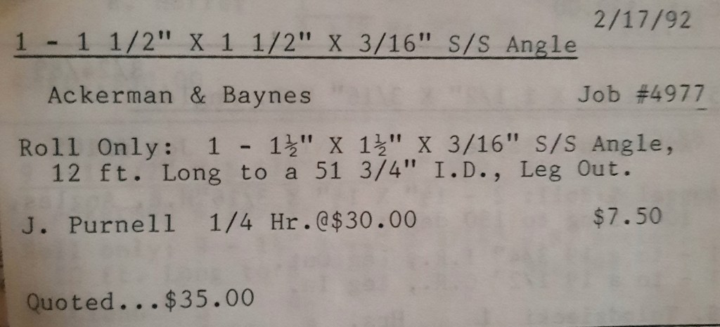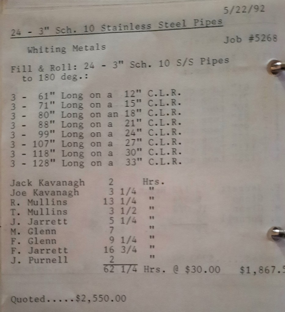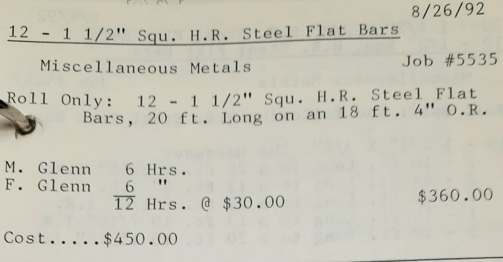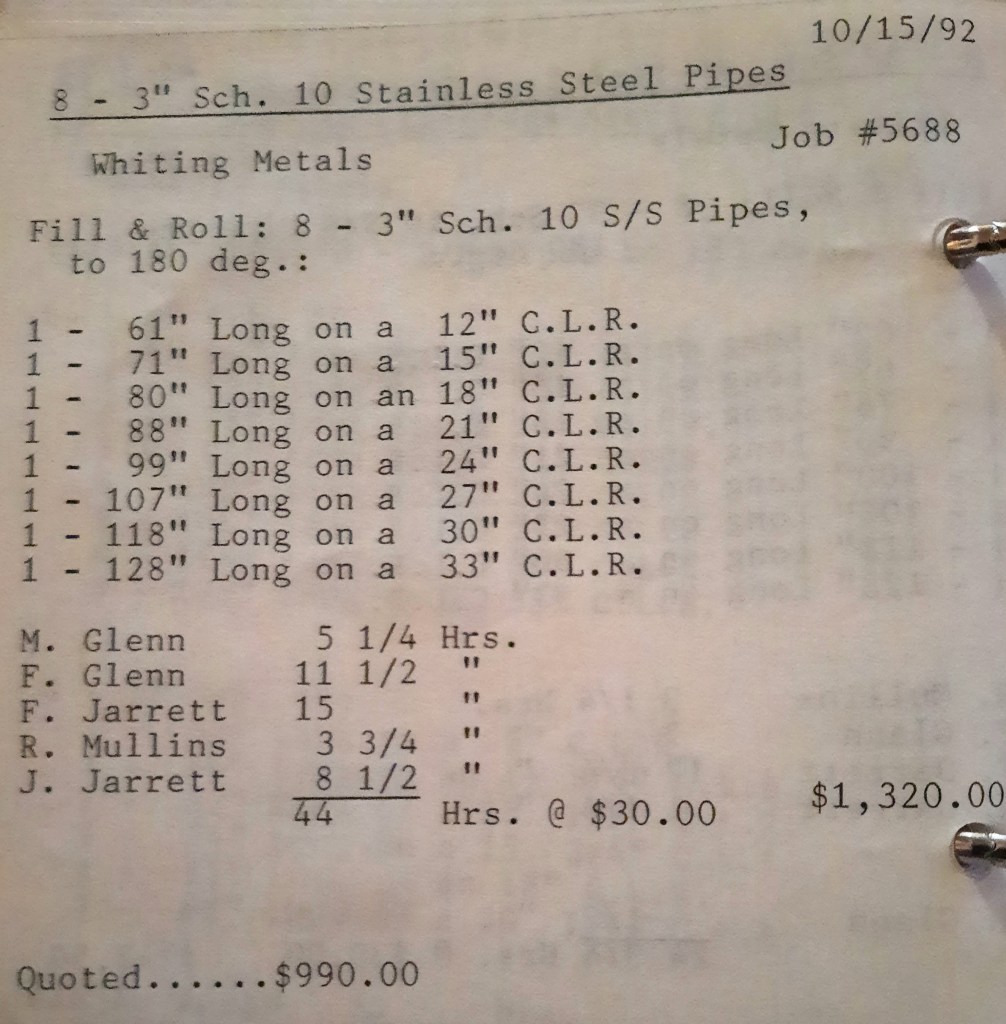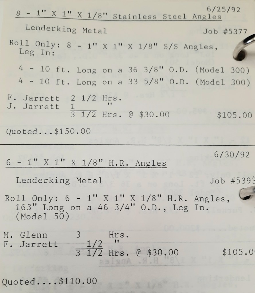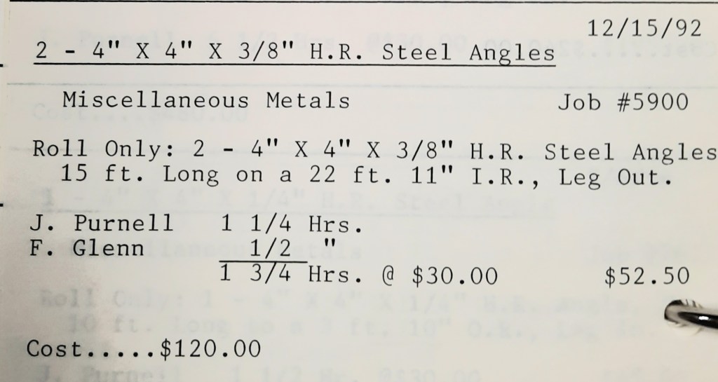It’s mid September and the Orioles aren’t out of it yet. The Toronto Blue Jays and the Birds have battled most of the season for first but my Orioles are running out of time. I fold the newspaper up at my desk then head out to the Shop. We have three sets of angle rings for Lenderking Metal Products to finish by noon and another order for Miscellaneous Metals. Their work seems to have no end in sight. This one is for bars rolled into tight half-circles. When we are done with those, we have four pipes for Warren-Ehret to curve.