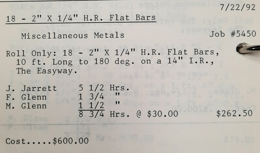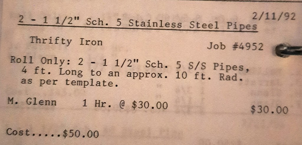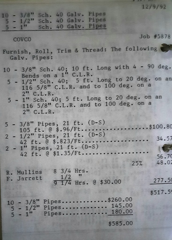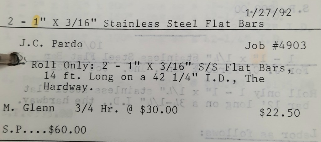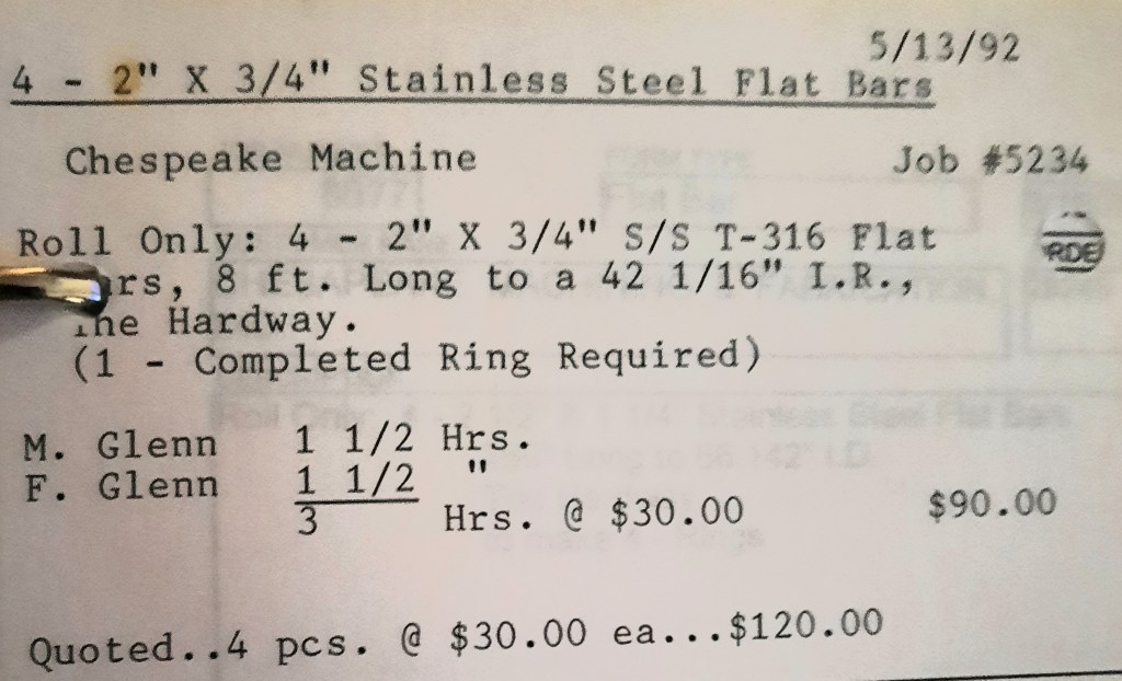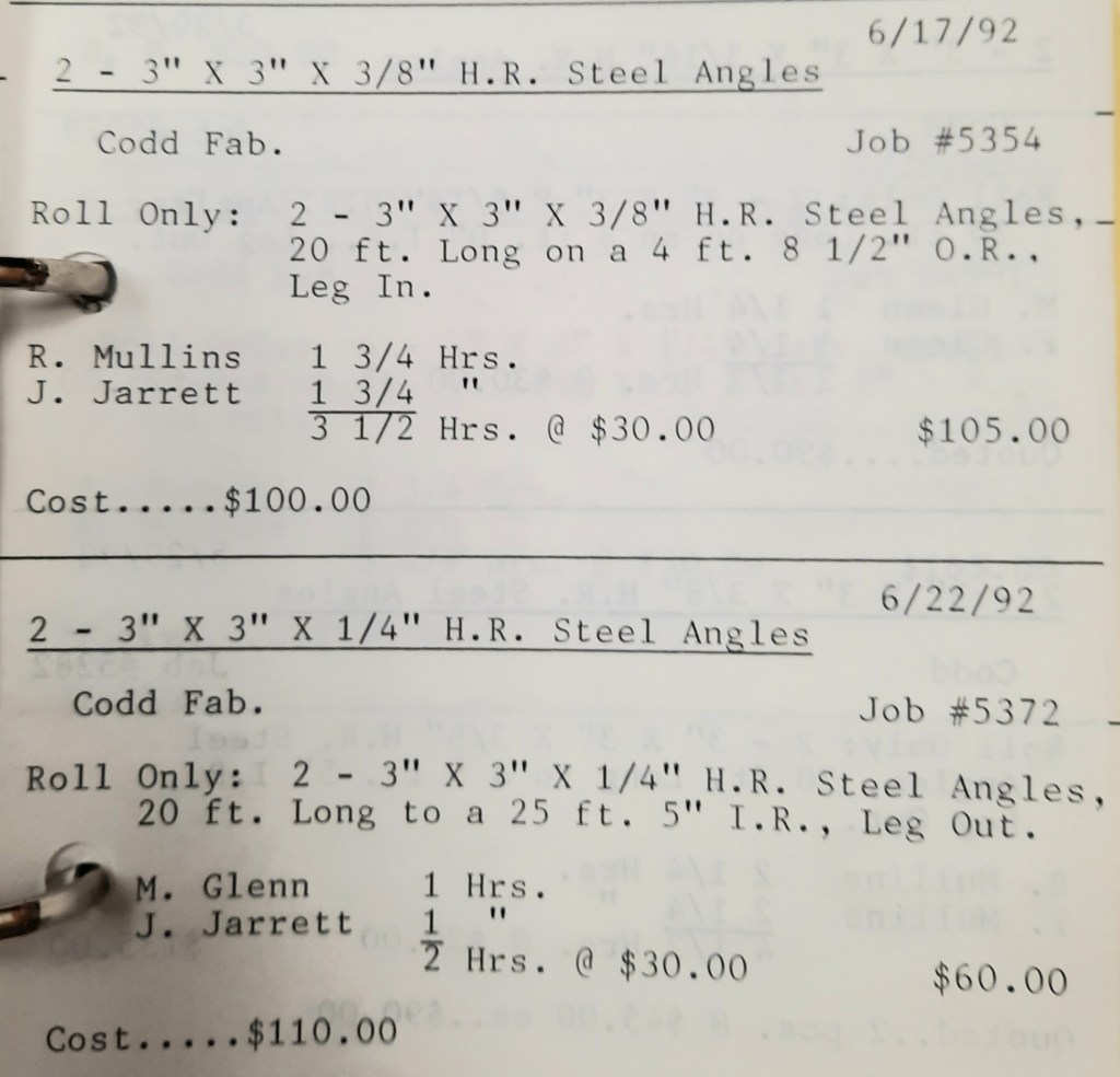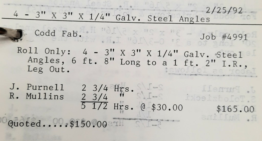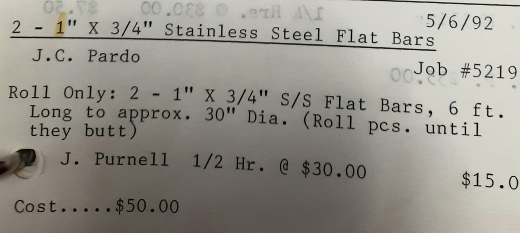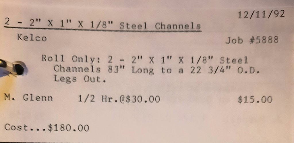 It’s mid September and the Orioles aren’t out of it yet. The Toronto Blue Jays and the Birds have battled most of the season for first but my Orioles are running out of time. I fold the newspaper up at my desk then head out to the Shop. We have three sets of angle rings for Lenderking Metal Products to finish by noon and another order for Miscellaneous Metals. Their work seems to have no end in sight. This one is for bars rolled into tight half-circles. When we are done with those, we have four pipes for Warren-Ehret to curve.