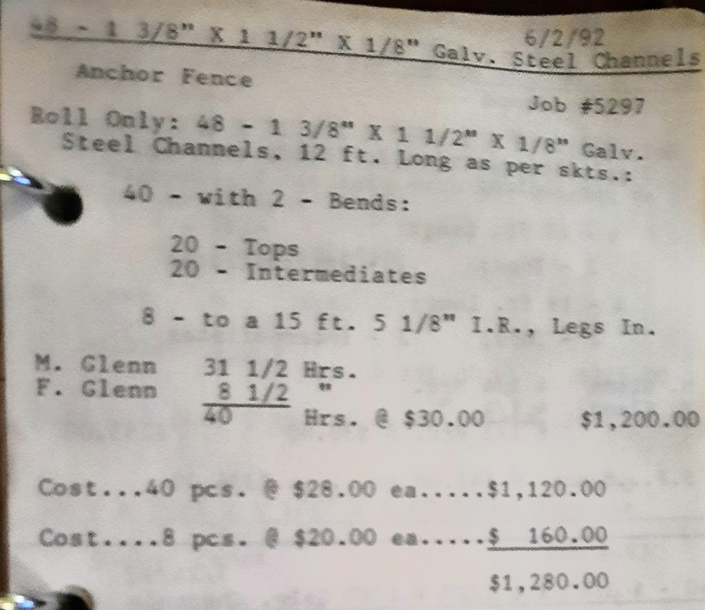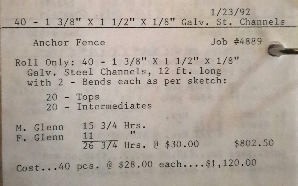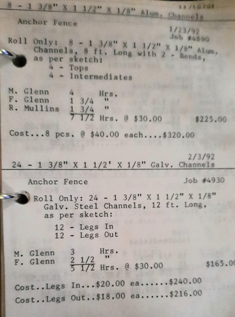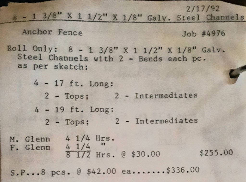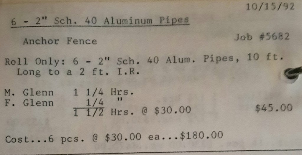 I sit at my desk reading the Baltimore Sun when the phone rings and it’s Joe Kelly from Kelco. He’s checking on an order for some 5” pipes. I tell him to come on down as we just took the last one out of the machine. When I hang up, I call Richard Baynes at Ackerman and Baynes to arrange pick up of some beams. Ann hands me several faxes, one from Chesapeake Machine for aluminum pipes to be bent, and another set of forty channel rail tops for Anchor Fence are coming in. Those channel rail tops are becoming a pretty regular thing for us and I love those kind of jobs. Recurring jobs are things you can count on and we need all of those we can get.