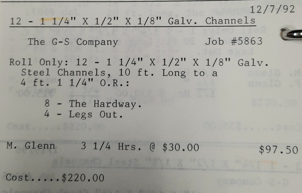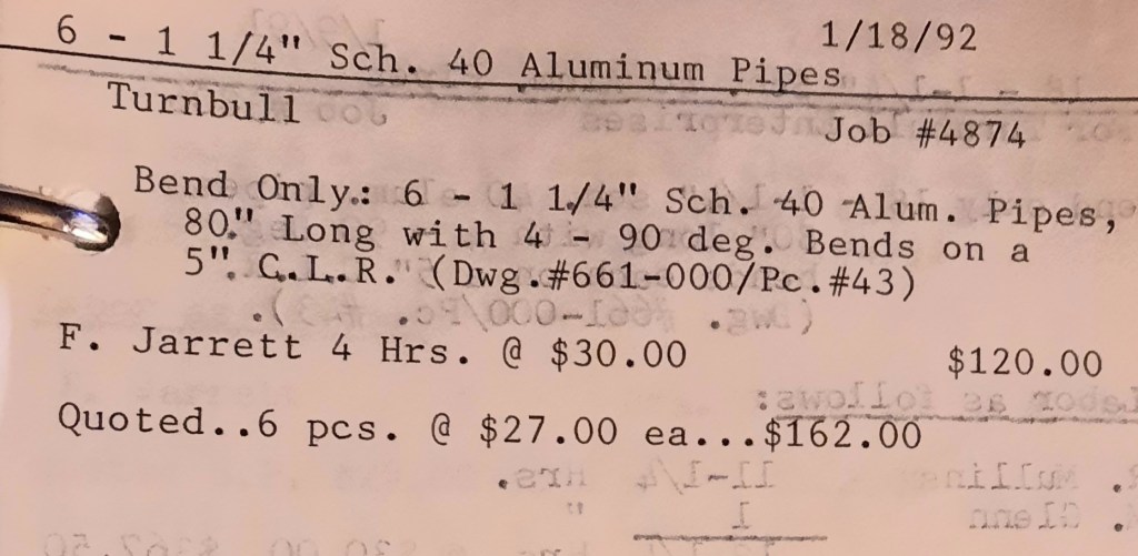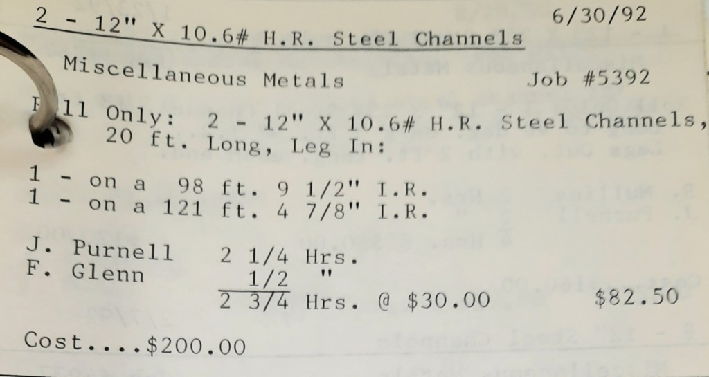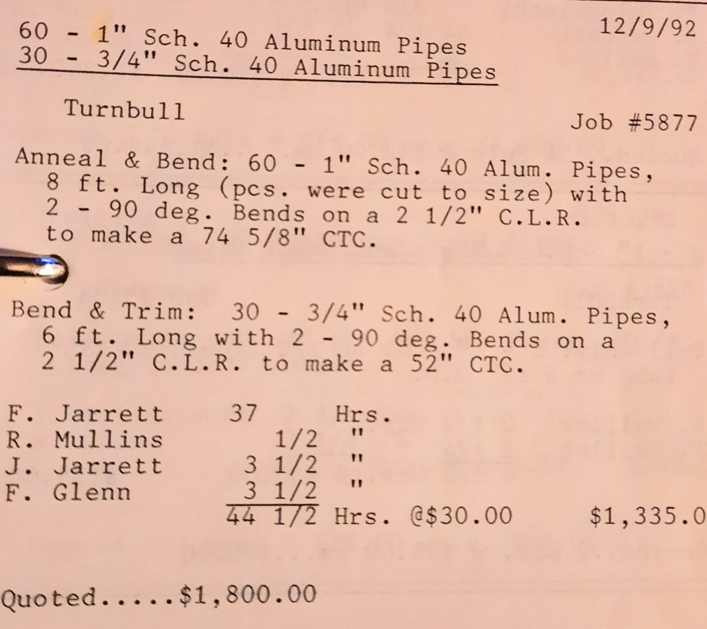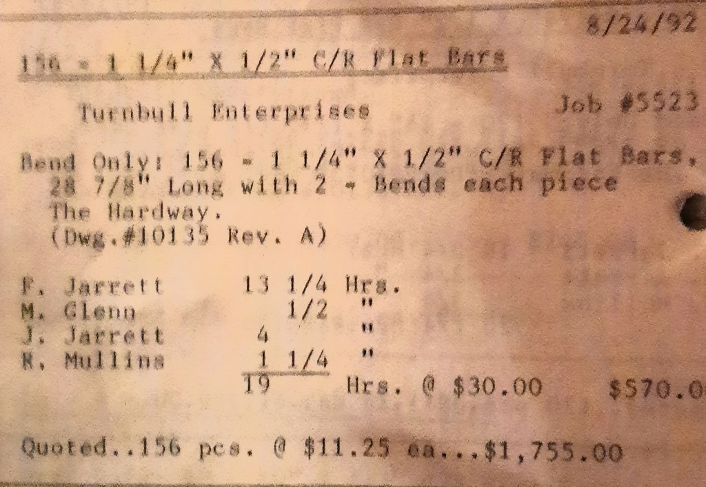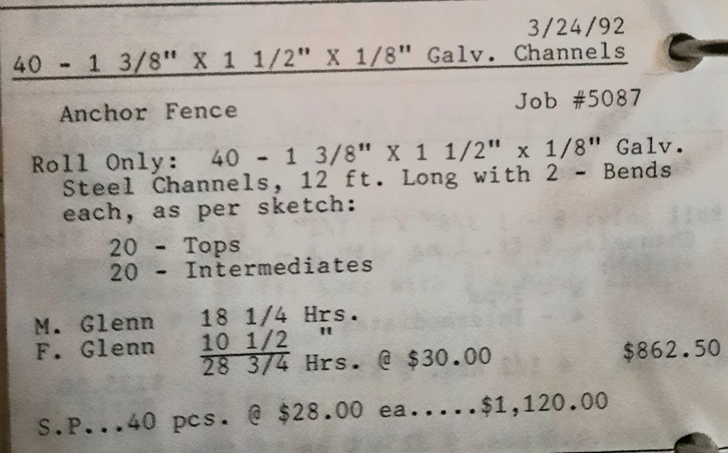 I sit at my desk reading the Baltimore Sun when the phone rings and it’s Joe Kelly from Kelco. He’s checking on an order for some 5” pipes. I tell him to come on down as we just took the last one out of the machine. When I hang up, I call Richard Baynes at Ackerman and Baynes to arrange pick up of some beams. Ann hands me several faxes, one from Chesapeake Machine for aluminum pipes to be bent, and another set of forty channel rail tops for Anchor Fence are coming in. Those channel rail tops are becoming a pretty regular thing for us and I love those kind of jobs. Recurring jobs are things you can count on and we need all of those we can get.
