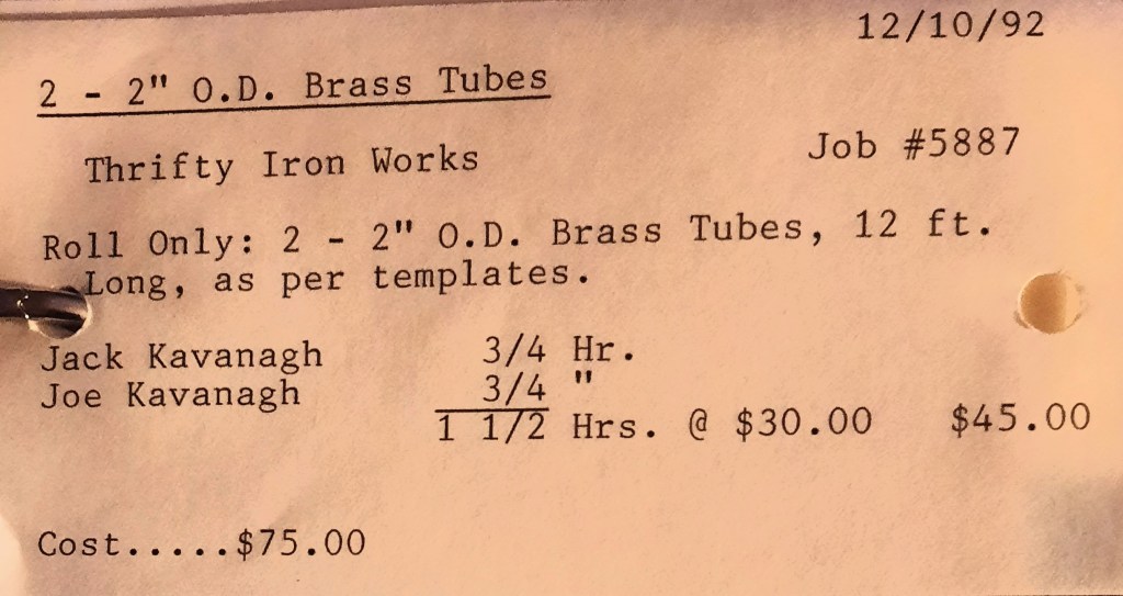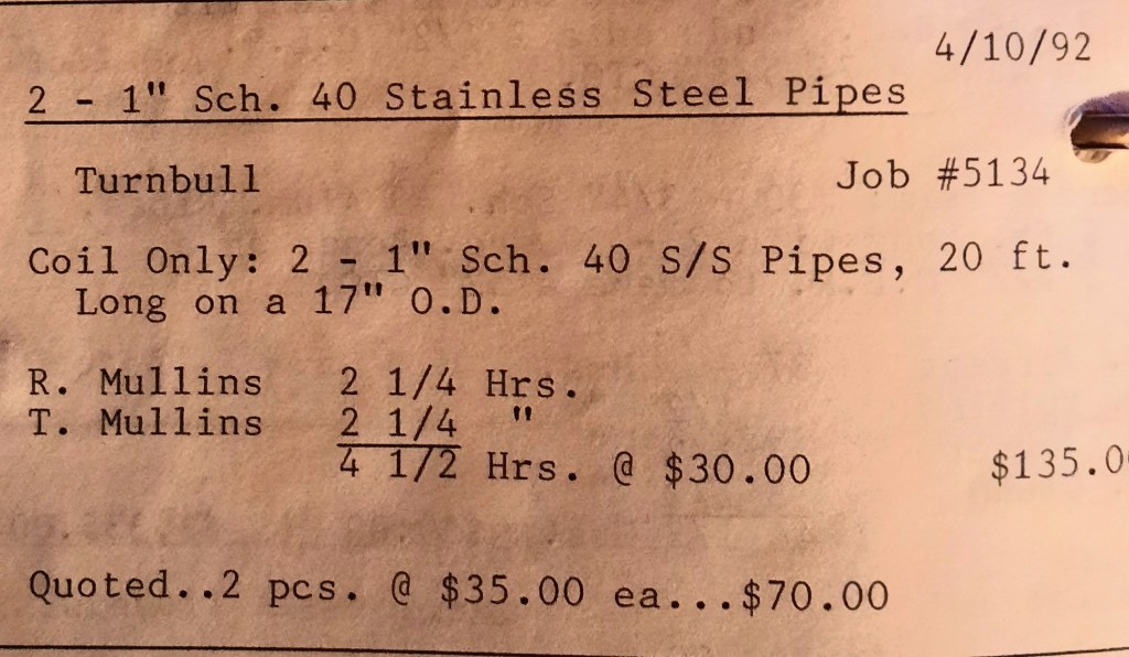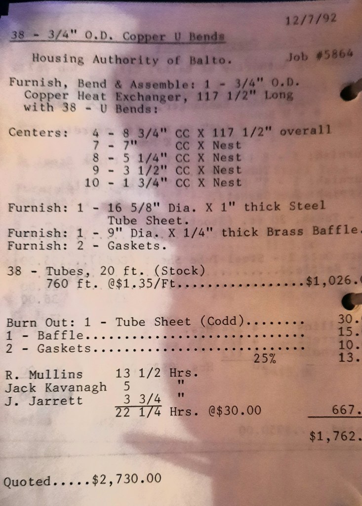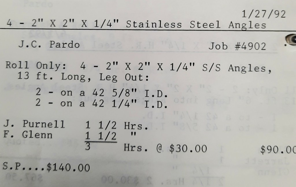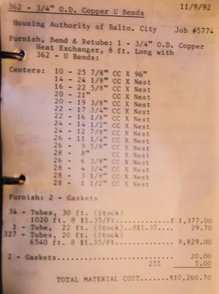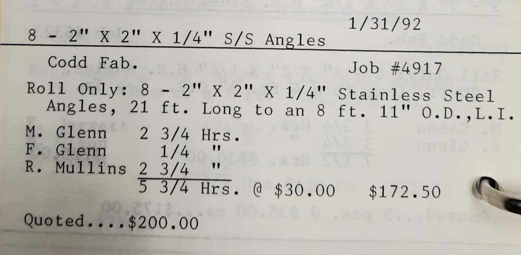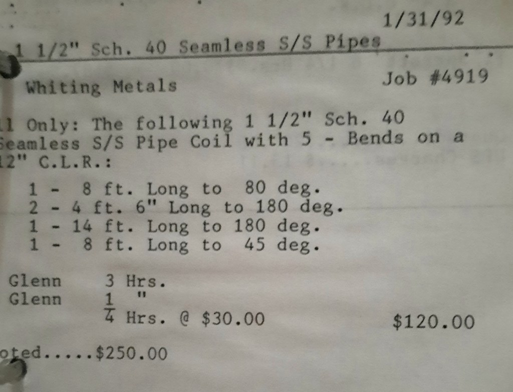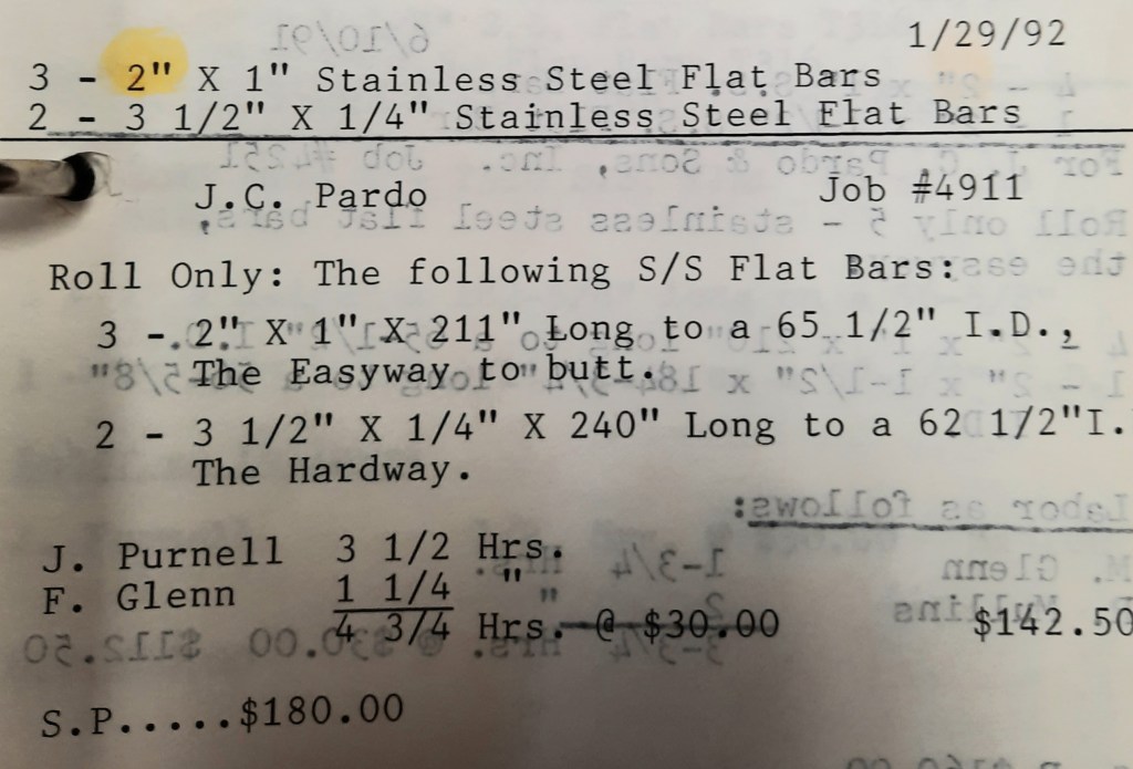 Miscellaneous Metals needs some more 2” angles rolled and to save time they have us furnish the material. We keep a few in stock and I make a mental note to call Seaboard Steel tomorrow and order some replacements. I’ll talk to Linda Dalfonzo who is my sales rep. She’s very nice and down-to-earth on the phone. Linda is one of the least “salesy” salespersons I’ve known and I like that about her. In addition, we have a Housing Authority heater to retube tomorrow.
