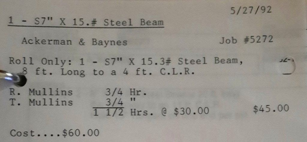 I have settled on the house and it is all mine. Next weekend after Jackie, Richard and their daughter Lisa have left, I am moving into the place. I can’t wait, and my friends will help. It’s a rowhome but behind it is Bear Creek. There is an alley and some parking but then the water. At high tide, it’s a great view but at low tide you can see the tires. I look forward to having more space and no longer being a renter. At the Shop, several orders for Ackerman and Baynes, a single pipe for Anchor and a few 3” angles for Codd Fabricators are rolled and hauled away today.