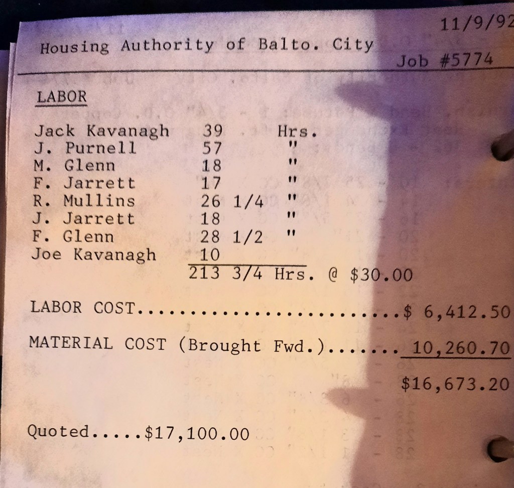 A steady rain falls and I join the crew for their two o’clock break. All of us sit quietly and stare out at the rain and the traffic on Central Avenue. So far, this year’s work has been up and down but never outright slow. Excitement is reaching a feverish pitch in the City as the baseball season nears. The new modern/retro Oriole Park at Camden Yards will open next month and tickets are tough to get. Jack has been able to buy three to the third game of the season but opening day or night tickets are long gone. Orioles’ fans are anxious to see the place and start another baseball season, but even non-fans wait patiently to see how this new stadium will look. My men rise from their chairs and head back to work waking me from my thoughts. I hand off a job card for Codd to Rob Mulllins and one for Industrial Fabricators to Jerry Purnell.