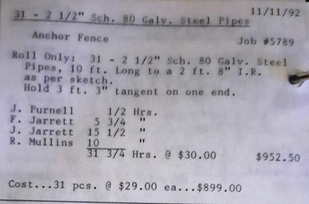 It’s a cold chilly day but the boys work through it bending some boiler parts, a steel pipe railing and thirty-one pipes for Anchor Fence. We’ve done a lot of the channel work for them this year but these pipes for bridges are one of our staples. Bridges have a barrier between the edge and pedestrians or drivers. It’s usually barbed wire stretched from a few bent pipes such as these. Anchor and Miscellaneous have really made the difference in our success this year.