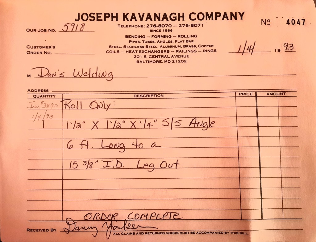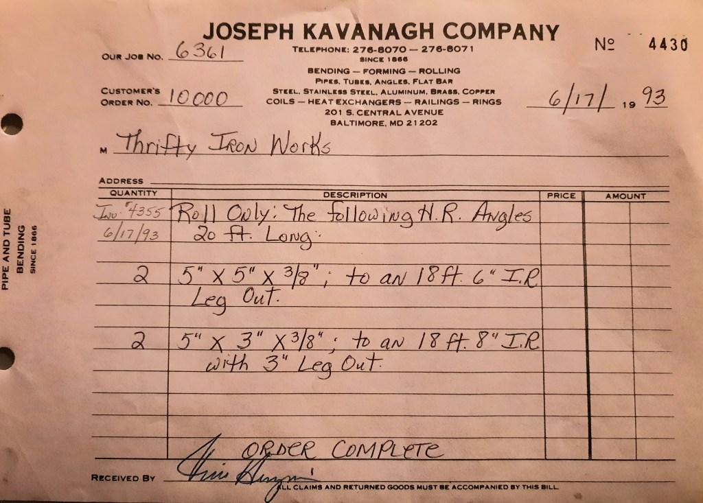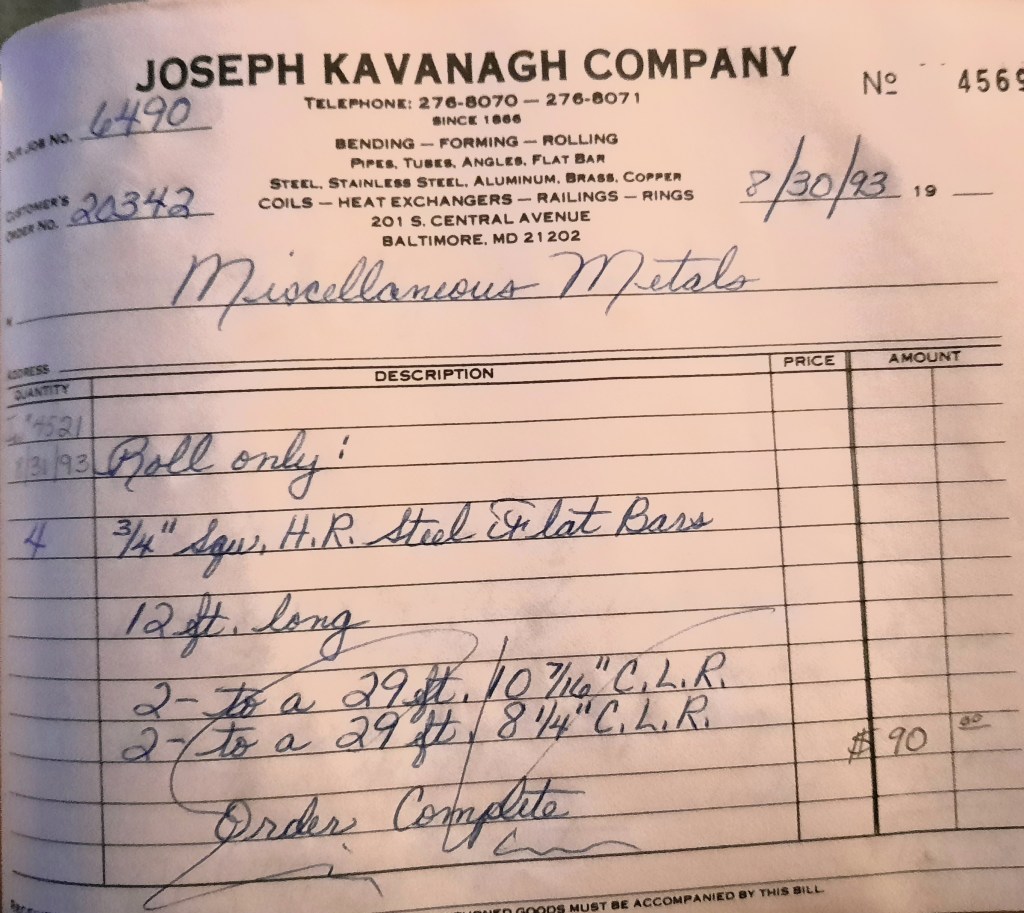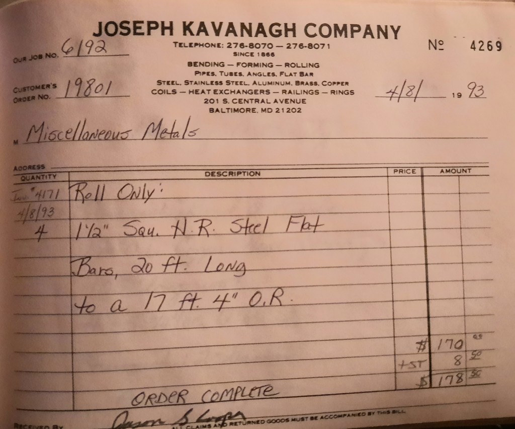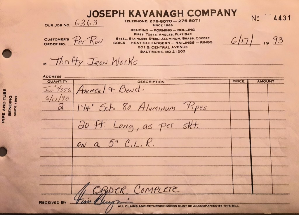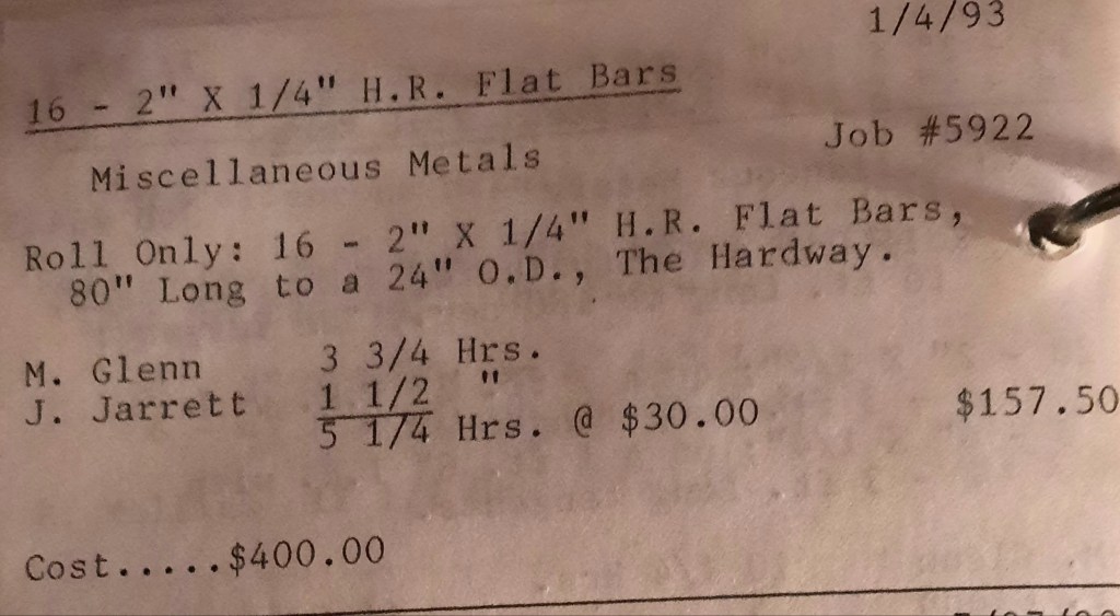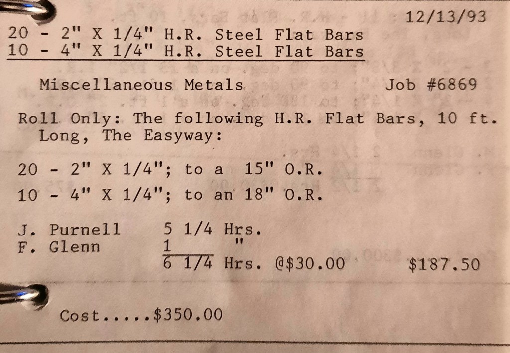 The Shop’s job book entry. Miscellaneous Metals job. January 4, 1993.