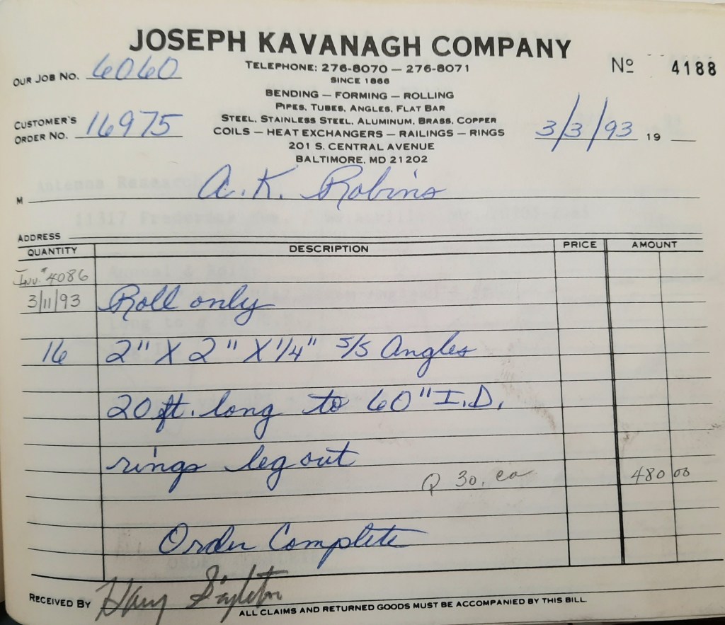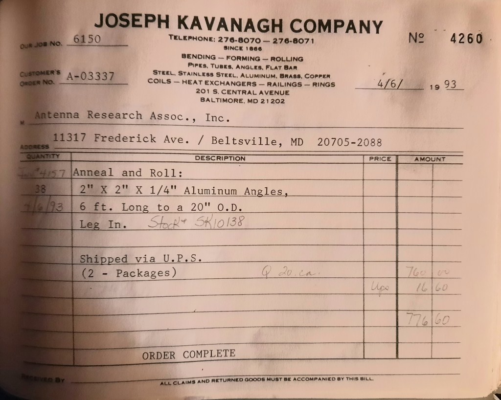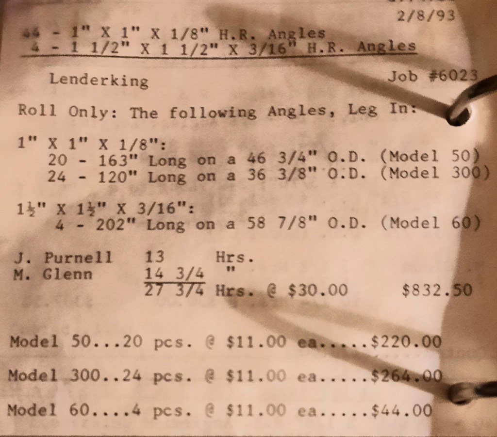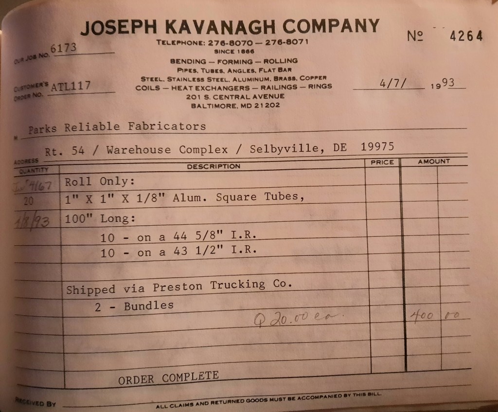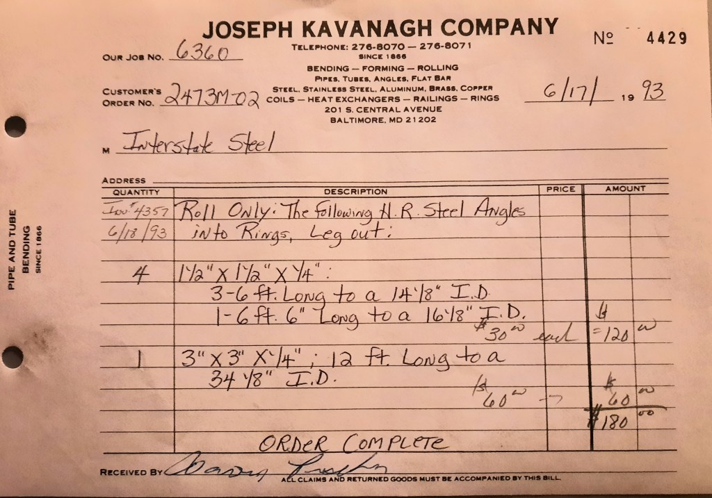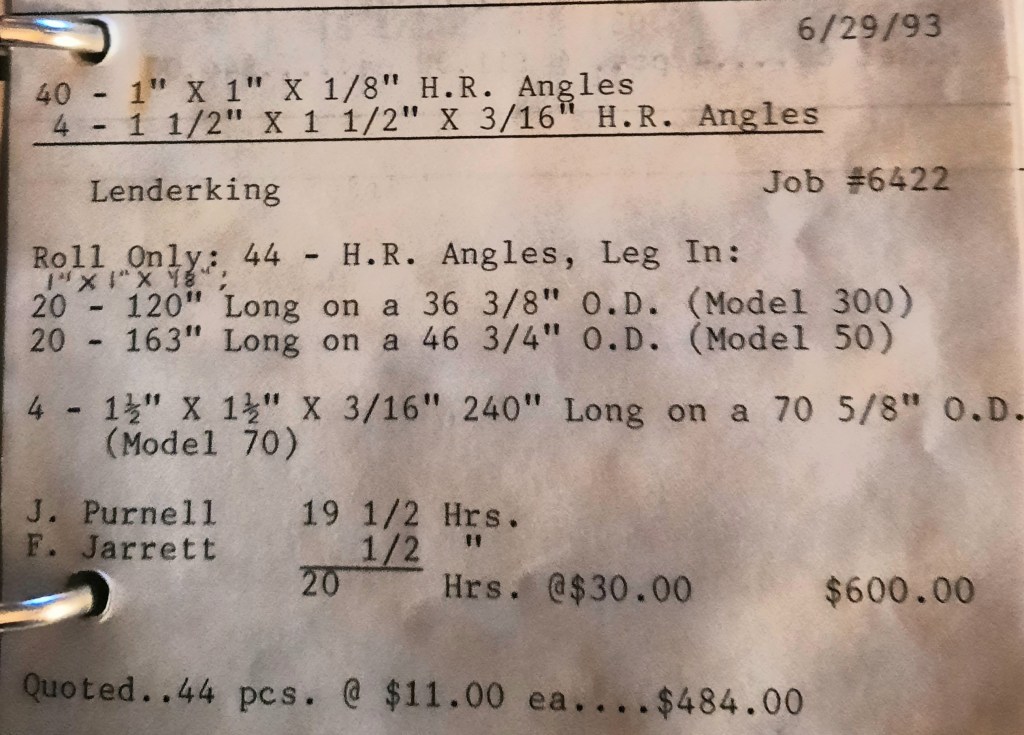 The Shop’s job book entry. Miscellaneous Metals job. January 4, 1993.