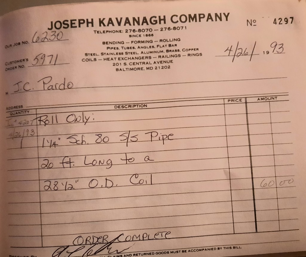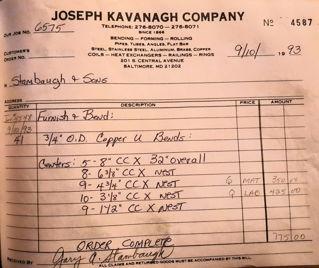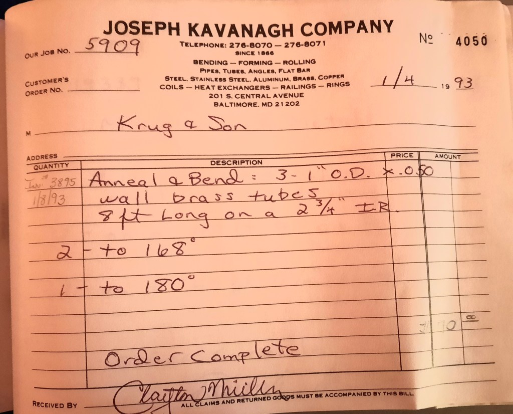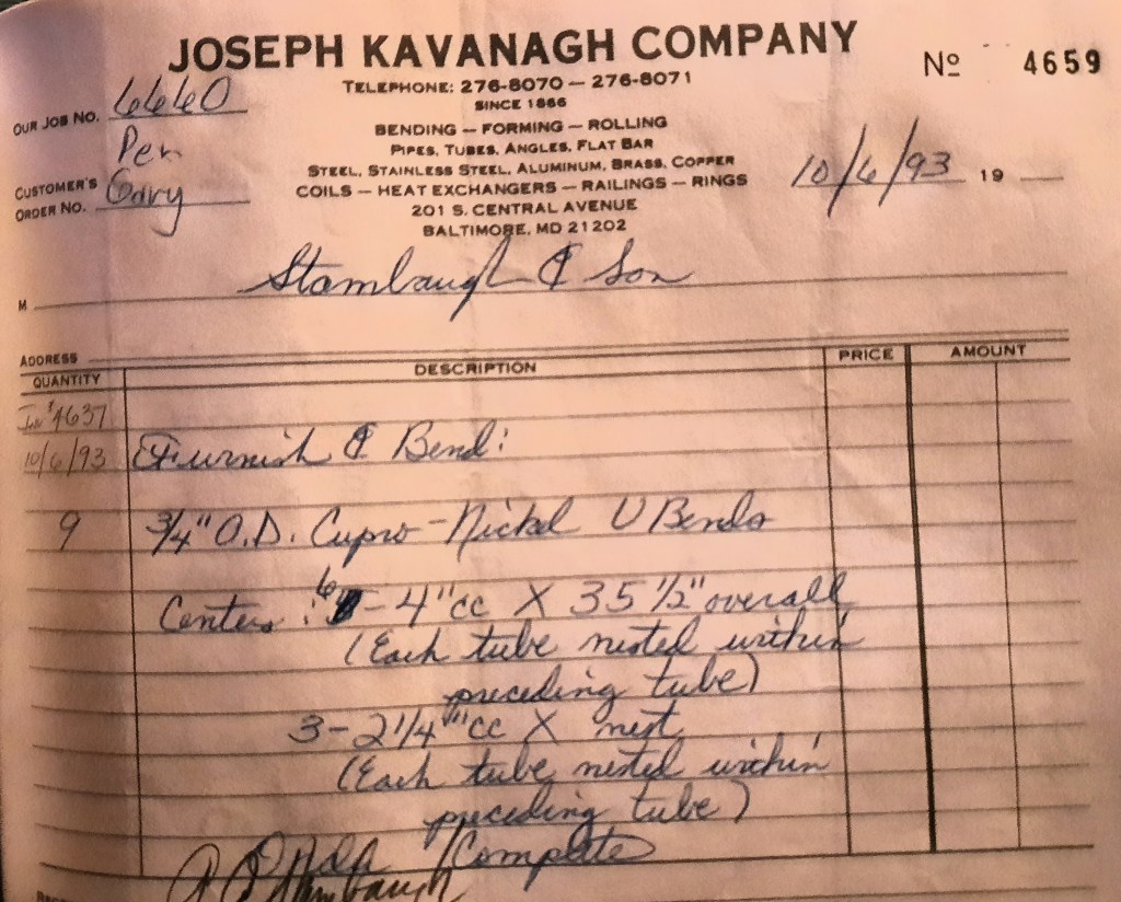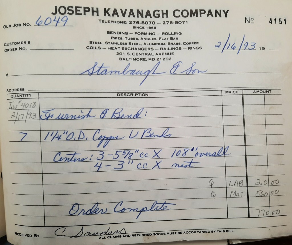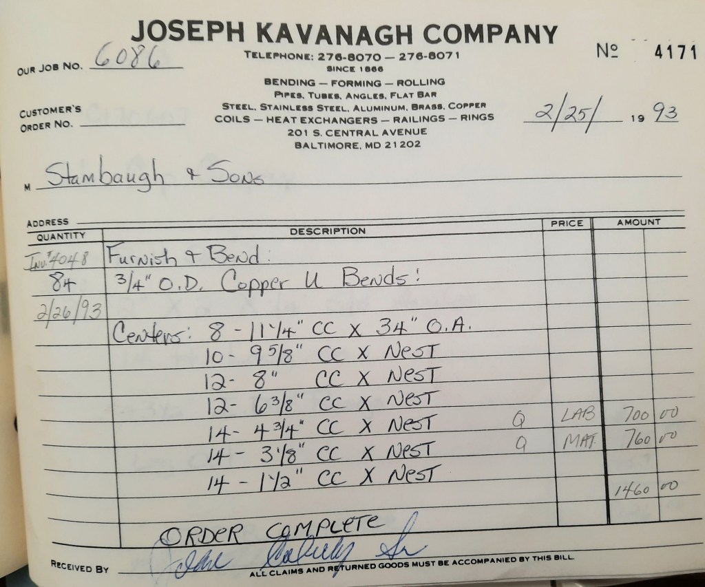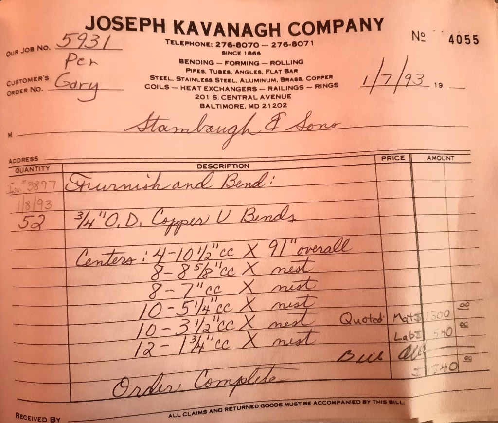 Another year begins at the Joseph Kavanagh Company. My sister Ann, brother Jack and I are the fifth generation of Kavanagh’s to work here and run the place. We have a few jobs on the books to start, a small order from Dan’s Welding and a larger one for Miscellaneous Metals. We also finish a job for Krug & Son, another very old metals business in Baltimore. The winter is generally our slowest time but we receive a few orders in this first week for Anchor Fence, Miscellaneous and a few others. We also have some heater work coming up: a re-tubing of a heat exchanger for the Housing Authority and a set of the copper u-bends themselves for Harvey Stambaugh & Sons.