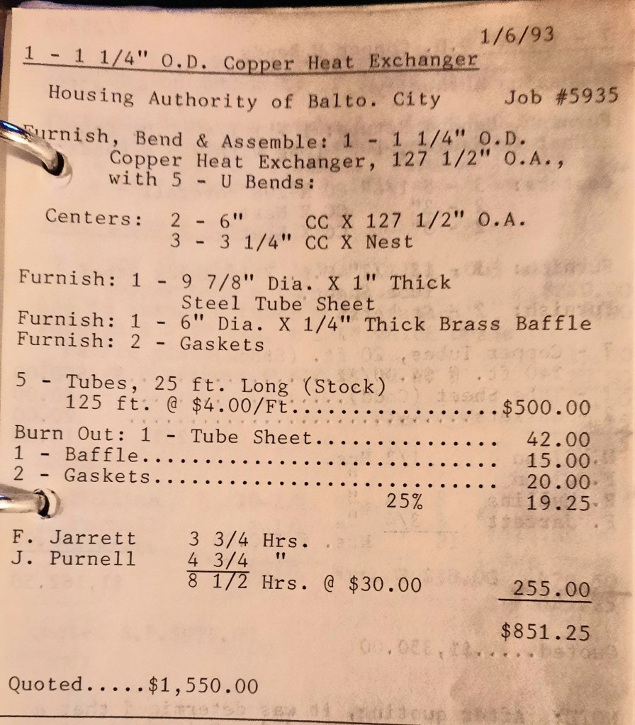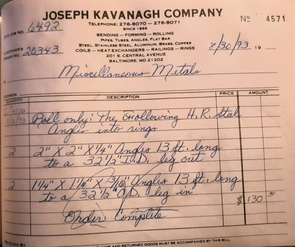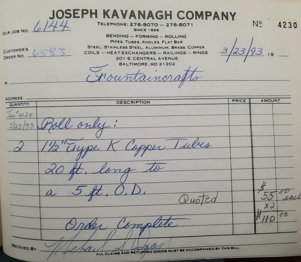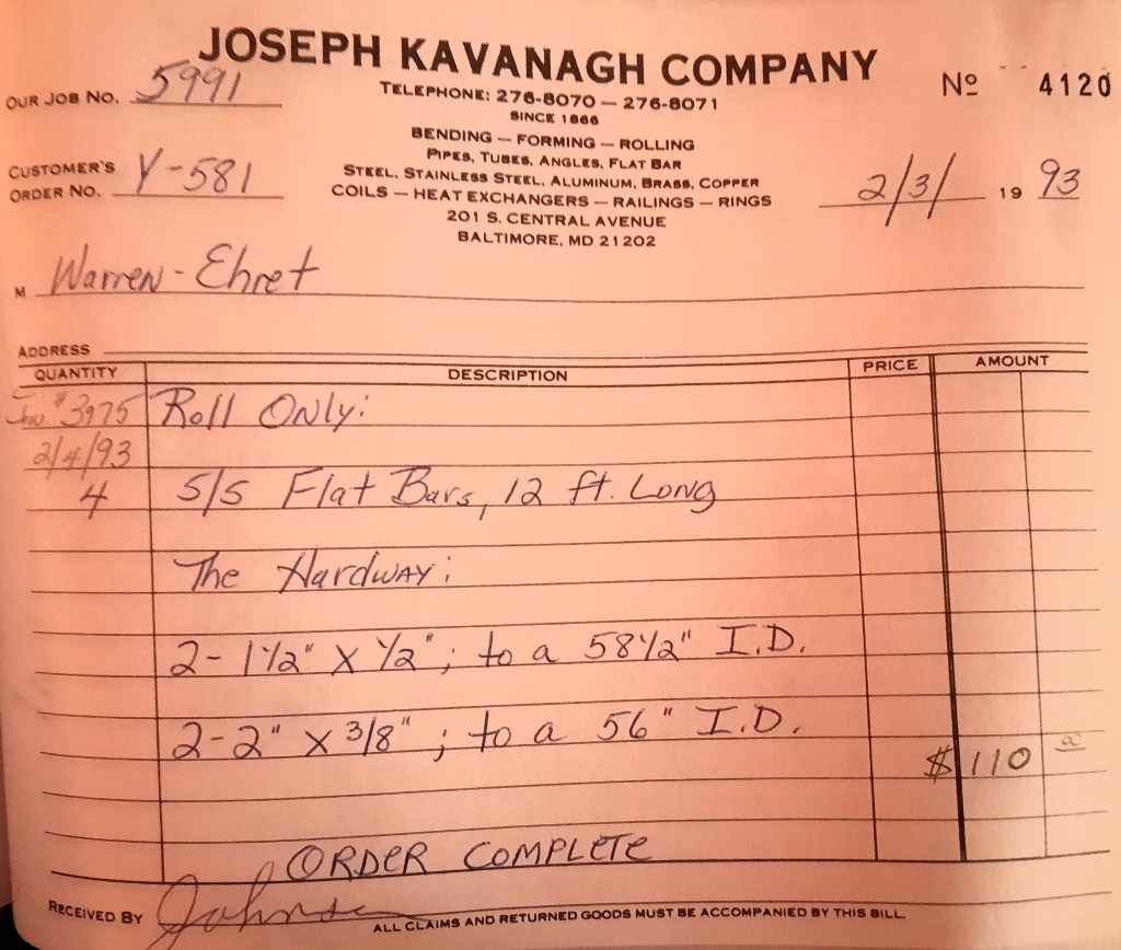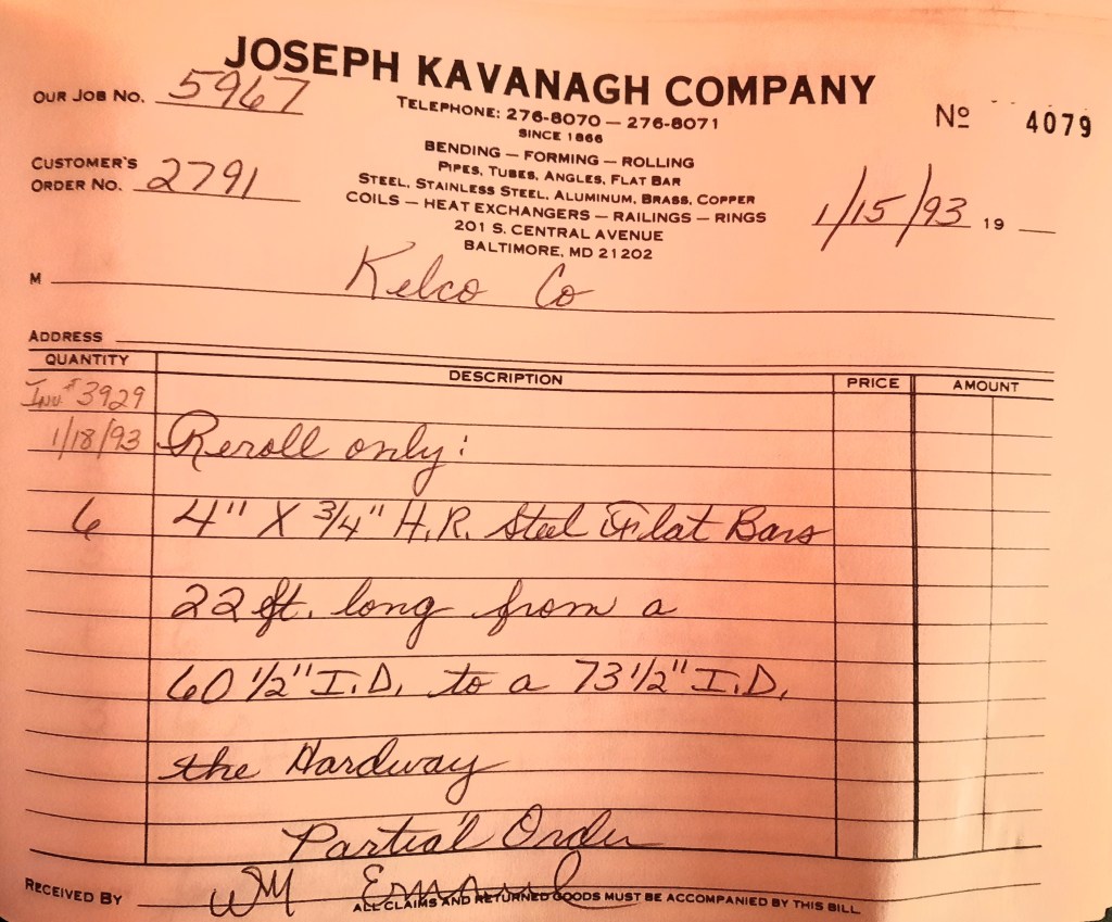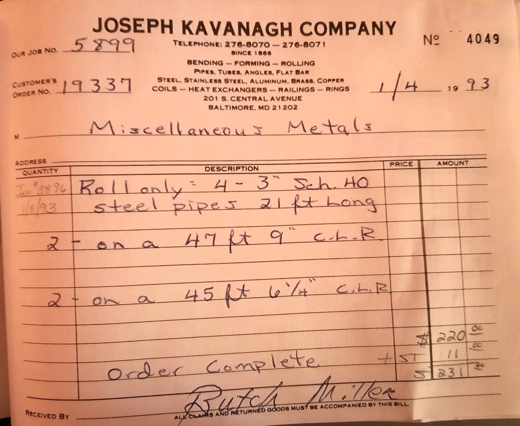 Another year begins at the Joseph Kavanagh Company. My sister Ann, brother Jack and I are the fifth generation of Kavanagh’s to work here and run the place. We have a few jobs on the books to start, a small order from Dan’s Welding and a larger one for Miscellaneous Metals. We also finish a job for Krug & Son, another very old metals business in Baltimore. The winter is generally our slowest time but we receive a few orders in this first week for Anchor Fence, Miscellaneous and a few others. We also have some heater work coming up: a re-tubing of a heat exchanger for the Housing Authority and a set of the copper u-bends themselves for Harvey Stambaugh & Sons.