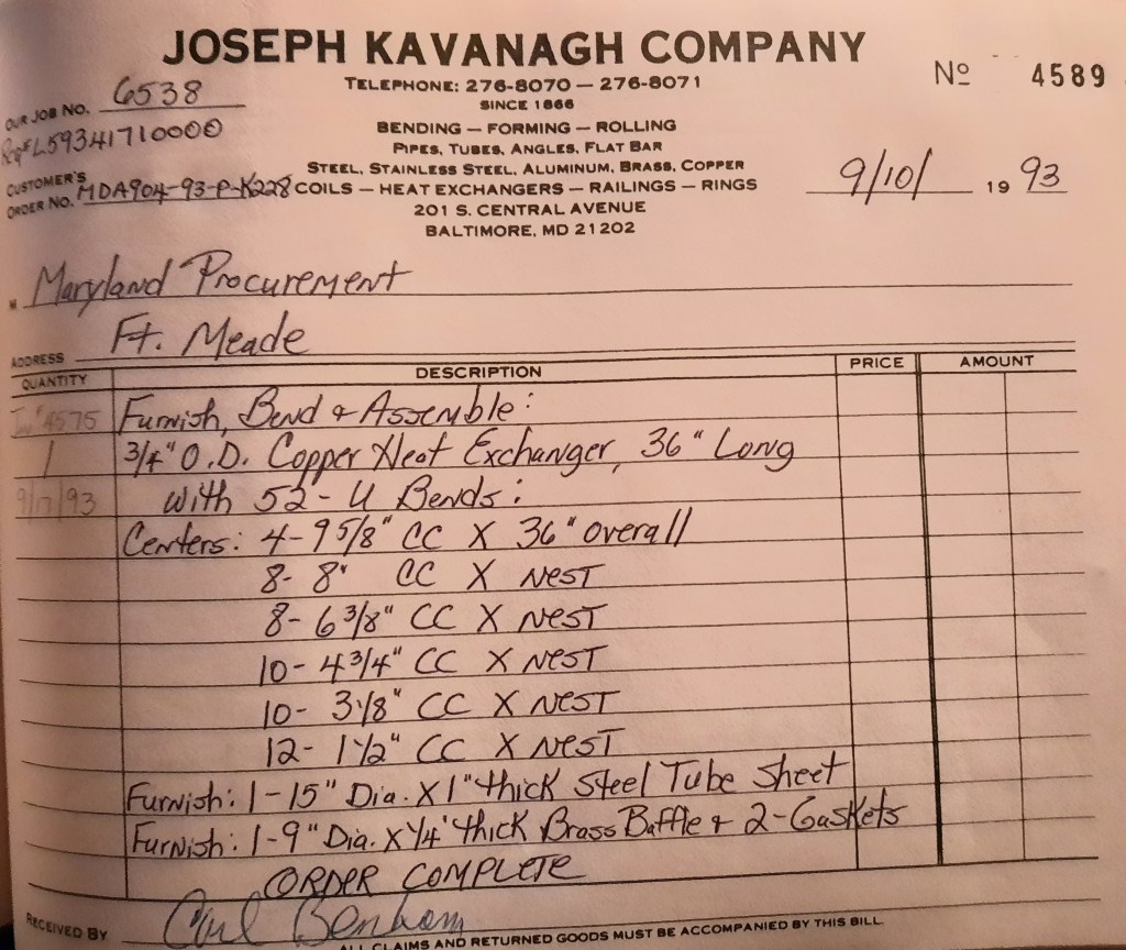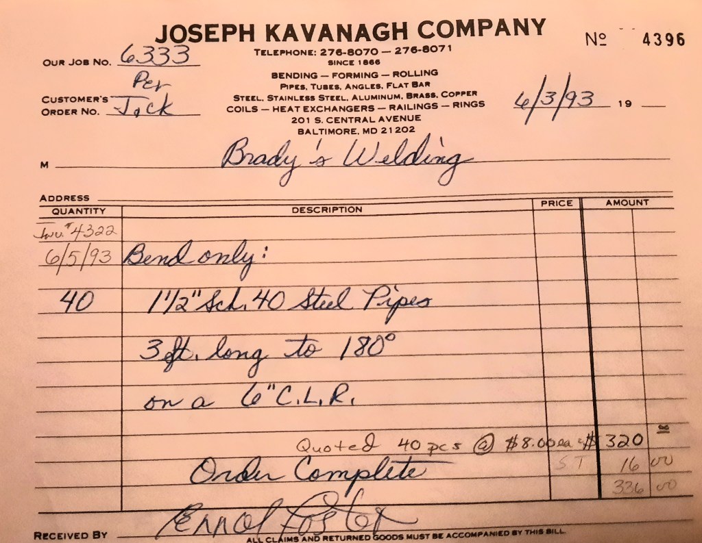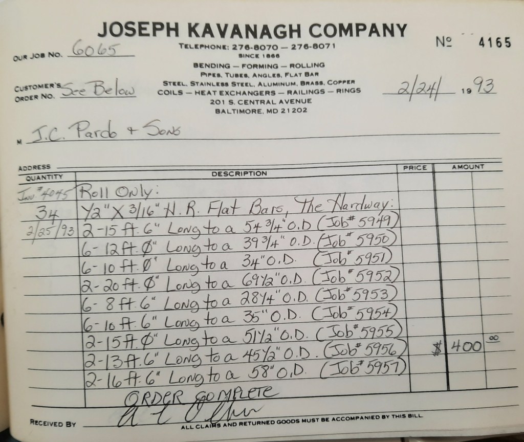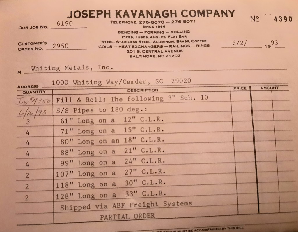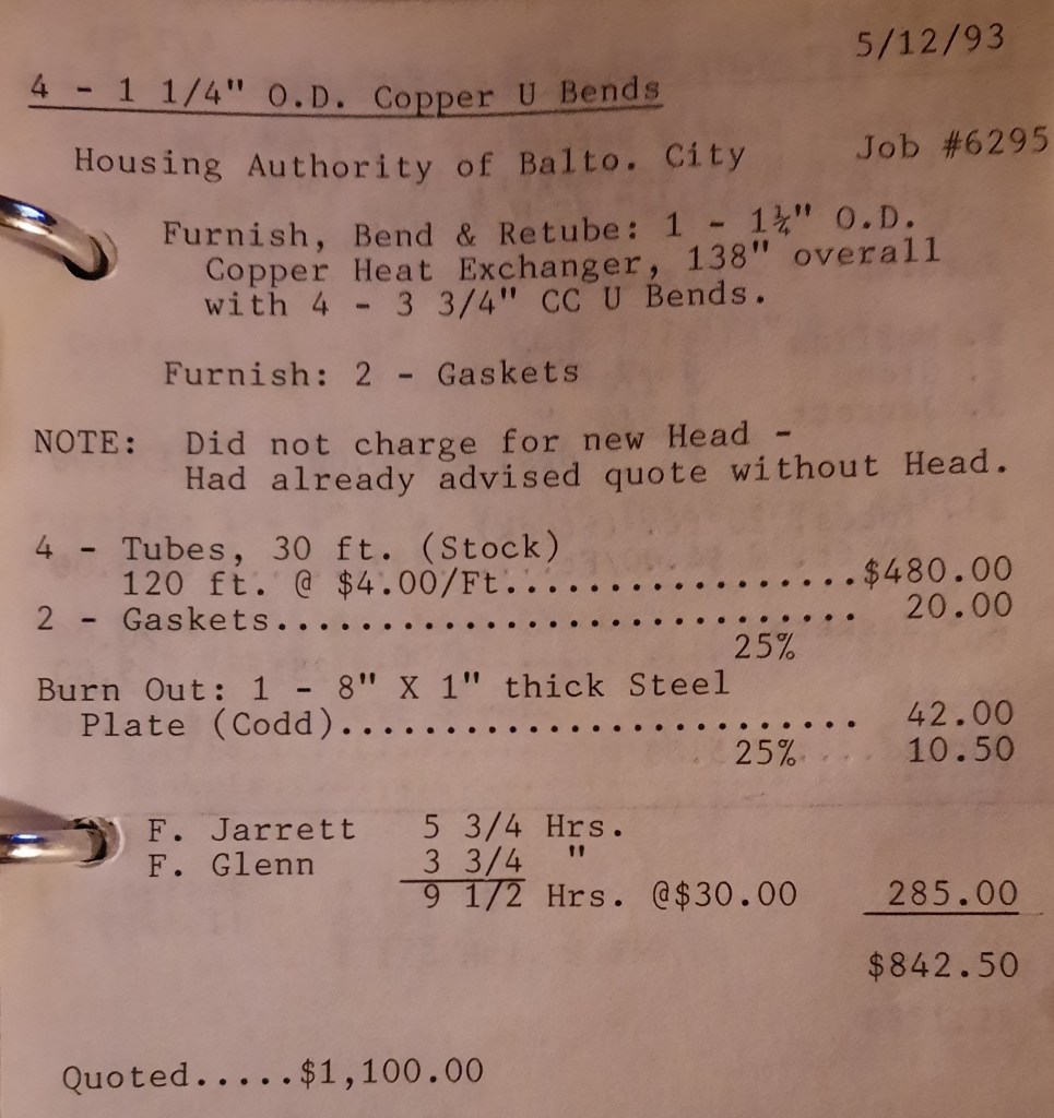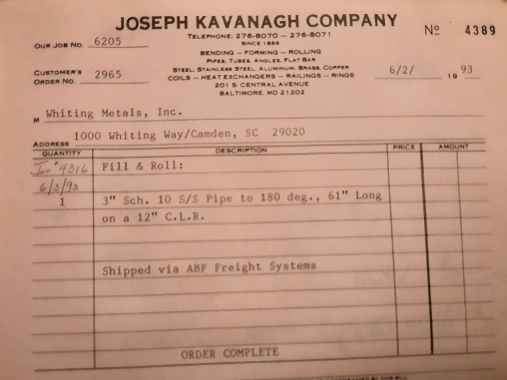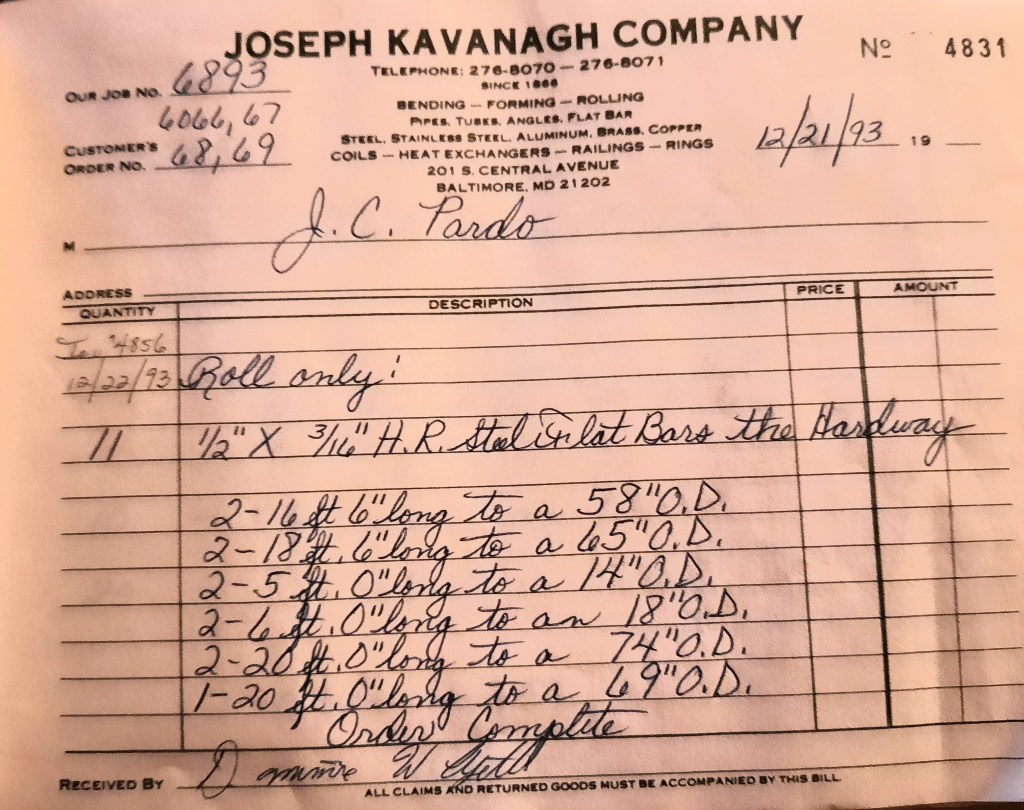 Another year begins at the Joseph Kavanagh Company. My sister Ann, brother Jack and I are the fifth generation of Kavanagh’s to work here and run the place. We have a few jobs on the books to start, a small order from Dan’s Welding and a larger one for Miscellaneous Metals. We also finish a job for Krug & Son, another very old metals business in Baltimore. The winter is generally our slowest time but we receive a few orders in this first week for Anchor Fence, Miscellaneous and a few others. We also have some heater work coming up: a re-tubing of a heat exchanger for the Housing Authority and a set of the copper u-bends themselves for Harvey Stambaugh & Sons.