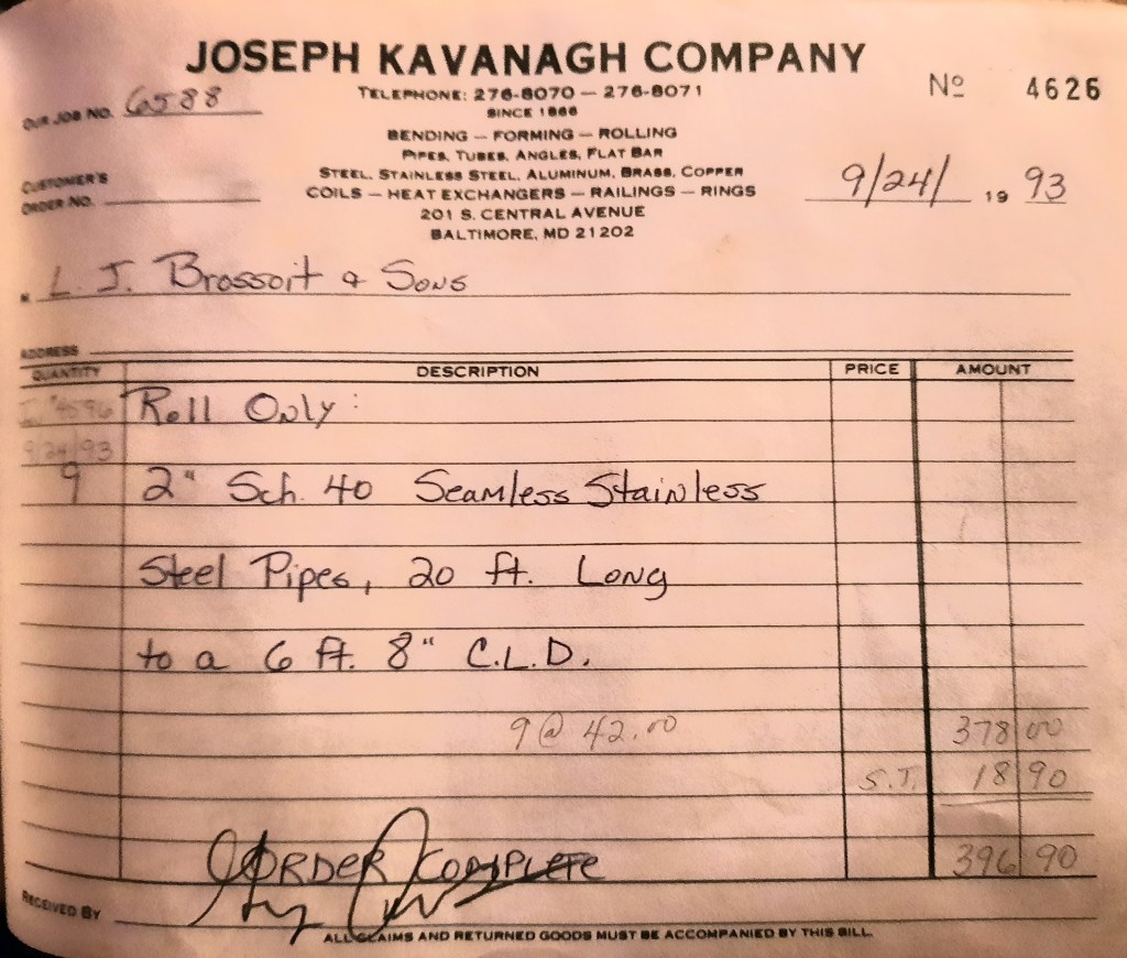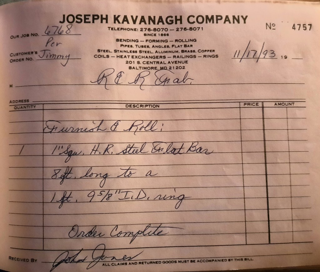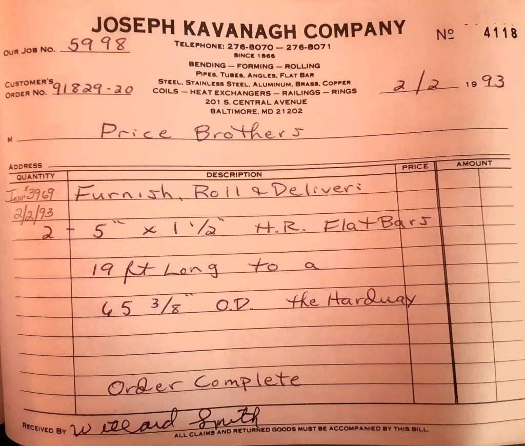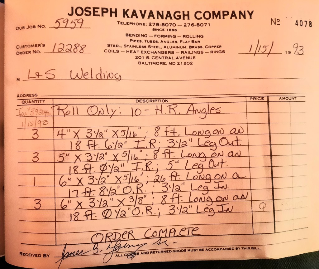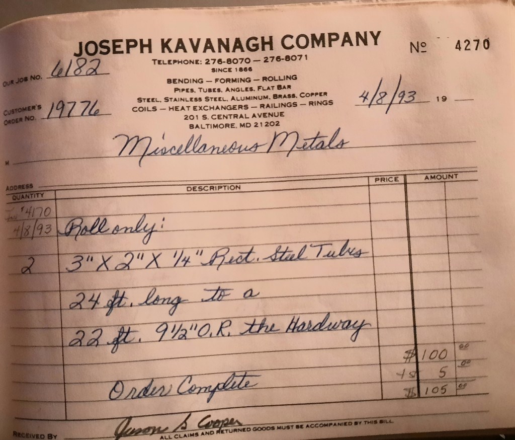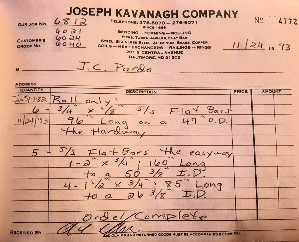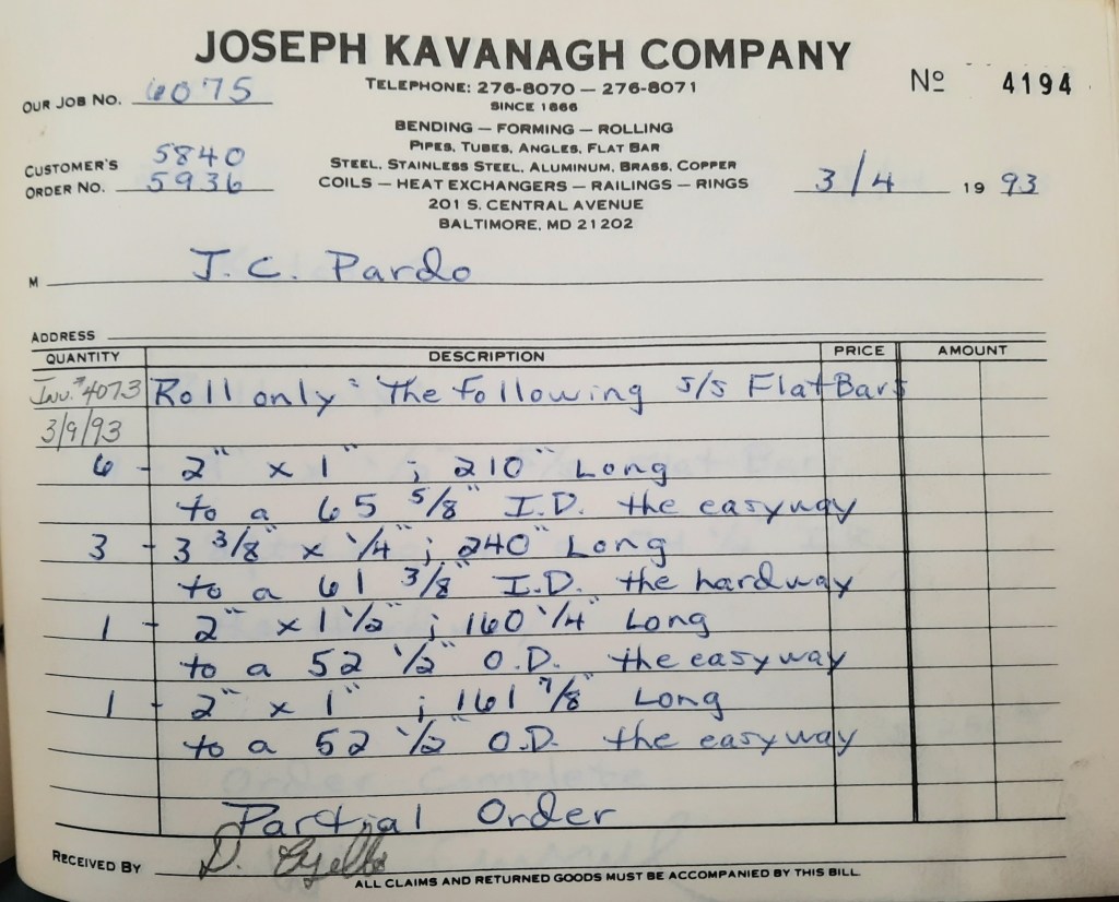 Another year begins at the Joseph Kavanagh Company. My sister Ann, brother Jack and I are the fifth generation of Kavanagh’s to work here and run the place. We have a few jobs on the books to start, a small order from Dan’s Welding and a larger one for Miscellaneous Metals. We also finish a job for Krug & Son, another very old metals business in Baltimore. The winter is generally our slowest time but we receive a few orders in this first week for Anchor Fence, Miscellaneous and a few others. We also have some heater work coming up: a re-tubing of a heat exchanger for the Housing Authority and a set of the copper u-bends themselves for Harvey Stambaugh & Sons.