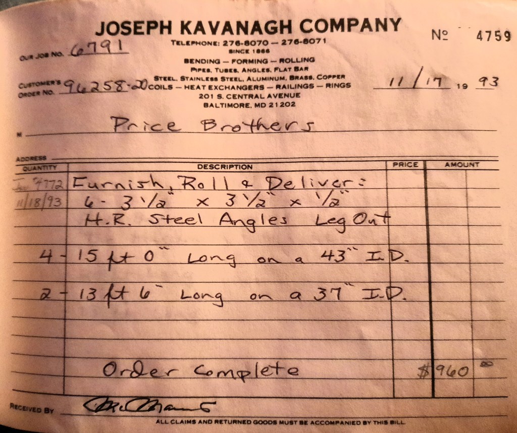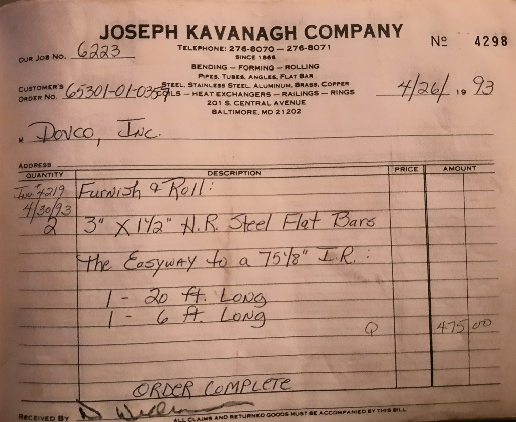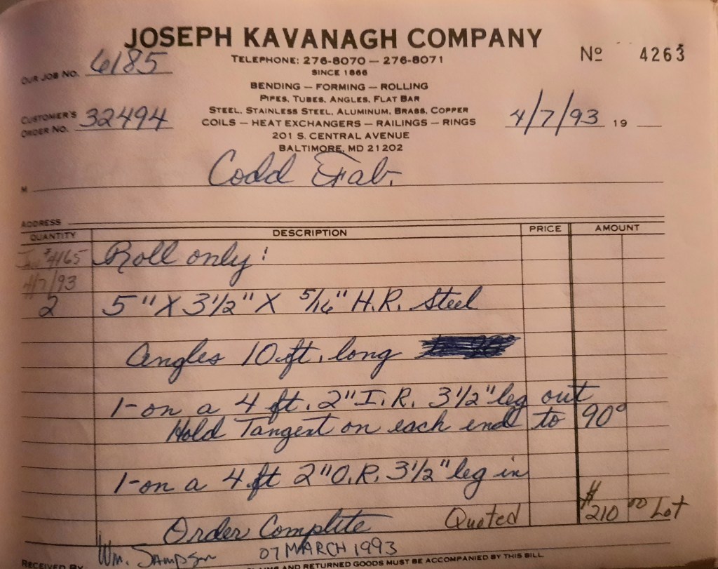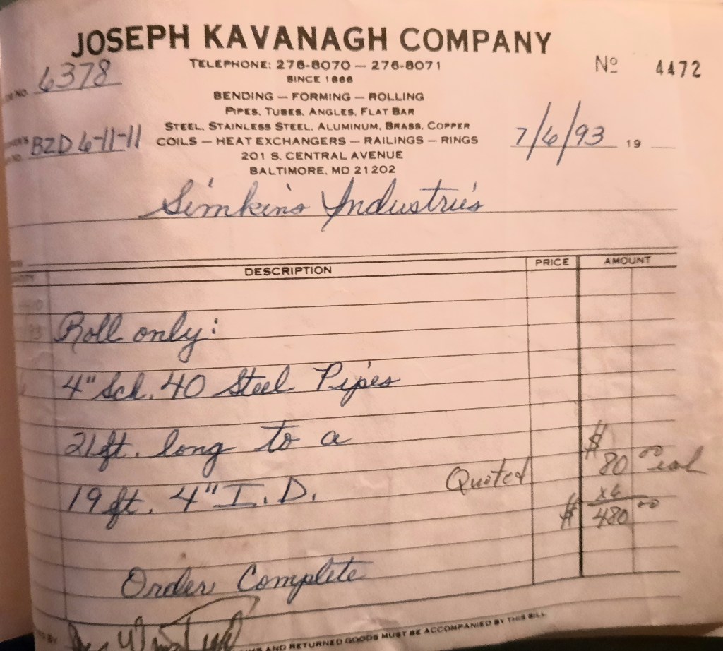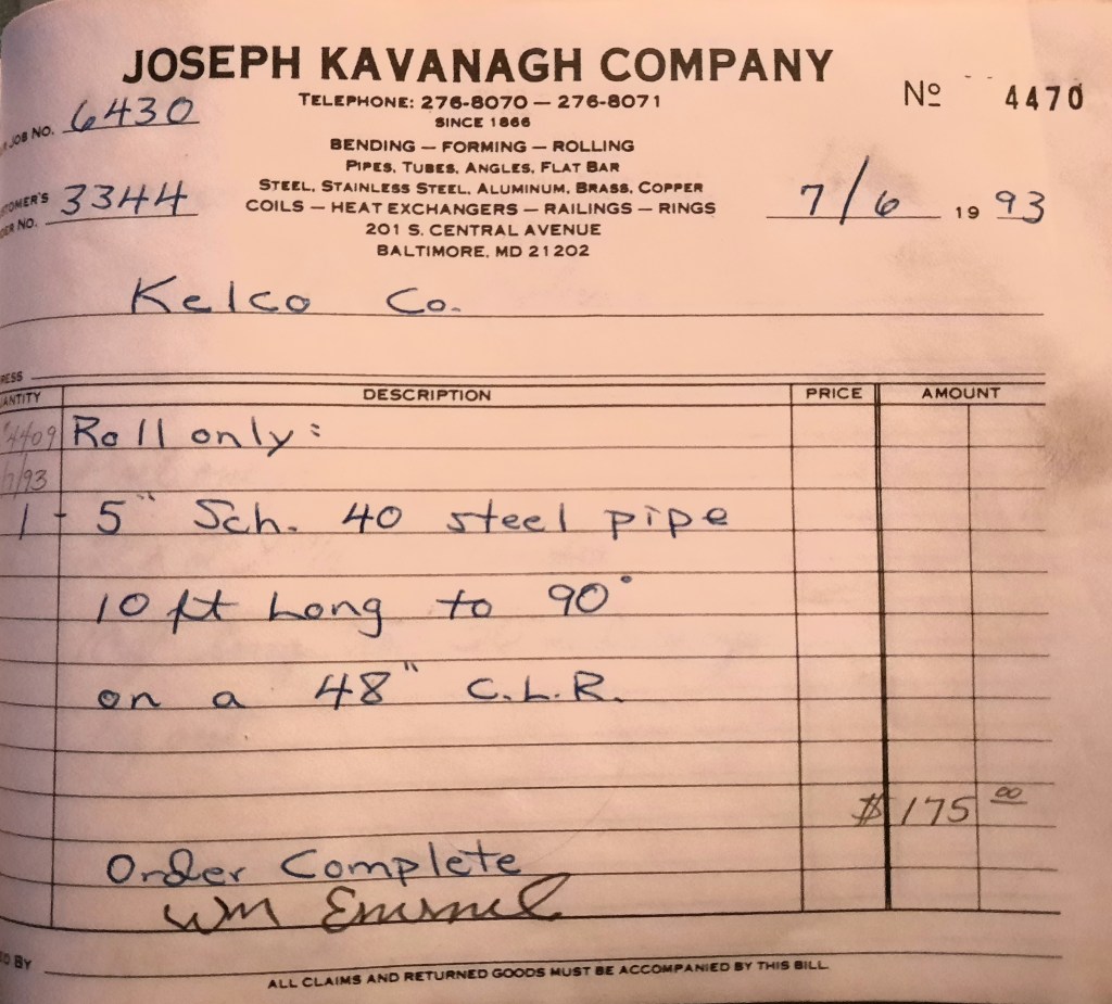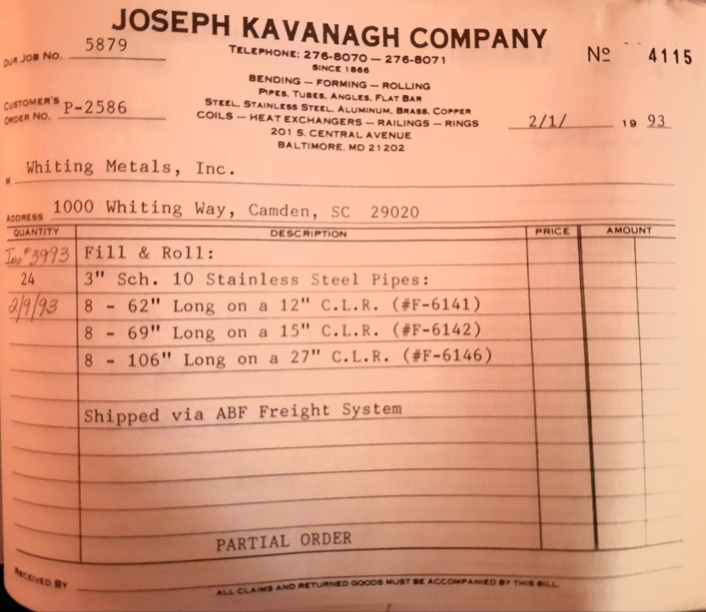 Another year begins at the Joseph Kavanagh Company. My sister Ann, brother Jack and I are the fifth generation of Kavanagh’s to work here and run the place. We have a few jobs on the books to start, a small order from Dan’s Welding and a larger one for Miscellaneous Metals. We also finish a job for Krug & Son, another very old metals business in Baltimore. The winter is generally our slowest time but we receive a few orders in this first week for Anchor Fence, Miscellaneous and a few others. We also have some heater work coming up: a re-tubing of a heat exchanger for the Housing Authority and a set of the copper u-bends themselves for Harvey Stambaugh & Sons.