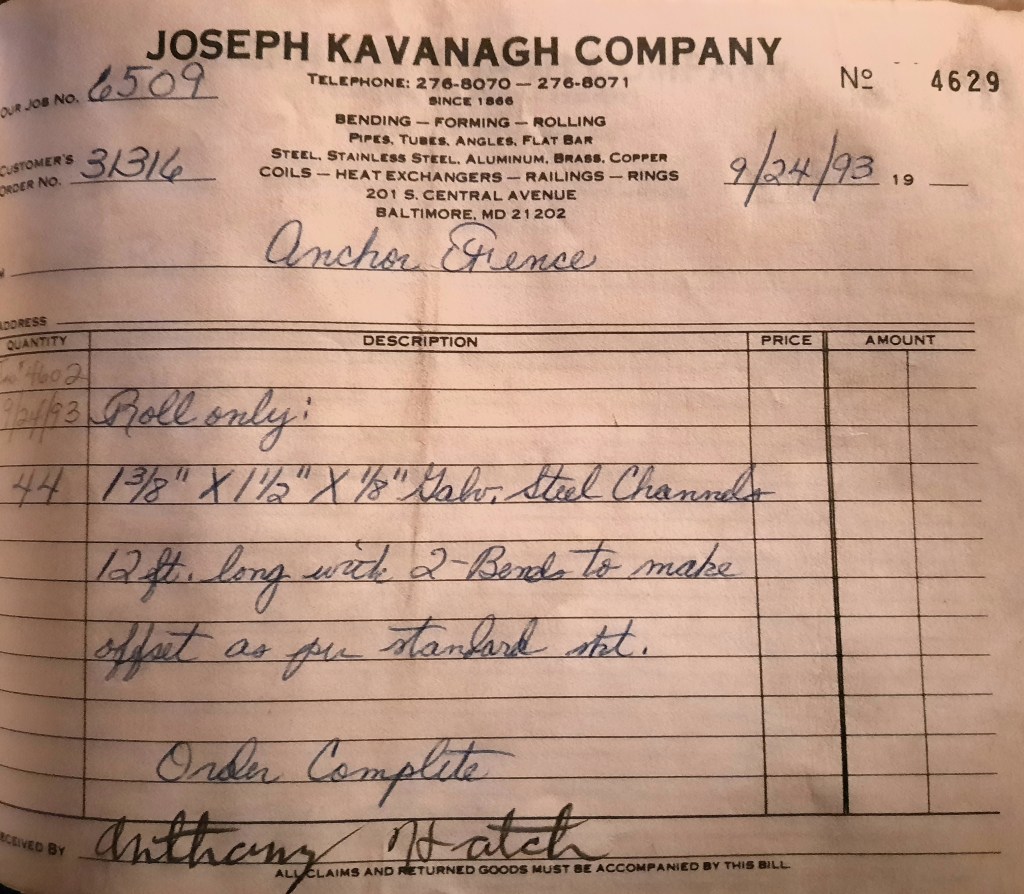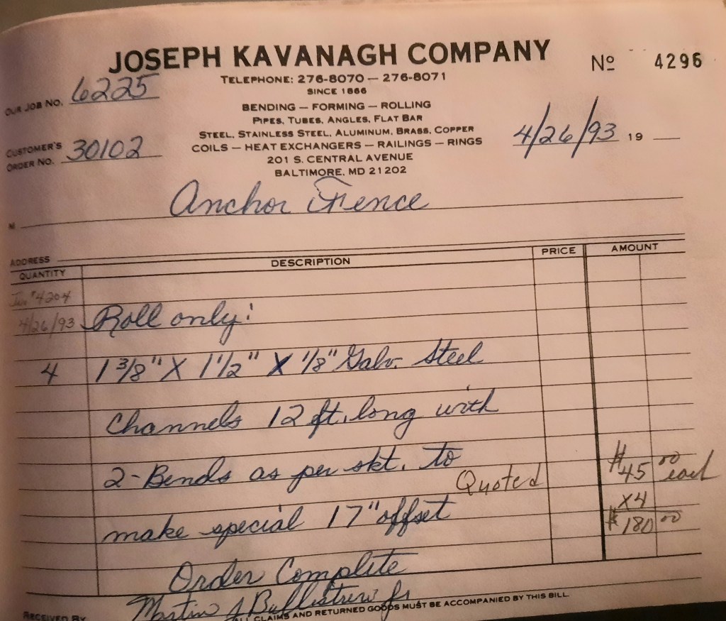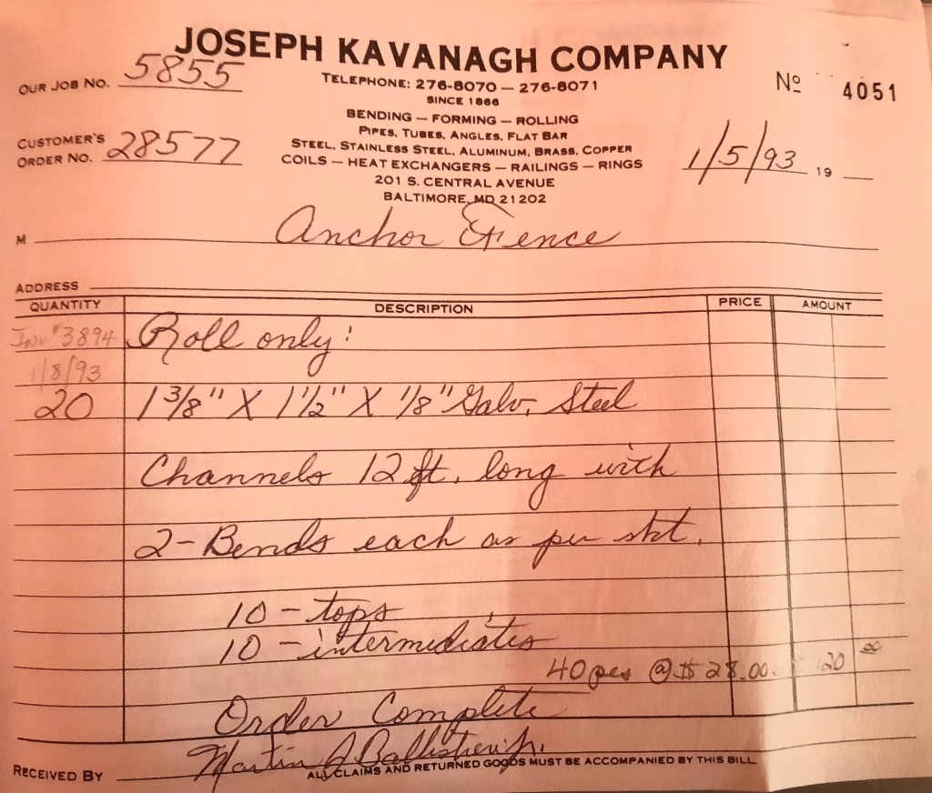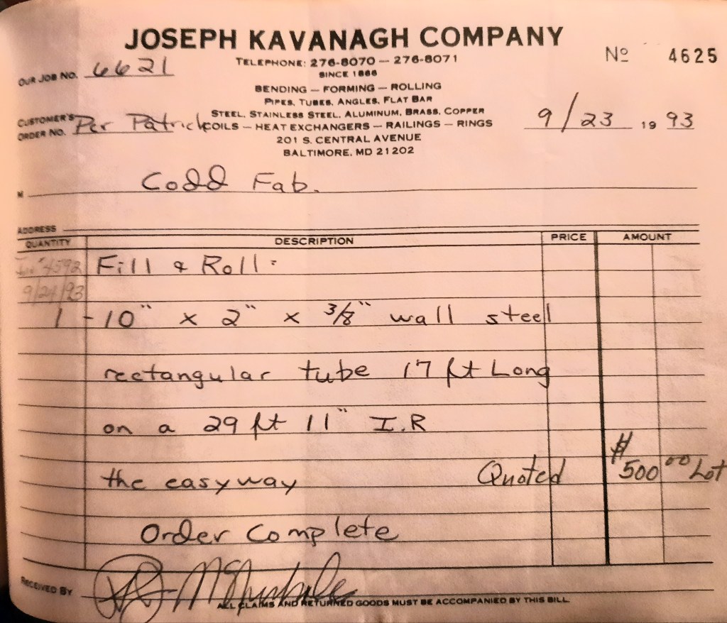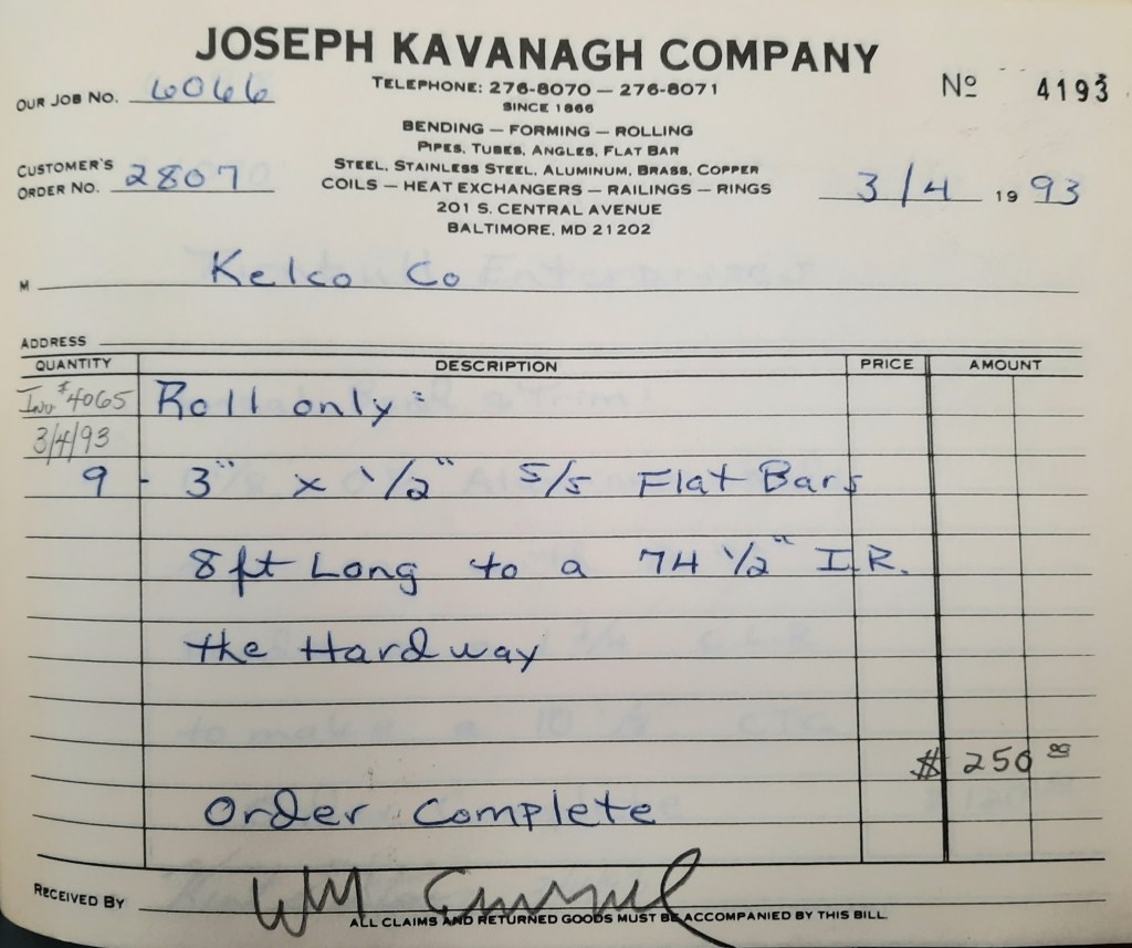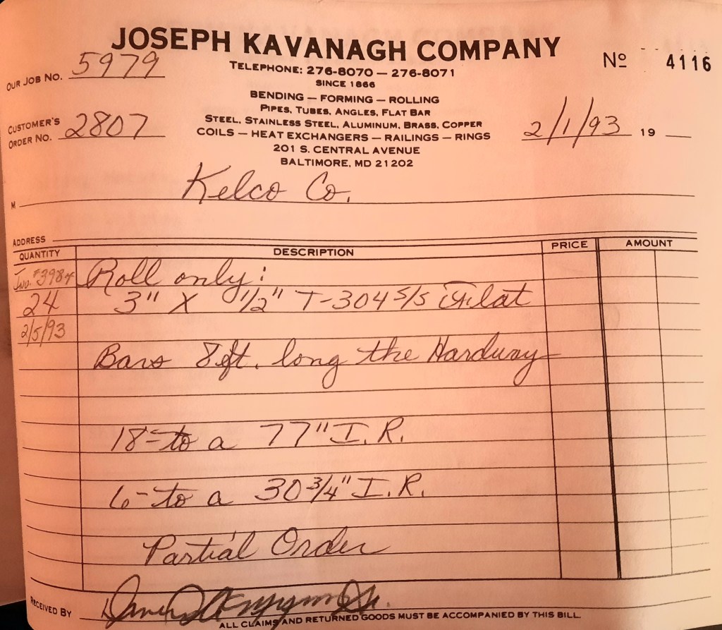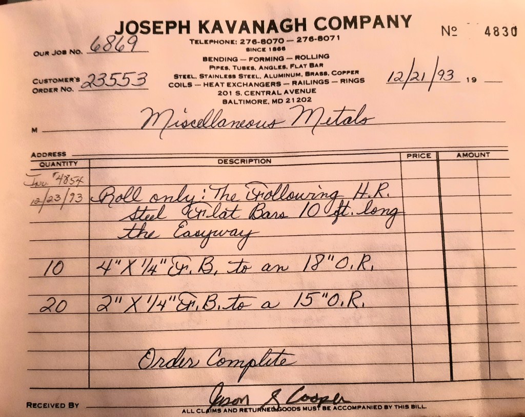 Joseph Kavanagh Company Delivery Ticket. Miscellaneous Metals Job. January 4, 1993.
