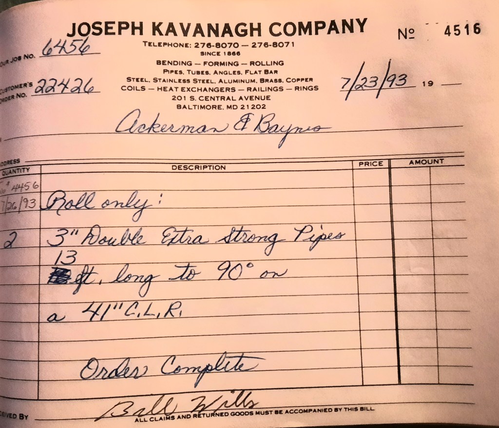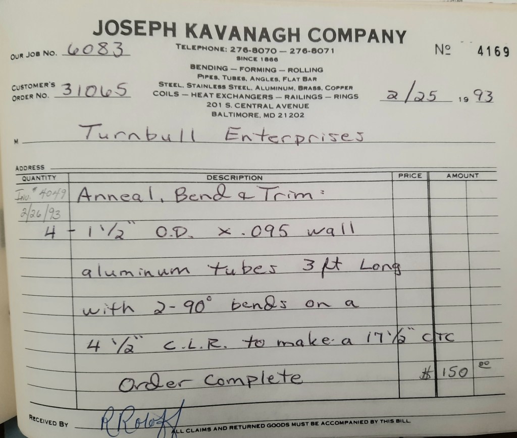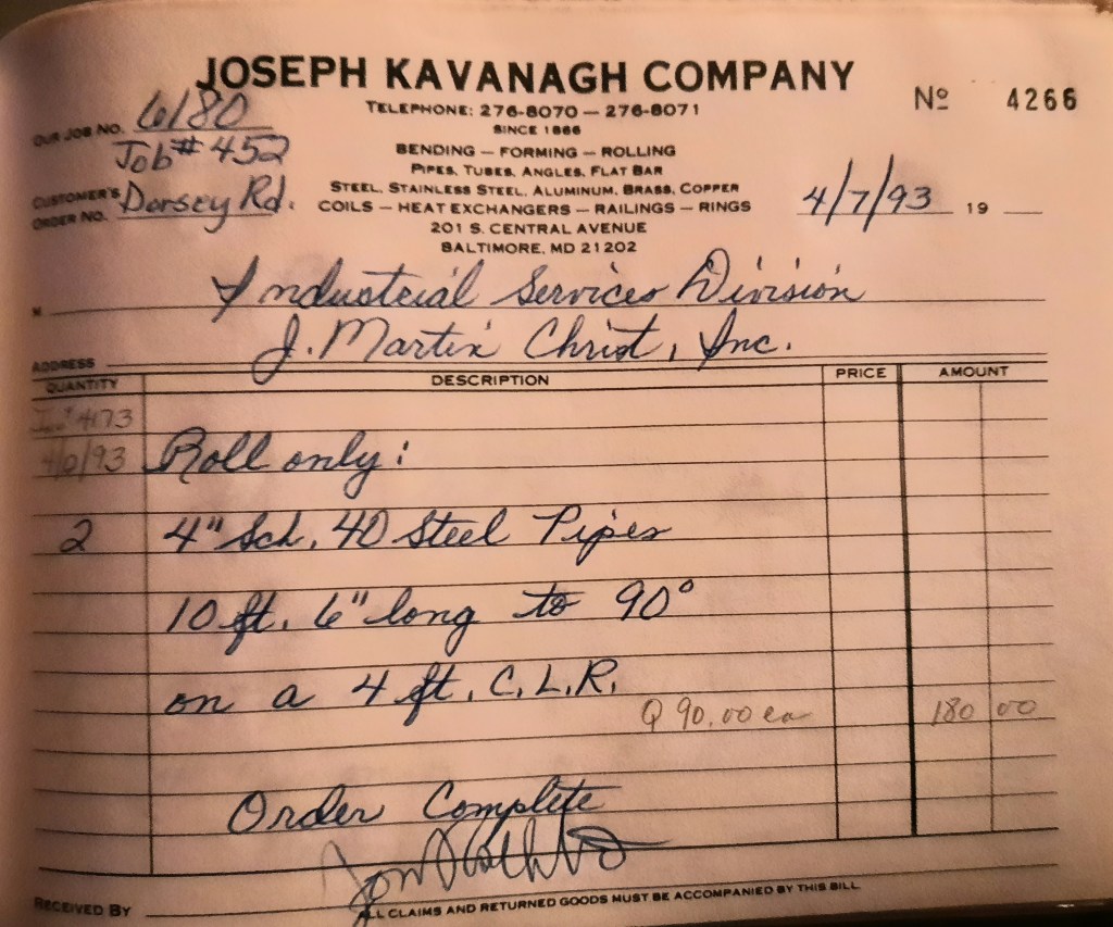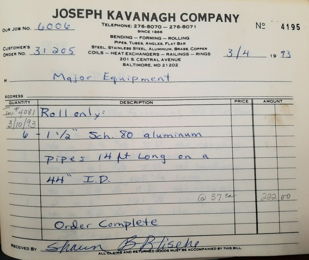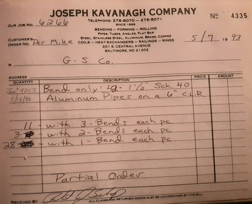 Spring has finally truly sprung and it’s a beautiful day in Baltimore. Ann, Jack and I order lunch from Haussner’s and I drive down and pick up turkey clubs for us. This is a little treat we give ourselves once or twice a month. We talk about the schedule and some bids we have out. Jack reminds me some bent pipes are ready for the G-S Company then updates me on a standing order we have from C.R. Daniels. These are short aluminum elbows we have made for them for years. C.R. sends in lengths and we cut them then bend all we can get out of each piece. The count is at 800 and that’s enough to schedule a delivery.