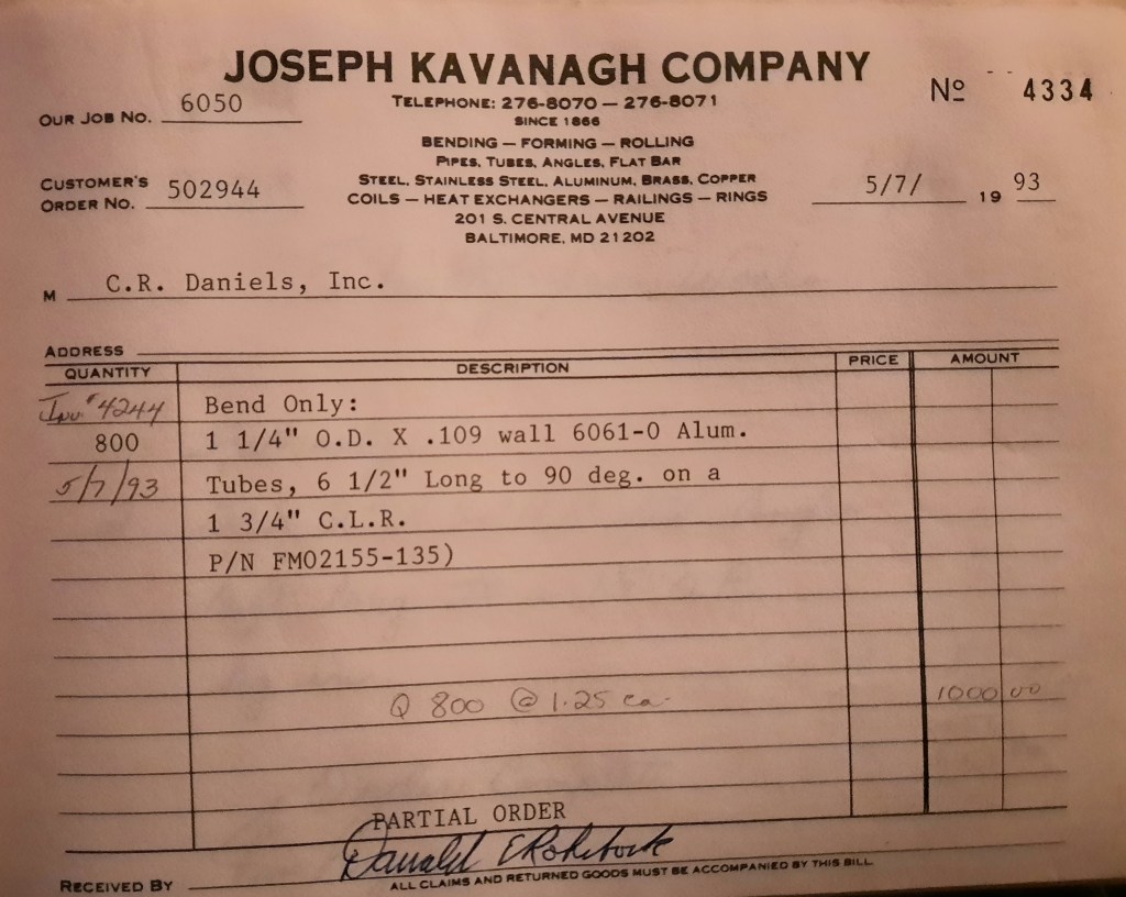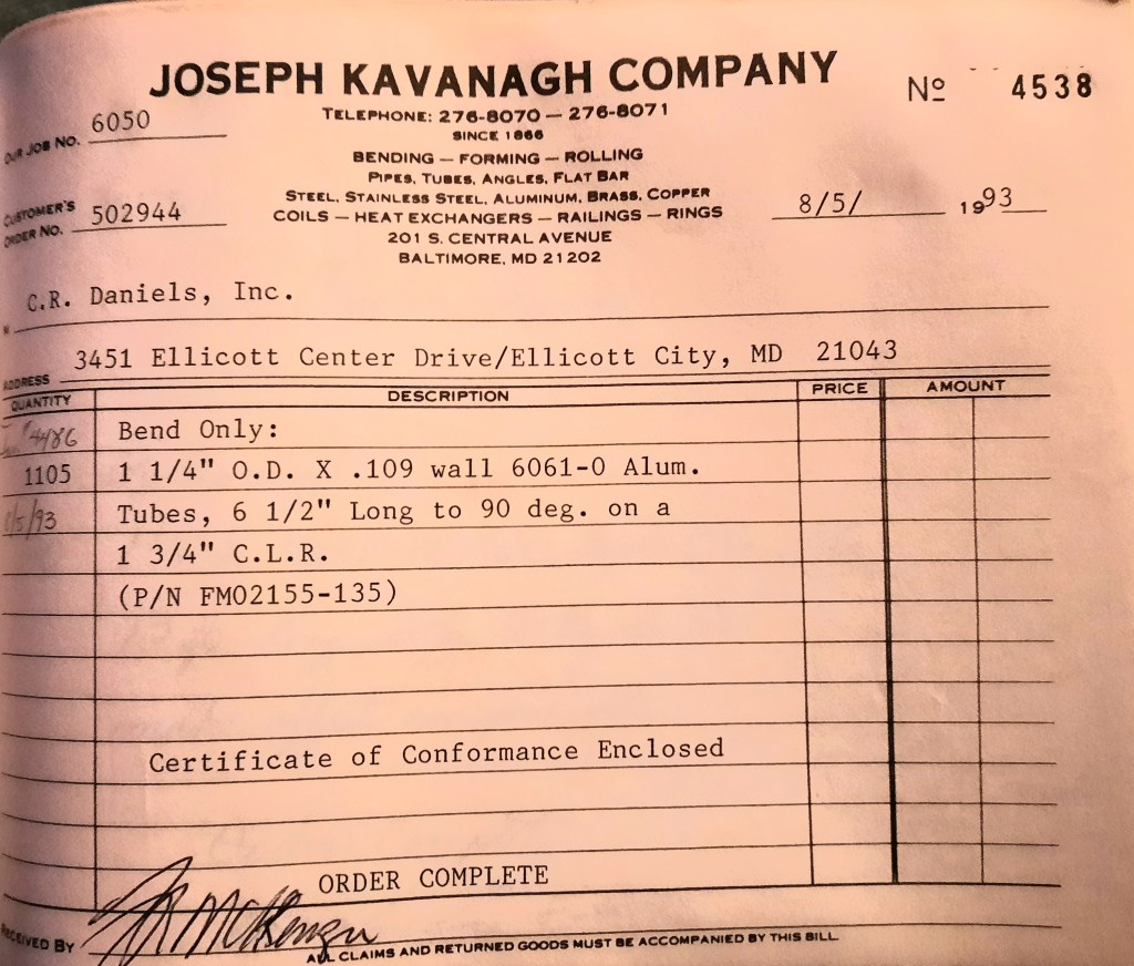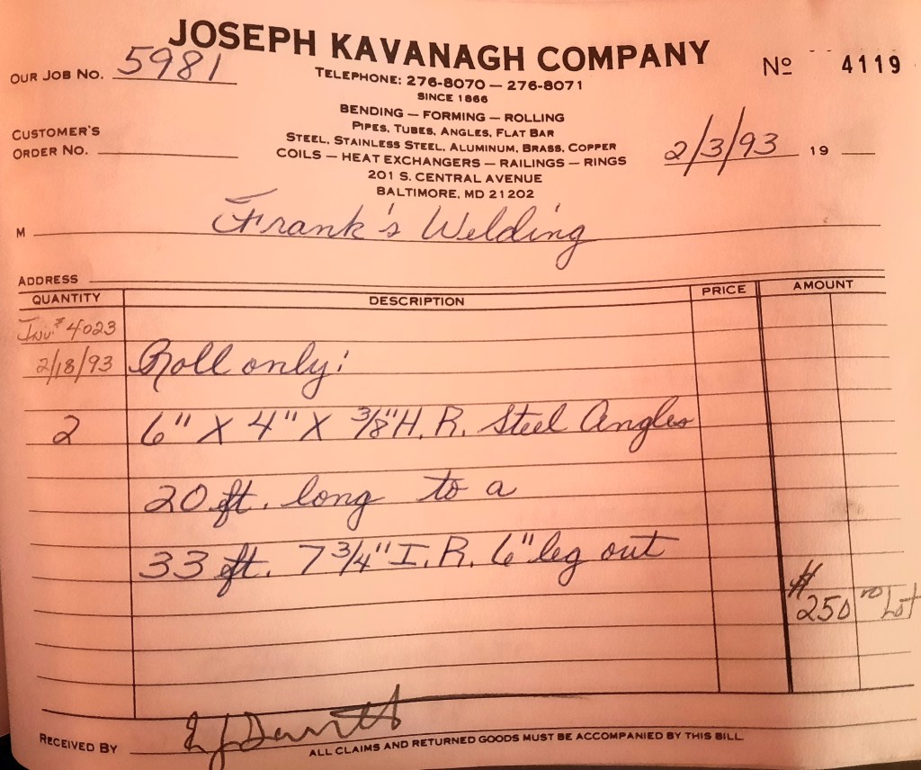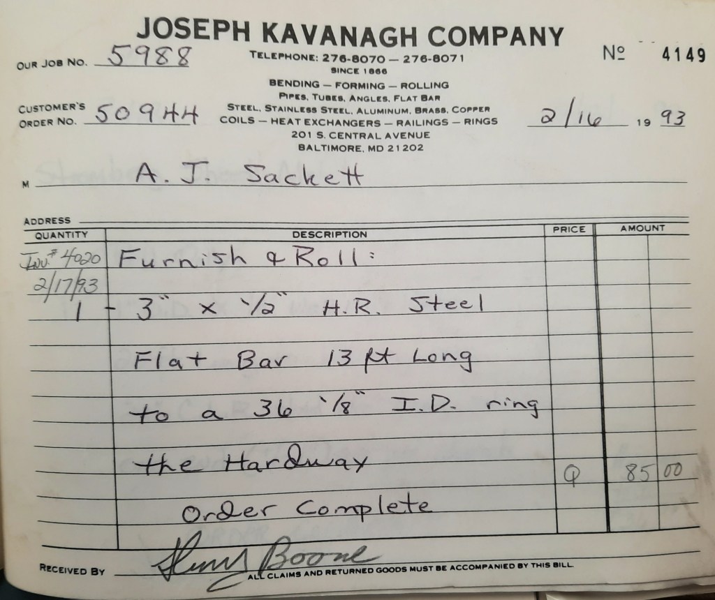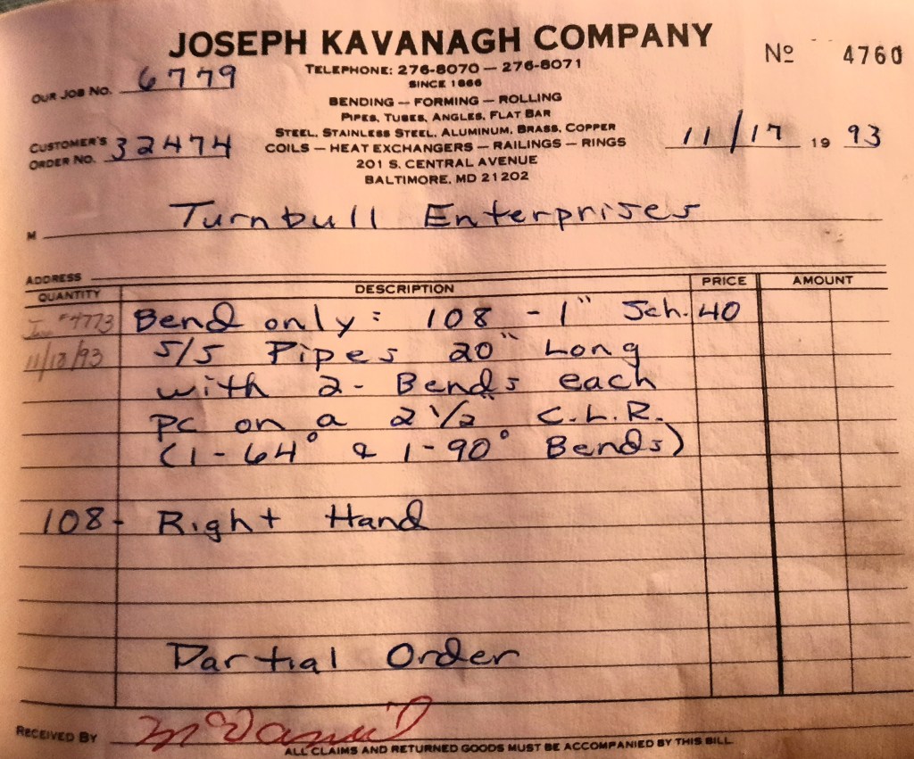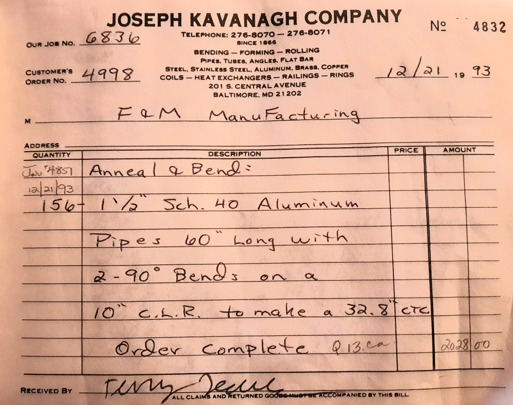 Spring has finally truly sprung and it’s a beautiful day in Baltimore. Ann, Jack and I order lunch from Haussner’s and I drive down and pick up turkey clubs for us. This is a little treat we give ourselves once or twice a month. We talk about the schedule and some bids we have out. Jack reminds me some bent pipes are ready for the G-S Company then updates me on a standing order we have from C.R. Daniels. These are short aluminum elbows we have made for them for years. C.R. sends in lengths and we cut them then bend all we can get out of each piece. The count is at 800 and that’s enough to schedule a delivery.
