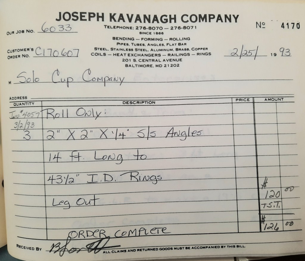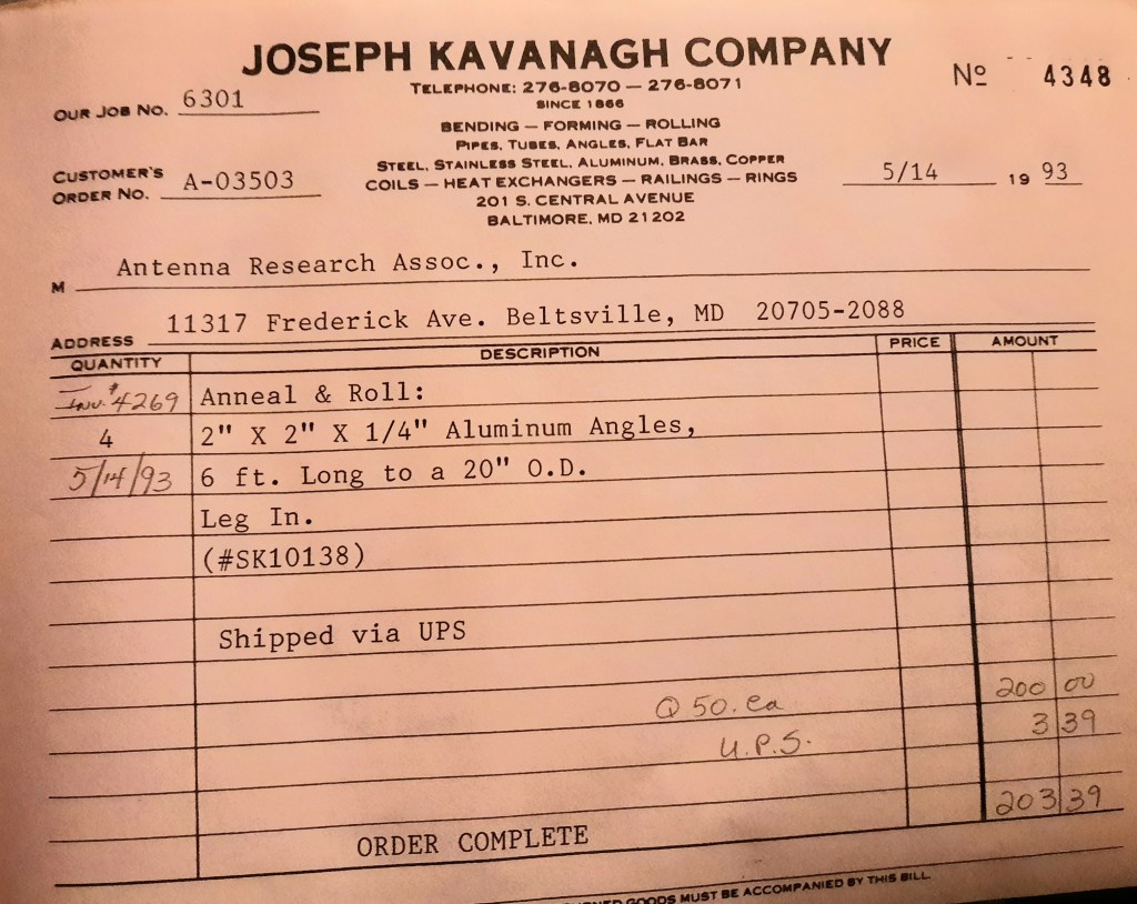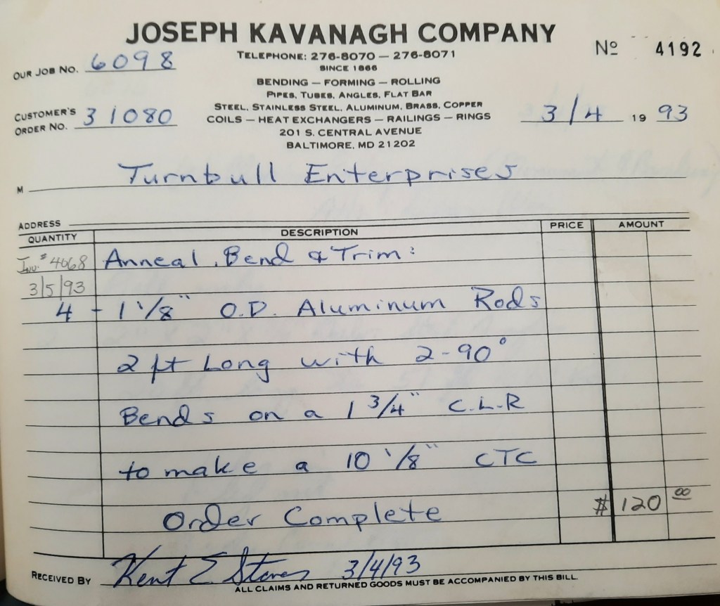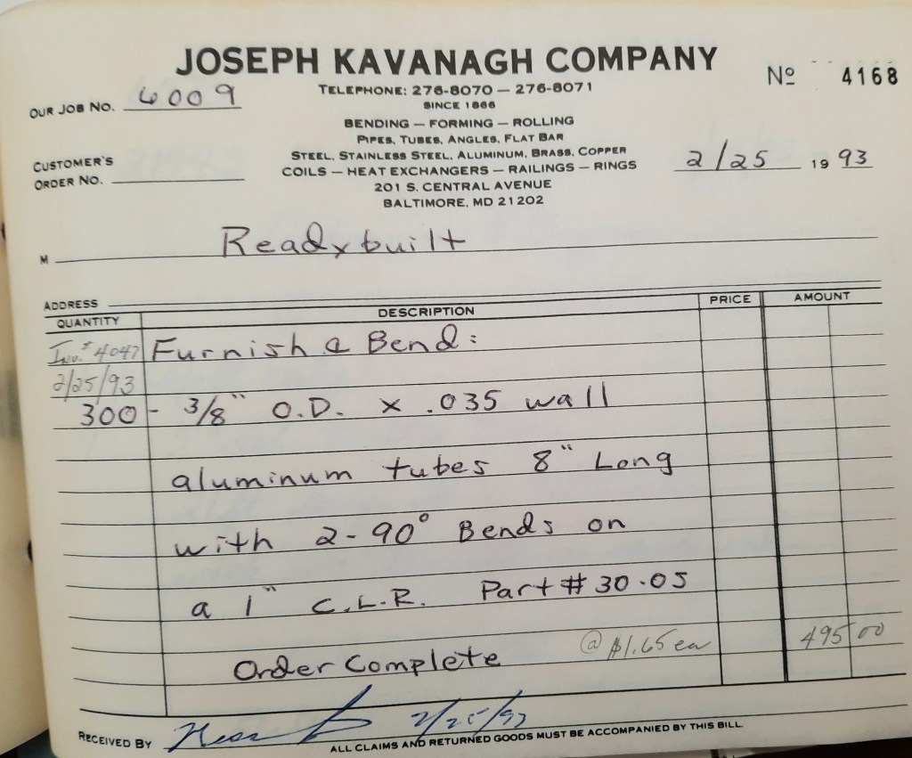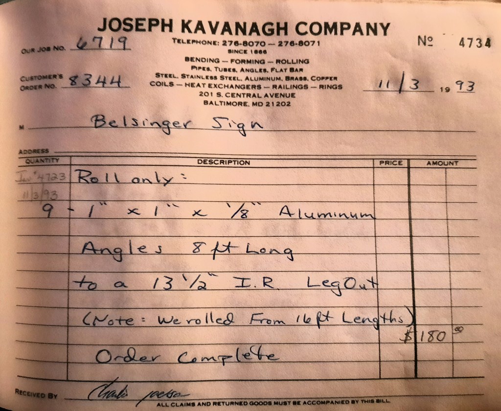 Spring has finally truly sprung and it’s a beautiful day in Baltimore. Ann, Jack and I order lunch from Haussner’s and I drive down and pick up turkey clubs for us. This is a little treat we give ourselves once or twice a month. We talk about the schedule and some bids we have out. Jack reminds me some bent pipes are ready for the G-S Company then updates me on a standing order we have from C.R. Daniels. These are short aluminum elbows we have made for them for years. C.R. sends in lengths and we cut them then bend all we can get out of each piece. The count is at 800 and that’s enough to schedule a delivery.
