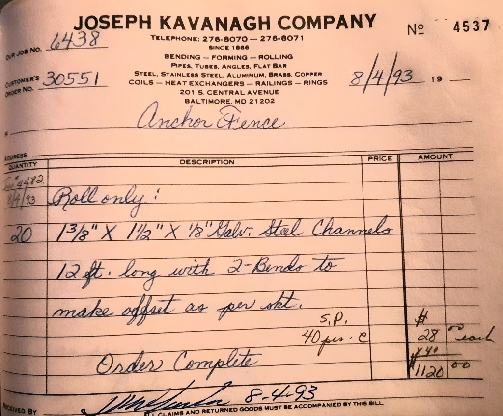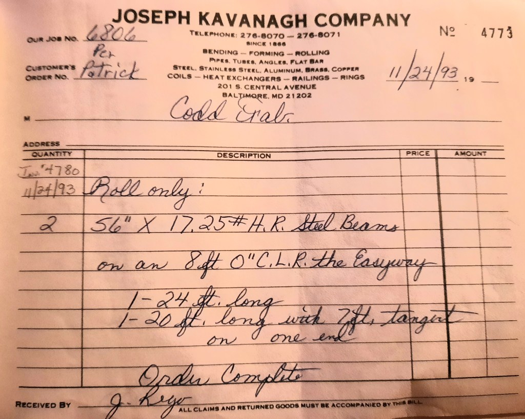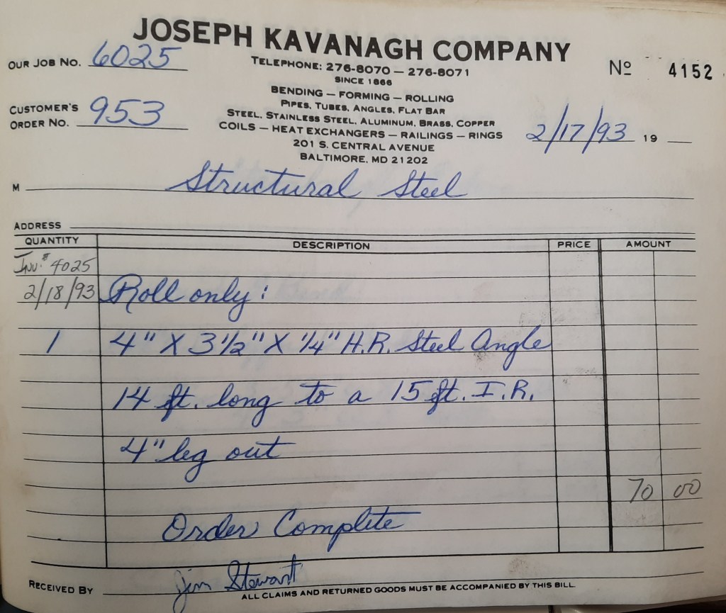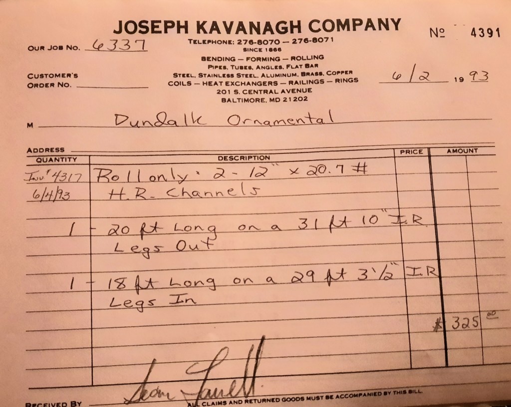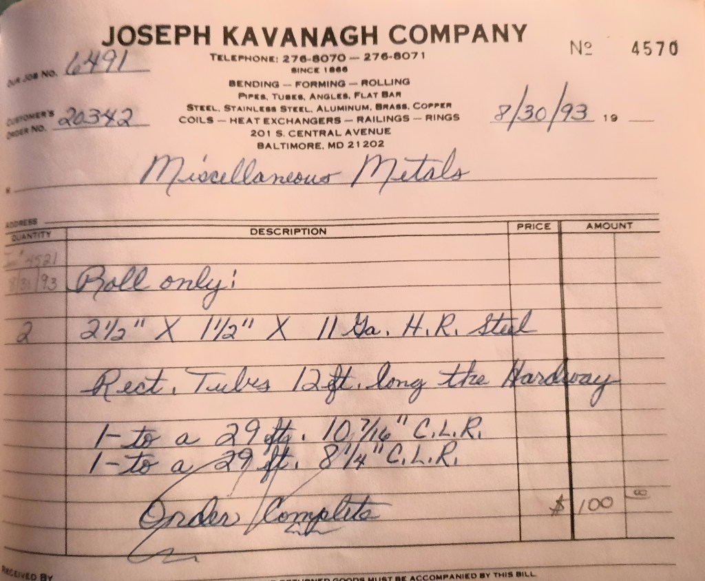Joseph Kavanagh Company Delivery Ticket. Miscellaneous Metals job. January 4, 1993.