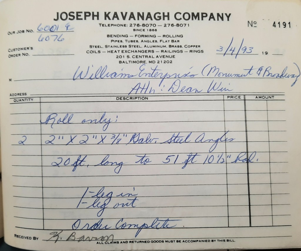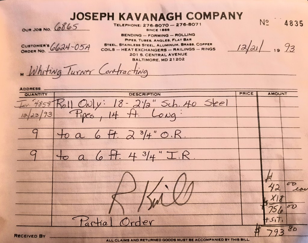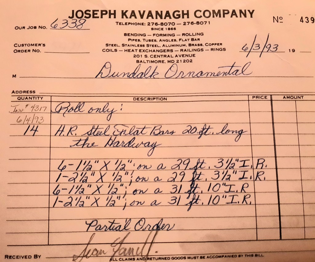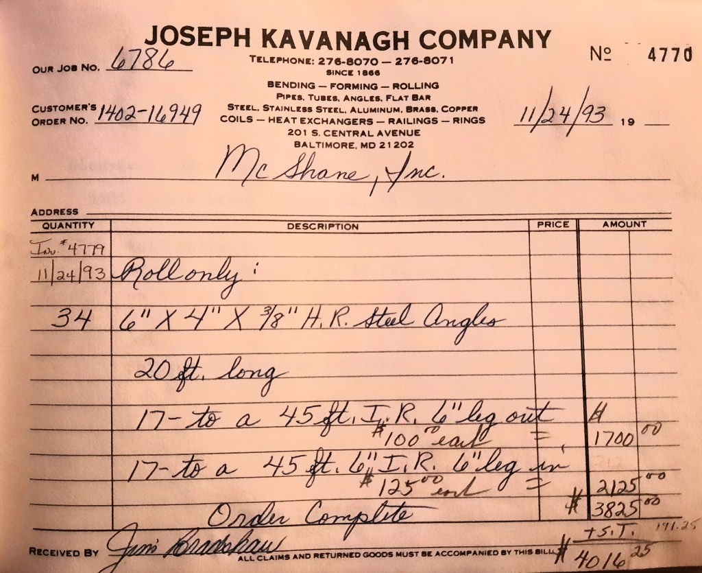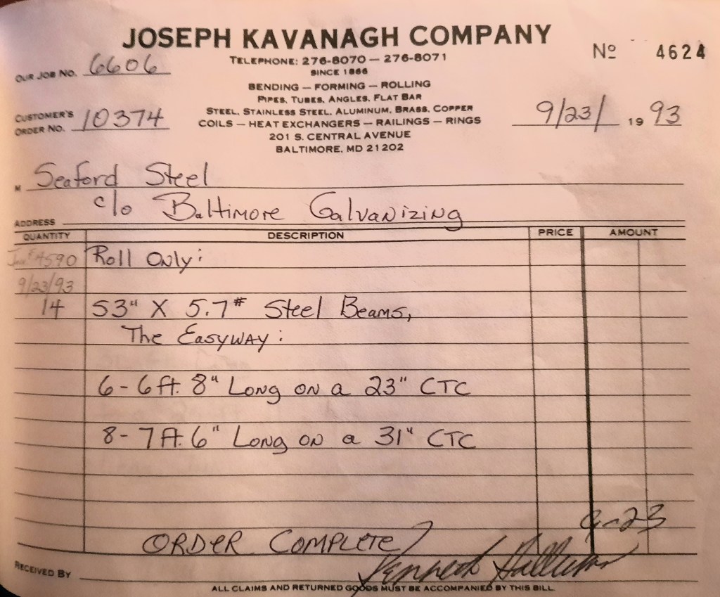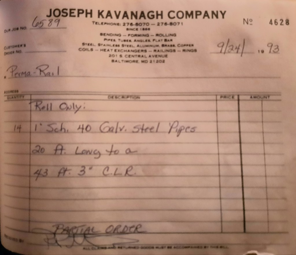 Joseph Kavanagh Company Delivery Ticket. Miscellaneous Metals job. January 4, 1993.