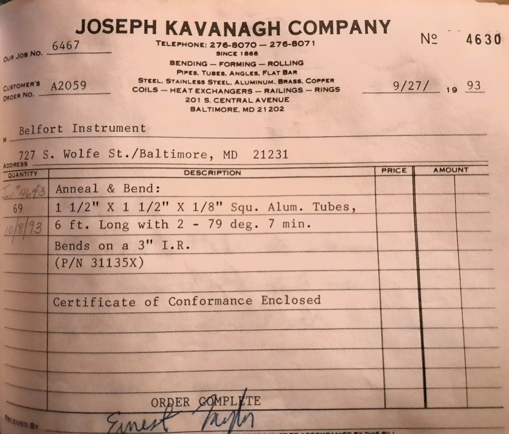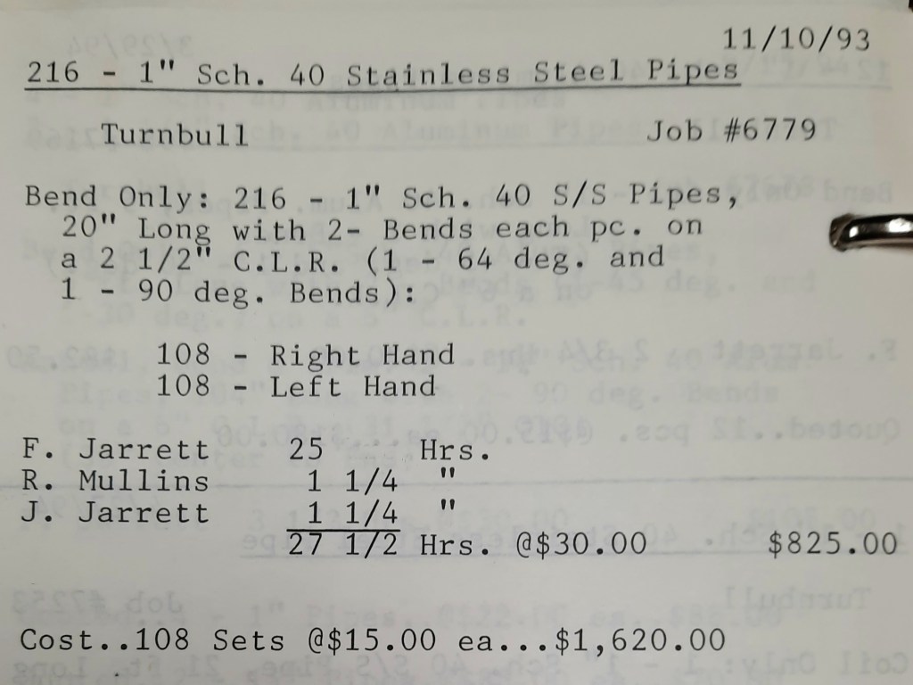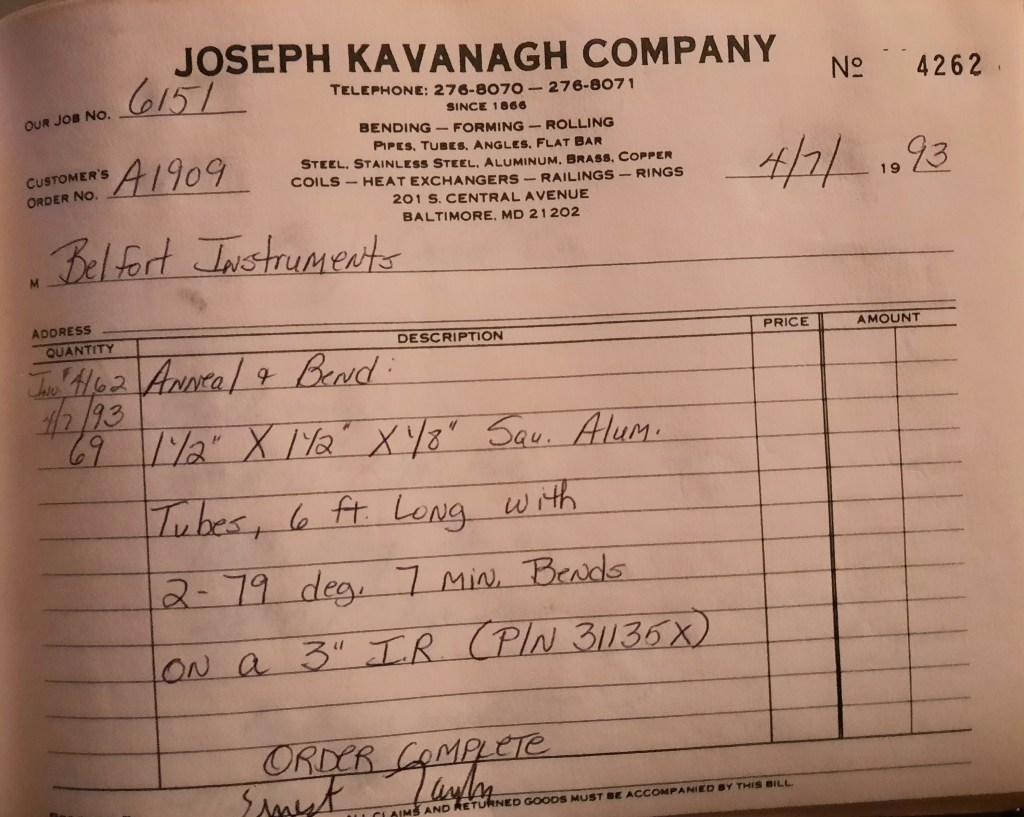Jack and I spend afternoon break in the Shop talking to all the crew. It’s the usual baseball talk this time of year and the opening day loss is discussed. As the boys disperse, my brother and I head upstairs to check the status of an order for Belfort Instruments. This is a recurring job of some square aluminum tubes that are bent in the New Pines Bender. These require annealing too and Jack has been overseeing this job directly. I double check if Jack needs any help but he has this one well in hand. I head down the steps and into the office. I call Codd, Parks Reliable Fabricators, Parrot Materials, and J. Martin Christ Company to arrange pick ups for each. After ten minutes on the phone, I begin calculating the tube bending schedule for a heat exchanger for the Housing Authority.