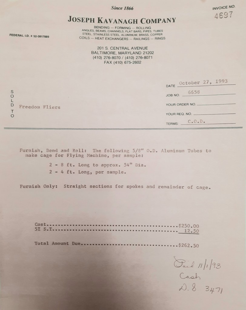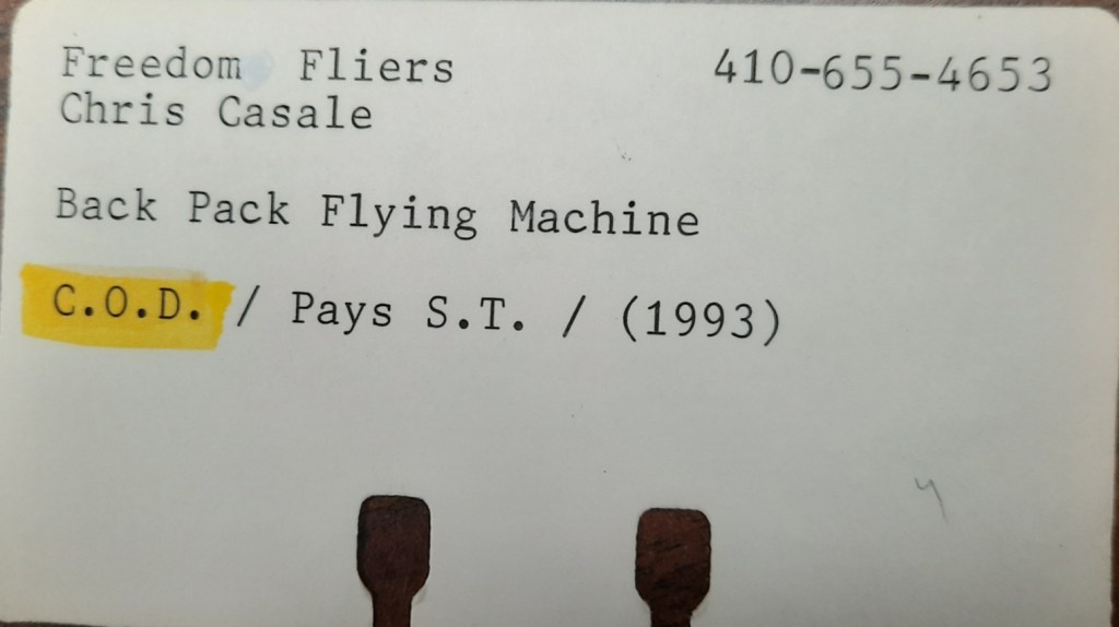 I watch as the crew load Miscellaneous Metals’ truck. We had a few trucks picking up material today so that means some billing, always a good thing. As I am about to head up the steps to the office, a man comes through the front door. I stare quizzically at him as he explains he has an idea for a backpack flying machine as he calls it. He has drawings and a rudimentary model of what he’s making. It’s a para-glider with a motorized propeller in a cage to drive it. He needs some tubes bent and rolled for the cage. I ask out of curiosity what he plans to do and he tells me he would like to rent them out at parks for instance Patterson Park. People would pay by the half hour to fly around the park. He’s very sure it will be the next big thing. I am skeptical but make some notes and promise to get him a price. I climb the stairs to the office and tell my brother and sister about it.