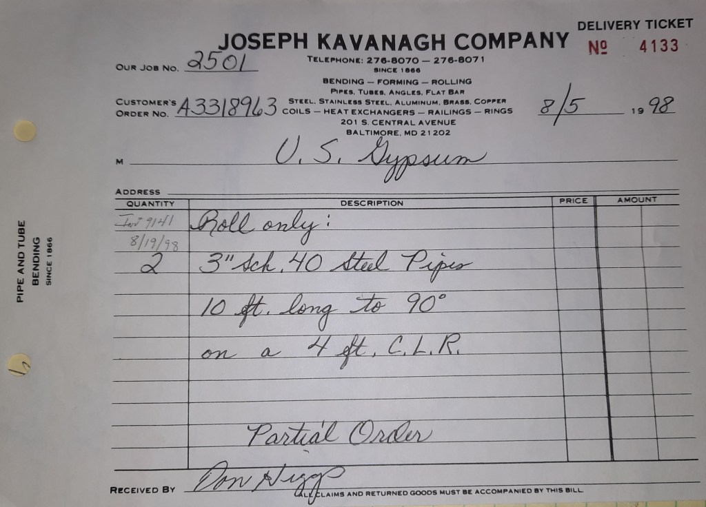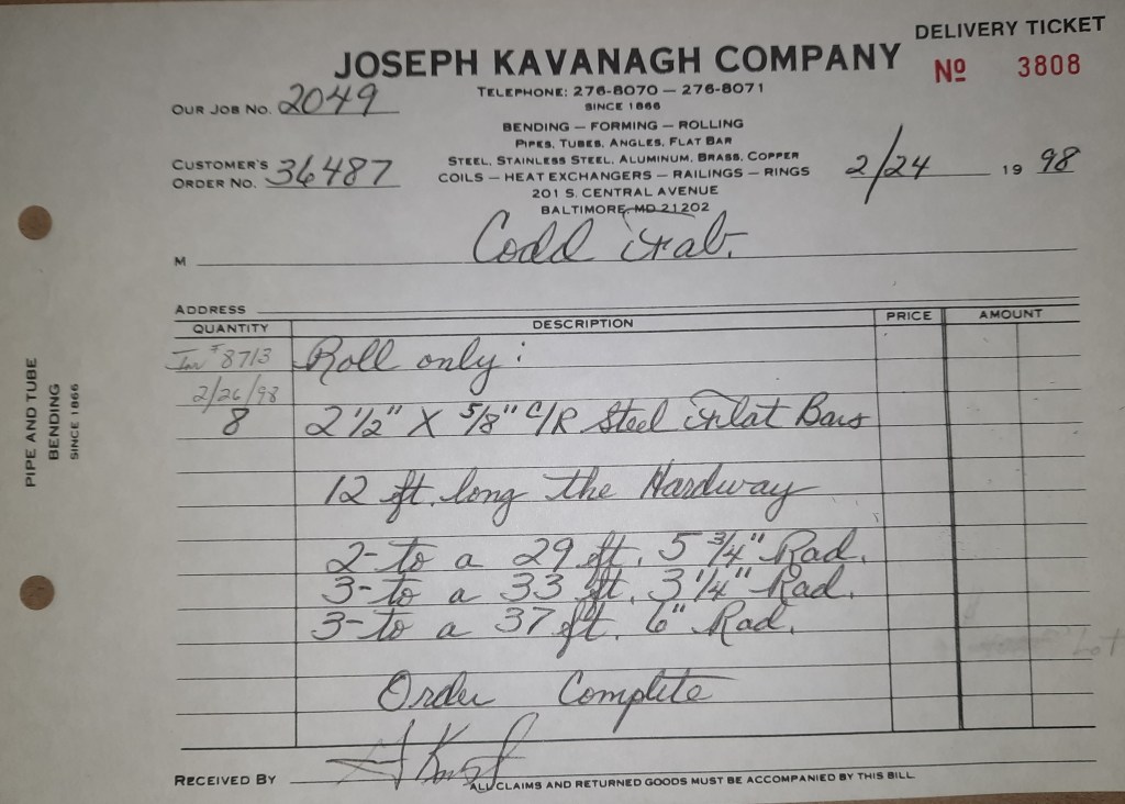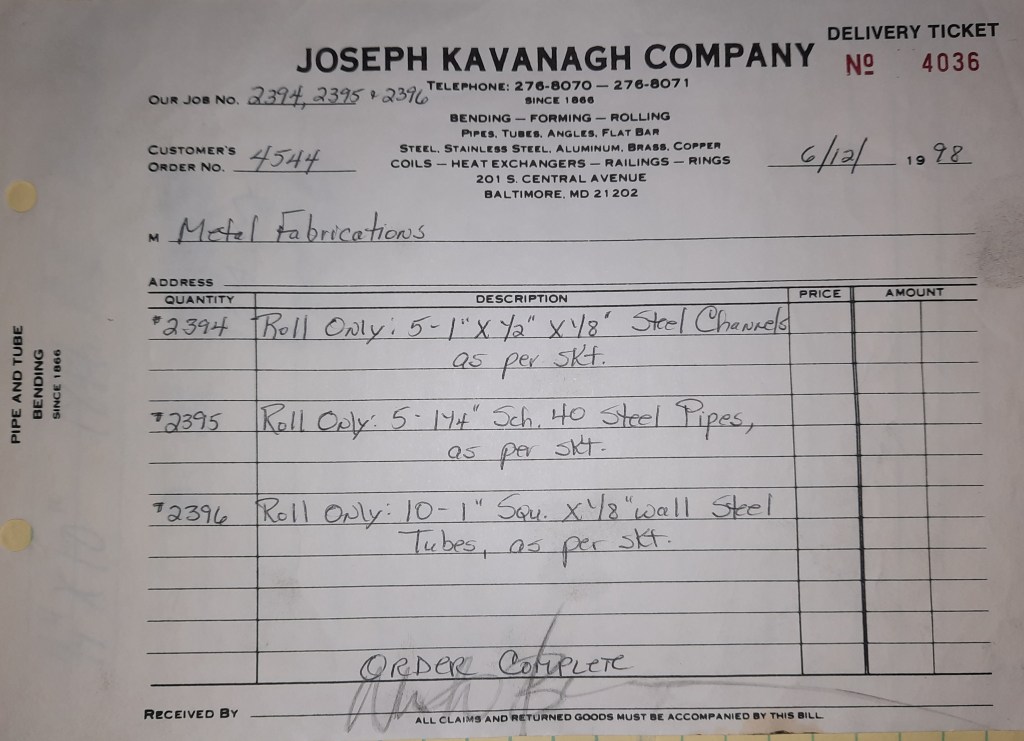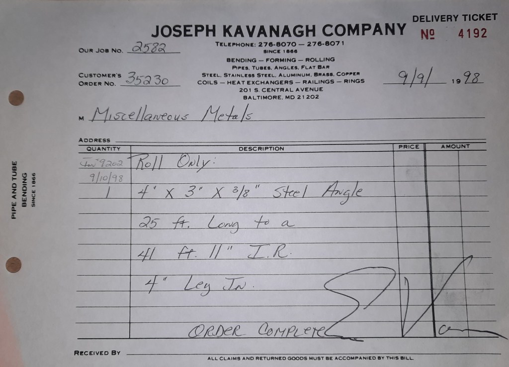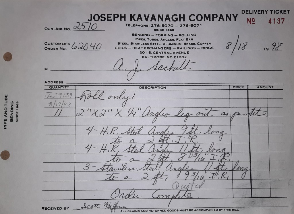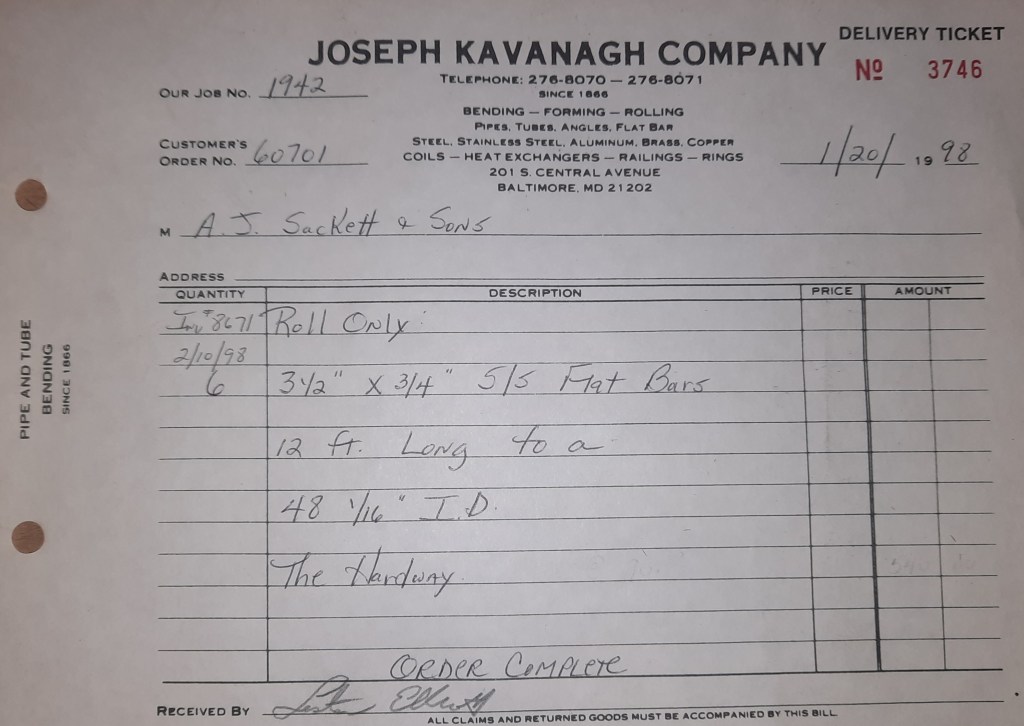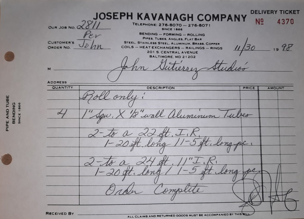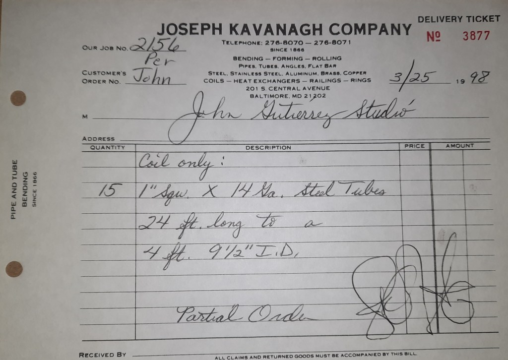 Baseball season is almost upon us and I cannot wait. Opening Day is next week and after such a good year in 1997, I’m hoping for more of the same. One big change for the Orioles is a new manager. Davey Johnson resigned after last season. Rumors of some falling out between him and ownership abound but I don’t really know. The Birds promoted Pitching Coach Ray Miller to skipper and I think he’ll do well. We knock out a few jobs this week for our usual local fab shops and one for a long distance customer, Machine Shop of Murfreesboro in NC. We also finish some work for the John Gutierrez Studio. John is a sculptor primarily but also a true metalsmith. He’s the sort of fellow I liked as soon as I met him. One day he walked into my office in an army jacket to discuss a job all the while eating Goetze’s caramels from Ann’s candy jar. Yes, you could say I liked him from the start.