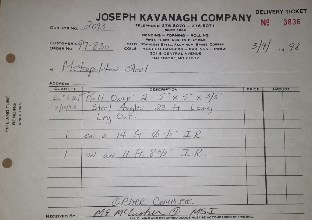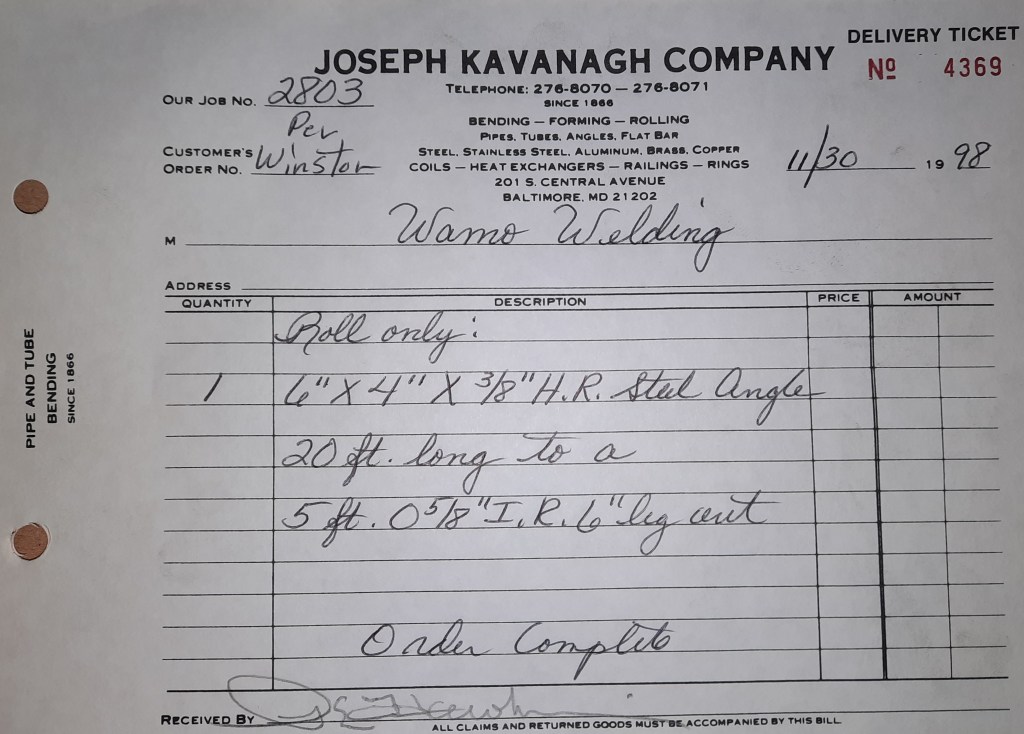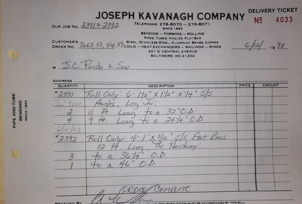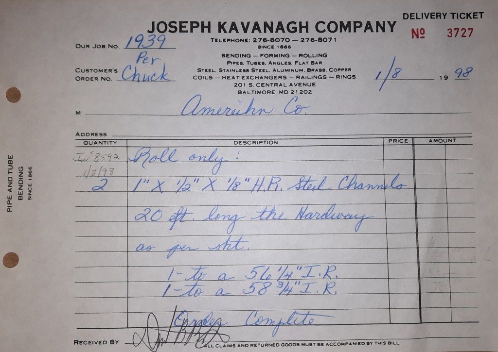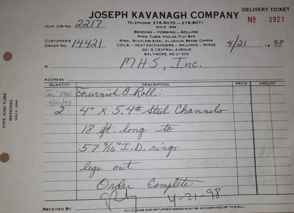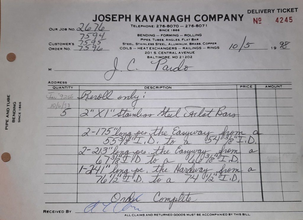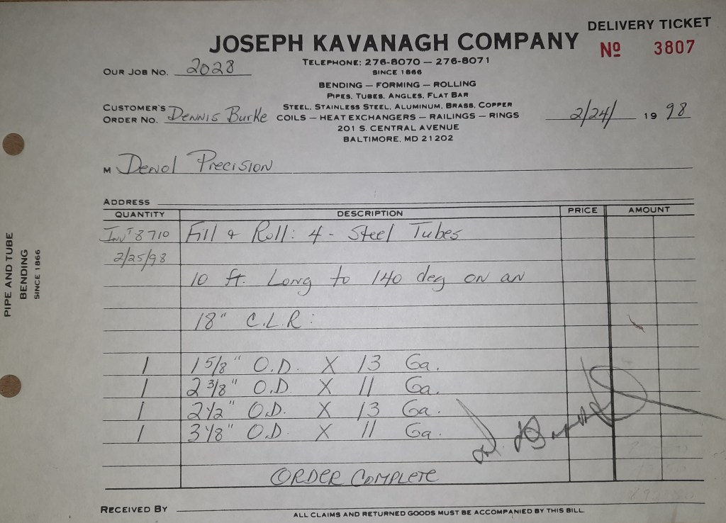 Baseball season is almost upon us and I cannot wait. Opening Day is next week and after such a good year in 1997, I’m hoping for more of the same. One big change for the Orioles is a new manager. Davey Johnson resigned after last season. Rumors of some falling out between him and ownership abound but I don’t really know. The Birds promoted Pitching Coach Ray Miller to skipper and I think he’ll do well. We knock out a few jobs this week for our usual local fab shops and one for a long distance customer, Machine Shop of Murfreesboro in NC. We also finish some work for the John Gutierrez Studio. John is a sculptor primarily but also a true metalsmith. He’s the sort of fellow I liked as soon as I met him. One day he walked into my office in an army jacket to discuss a job all the while eating Goetze’s caramels from Ann’s candy jar. Yes, you could say I liked him from the start.
