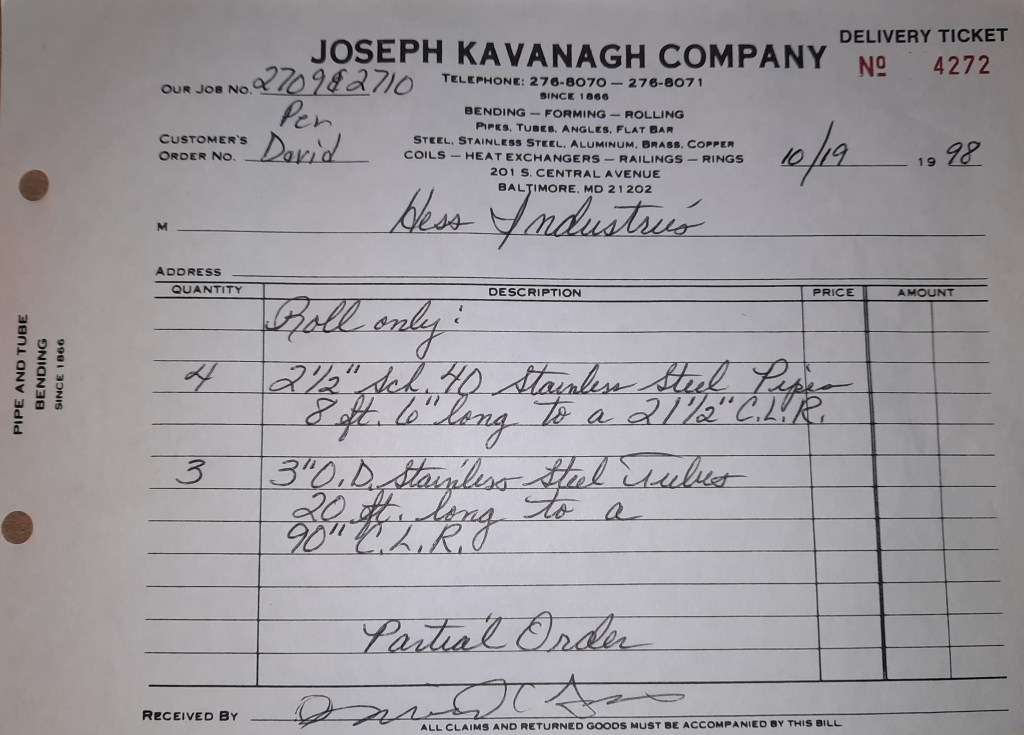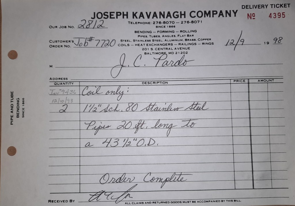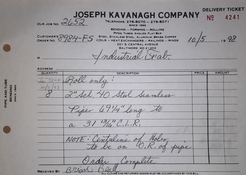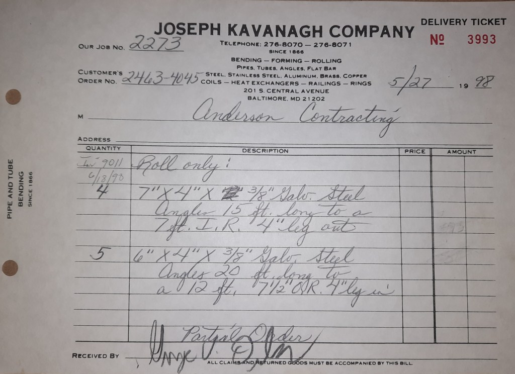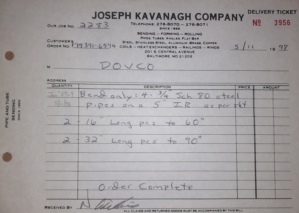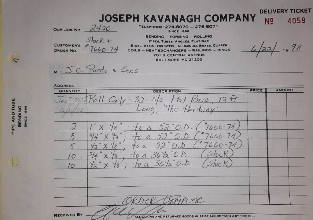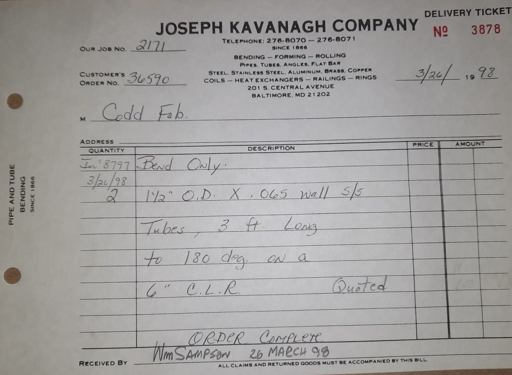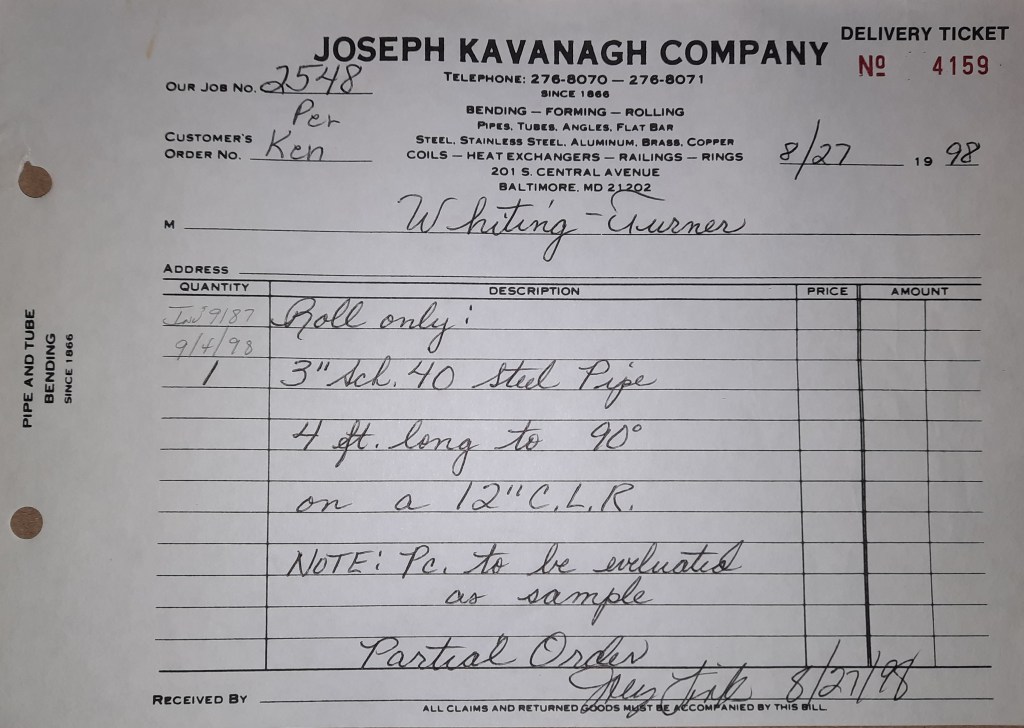 Baseball season is almost upon us and I cannot wait. Opening Day is next week and after such a good year in 1997, I’m hoping for more of the same. One big change for the Orioles is a new manager. Davey Johnson resigned after last season. Rumors of some falling out between him and ownership abound but I don’t really know. The Birds promoted Pitching Coach Ray Miller to skipper and I think he’ll do well. We knock out a few jobs this week for our usual local fab shops and one for a long distance customer, Machine Shop of Murfreesboro in NC. We also finish some work for the John Gutierrez Studio. John is a sculptor primarily but also a true metalsmith. He’s the sort of fellow I liked as soon as I met him. One day he walked into my office in an army jacket to discuss a job all the while eating Goetze’s caramels from Ann’s candy jar. Yes, you could say I liked him from the start.