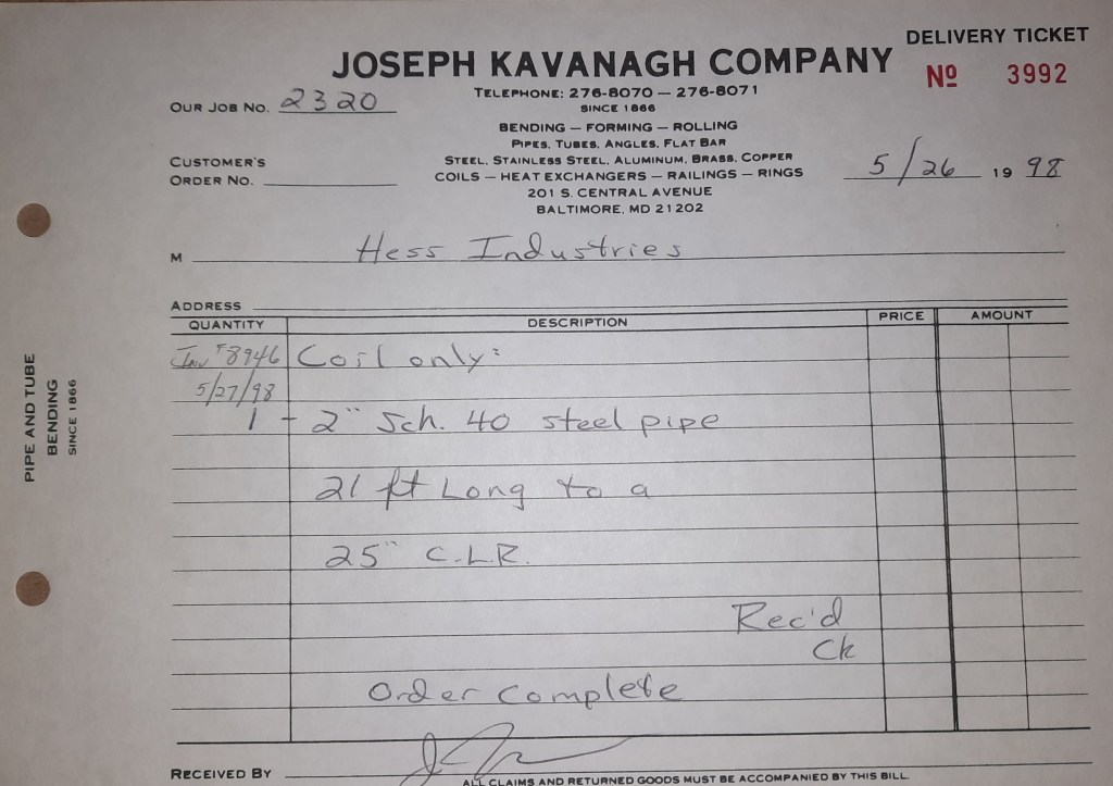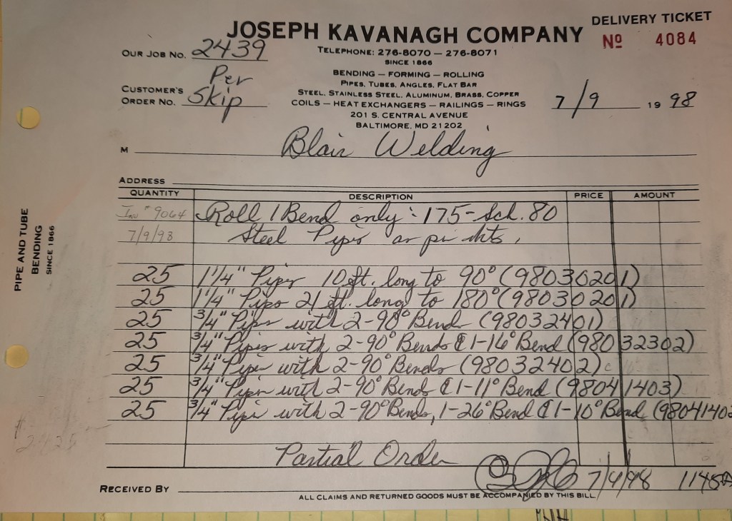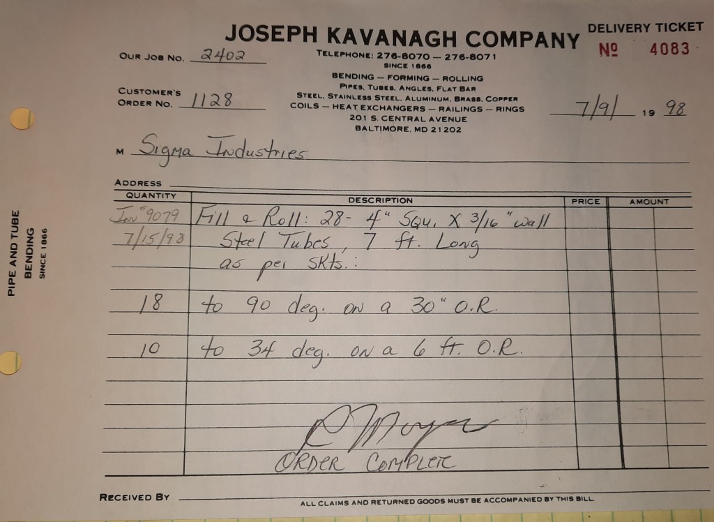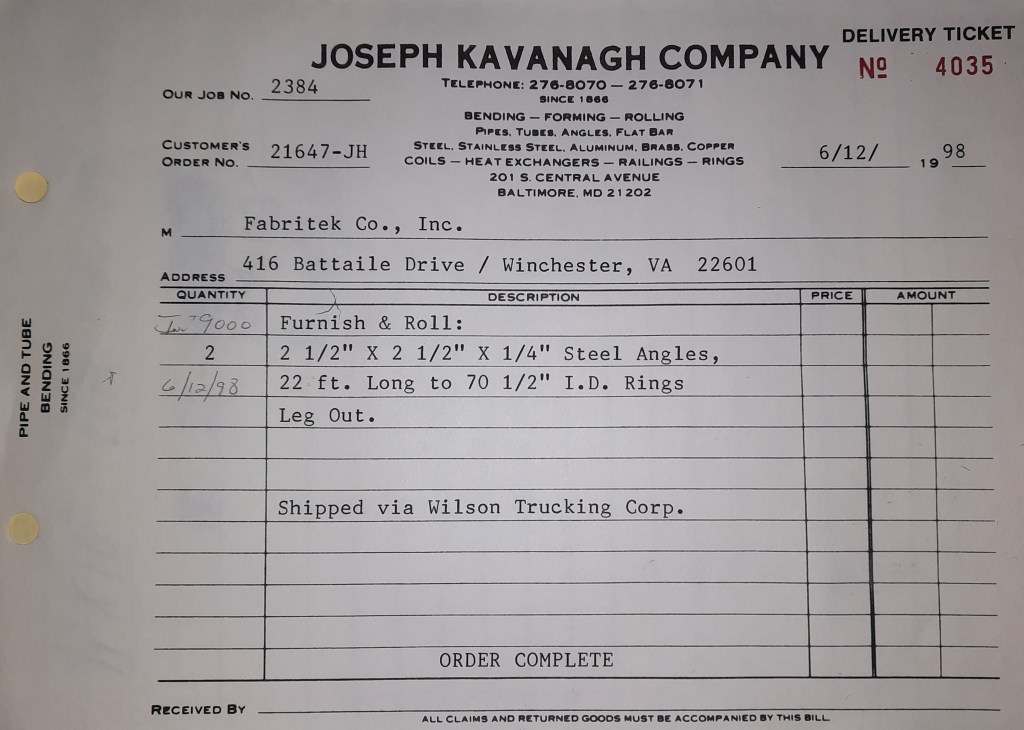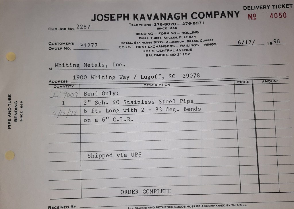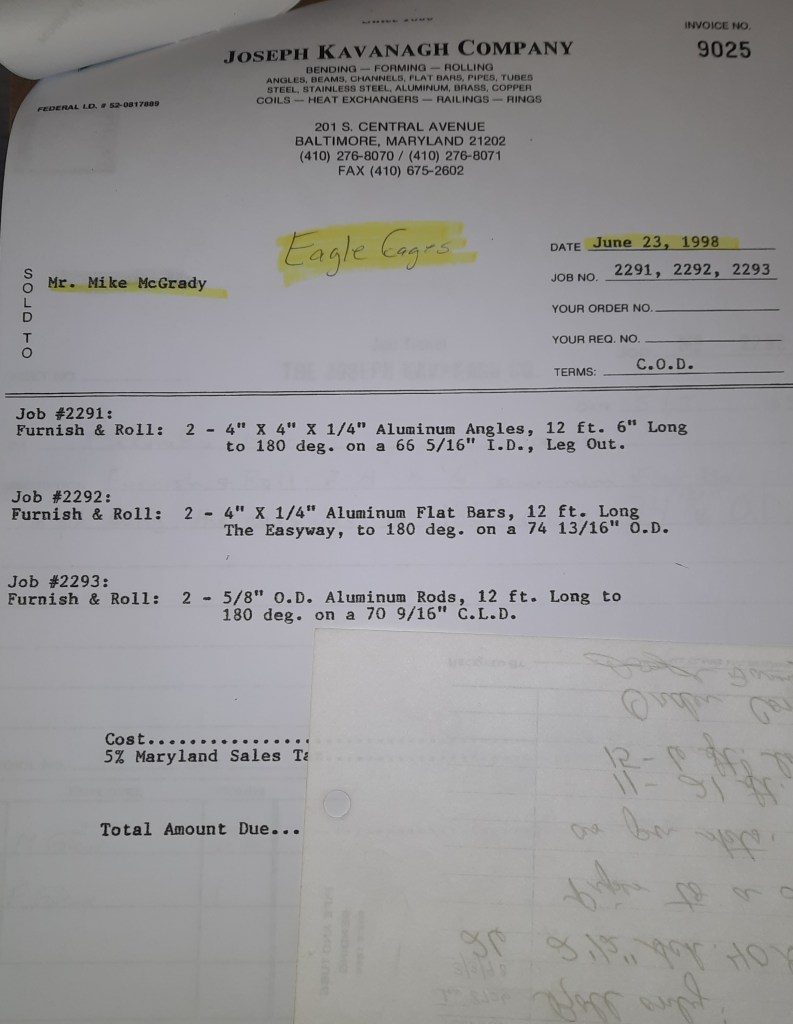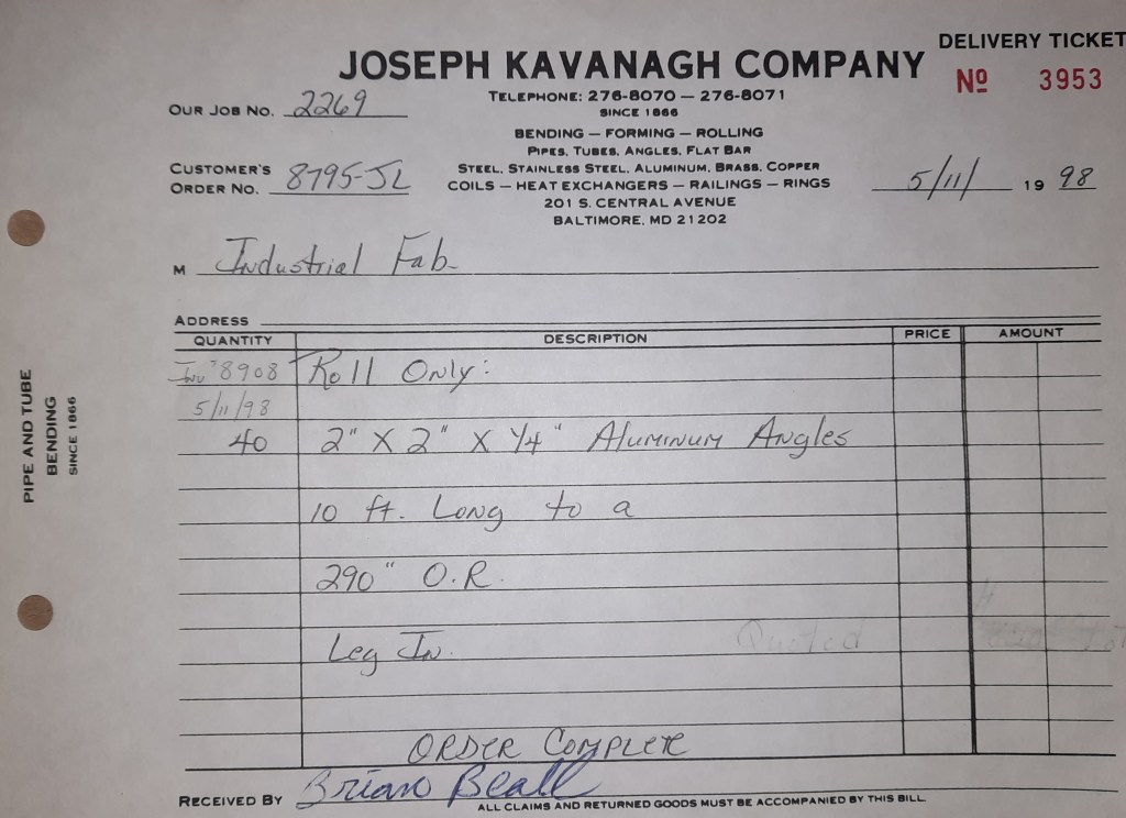 Baseball season is almost upon us and I cannot wait. Opening Day is next week and after such a good year in 1997, I’m hoping for more of the same. One big change for the Orioles is a new manager. Davey Johnson resigned after last season. Rumors of some falling out between him and ownership abound but I don’t really know. The Birds promoted Pitching Coach Ray Miller to skipper and I think he’ll do well. We knock out a few jobs this week for our usual local fab shops and one for a long distance customer, Machine Shop of Murfreesboro in NC. We also finish some work for the John Gutierrez Studio. John is a sculptor primarily but also a true metalsmith. He’s the sort of fellow I liked as soon as I met him. One day he walked into my office in an army jacket to discuss a job all the while eating Goetze’s caramels from Ann’s candy jar. Yes, you could say I liked him from the start.