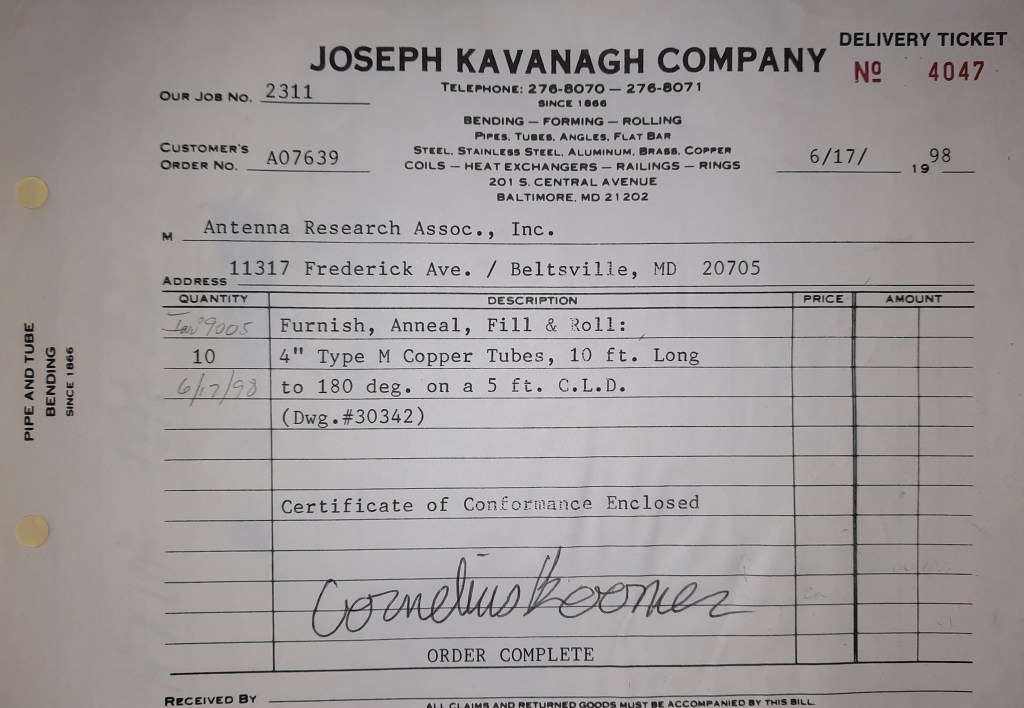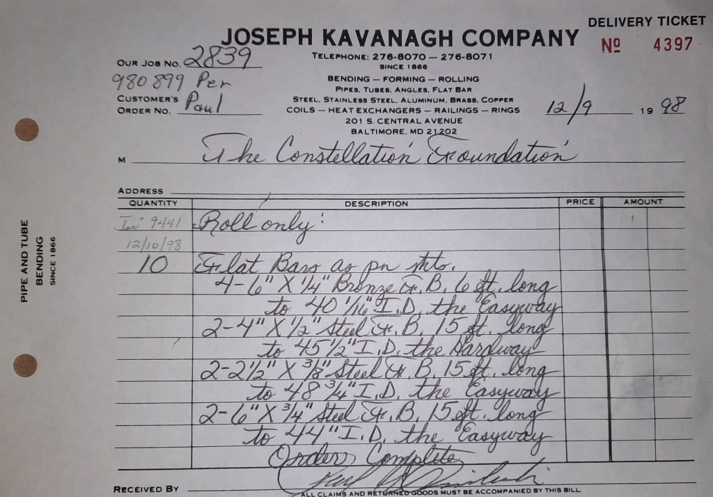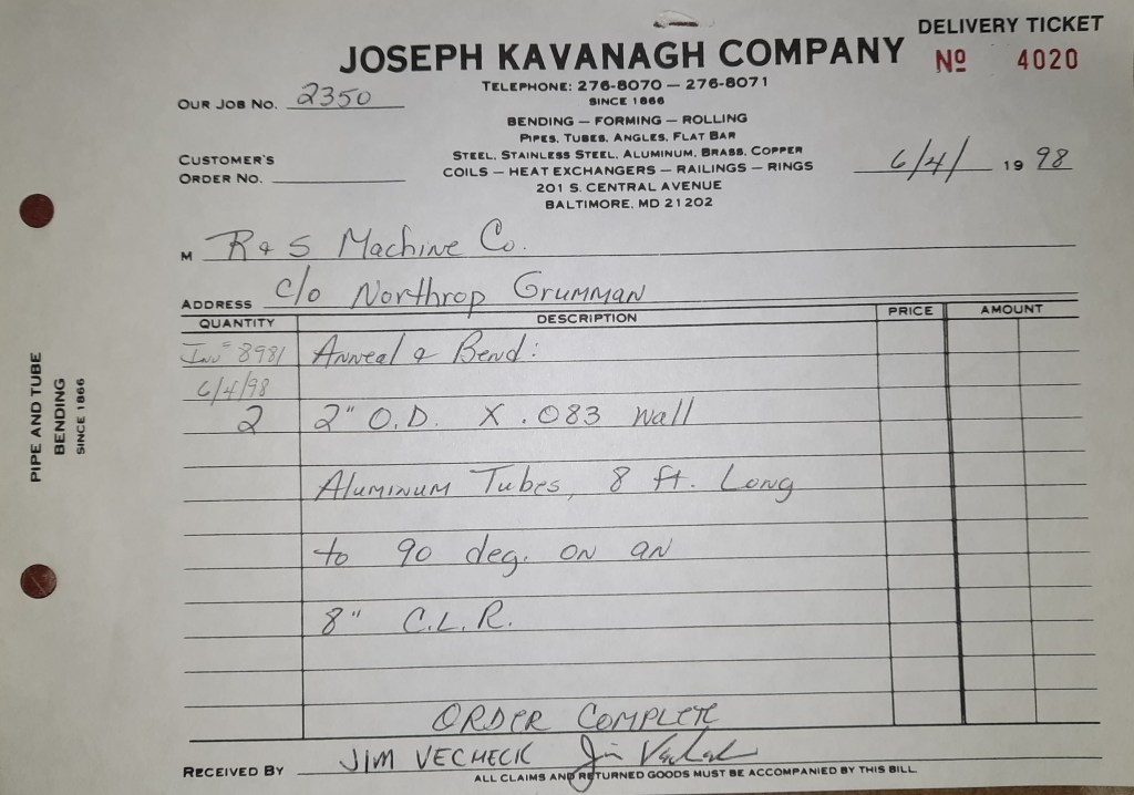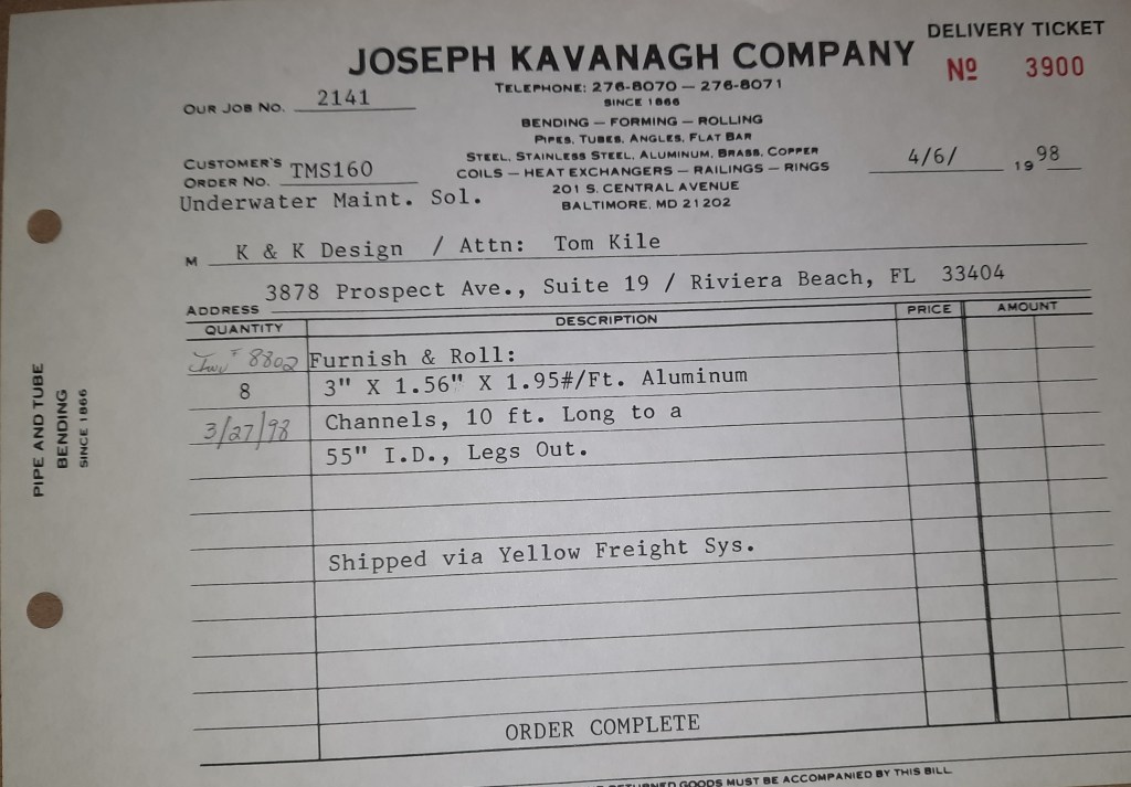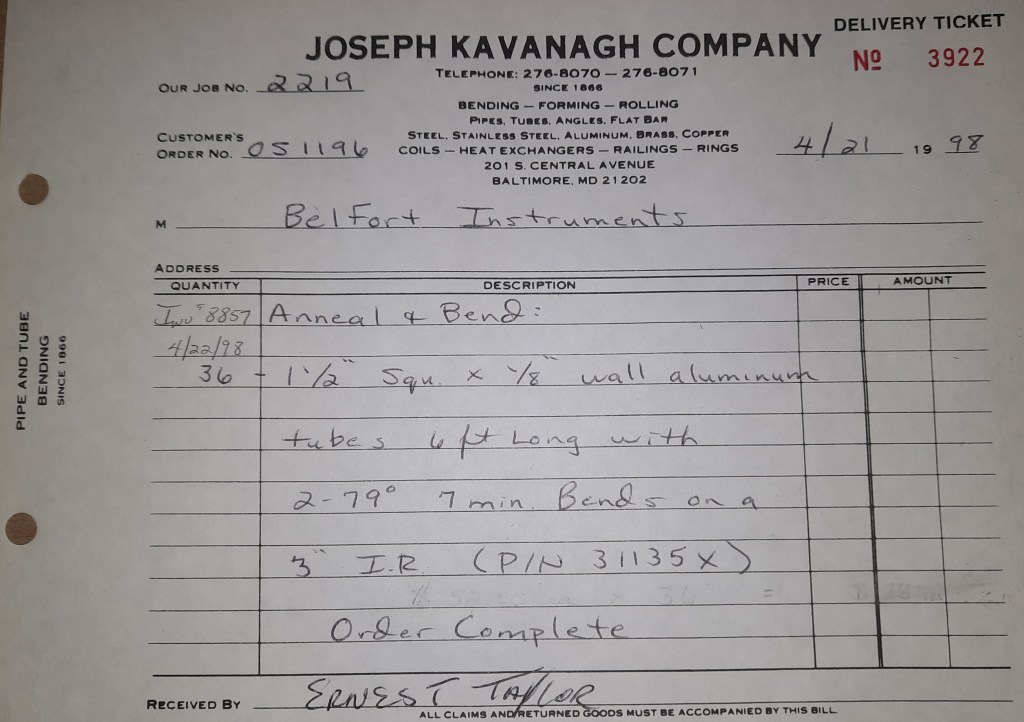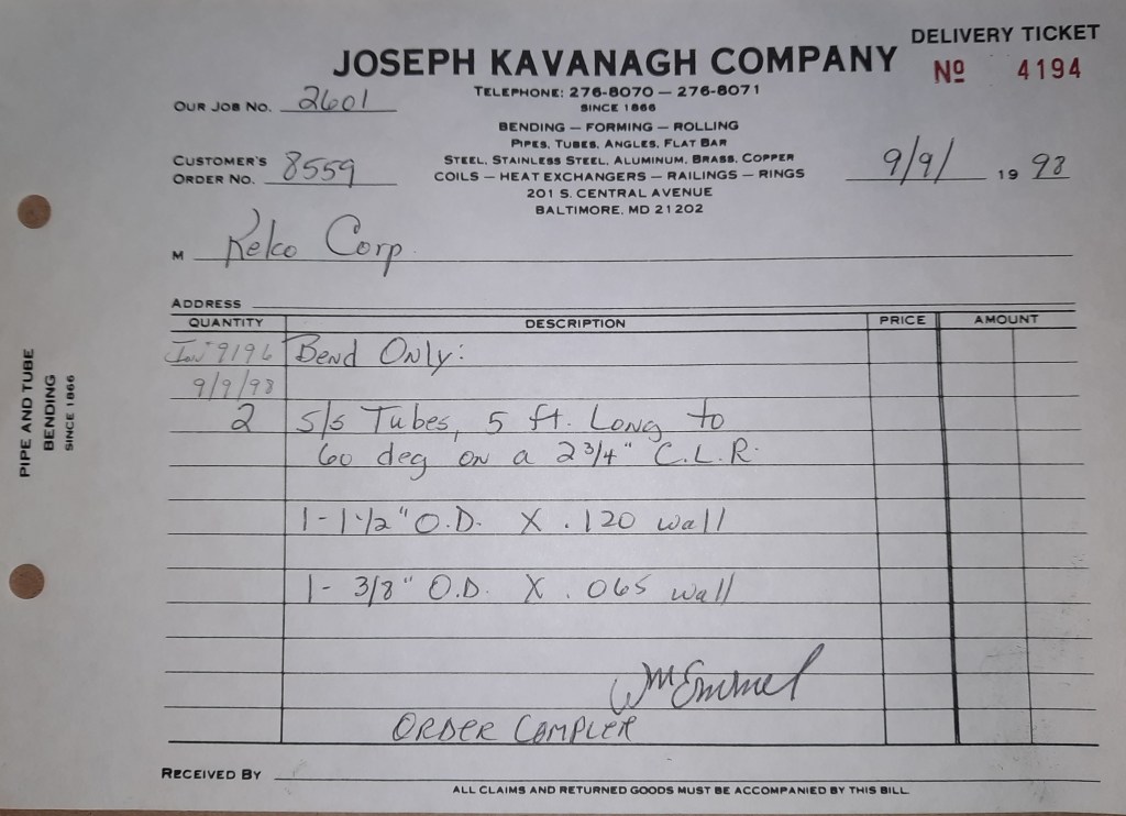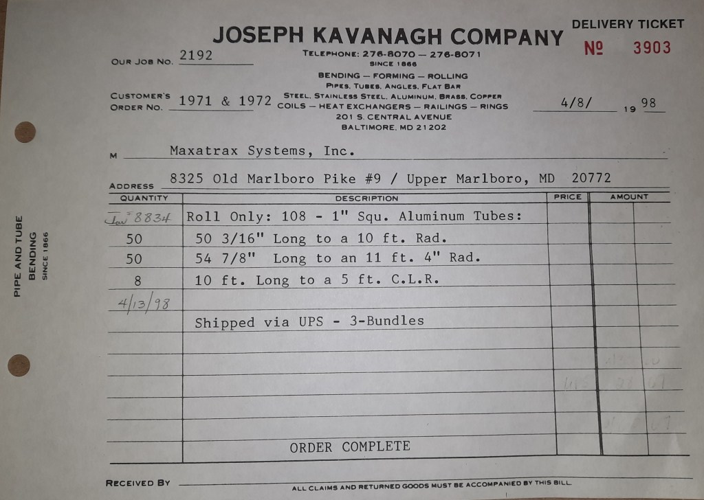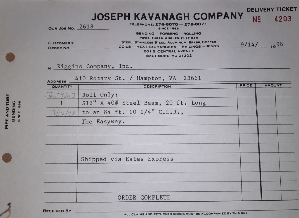 Baseball season is almost upon us and I cannot wait. Opening Day is next week and after such a good year in 1997, I’m hoping for more of the same. One big change for the Orioles is a new manager. Davey Johnson resigned after last season. Rumors of some falling out between him and ownership abound but I don’t really know. The Birds promoted Pitching Coach Ray Miller to skipper and I think he’ll do well. We knock out a few jobs this week for our usual local fab shops and one for a long distance customer, Machine Shop of Murfreesboro in NC. We also finish some work for the John Gutierrez Studio. John is a sculptor primarily but also a true metalsmith. He’s the sort of fellow I liked as soon as I met him. One day he walked into my office in an army jacket to discuss a job all the while eating Goetze’s caramels from Ann’s candy jar. Yes, you could say I liked him from the start.