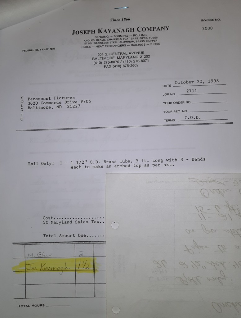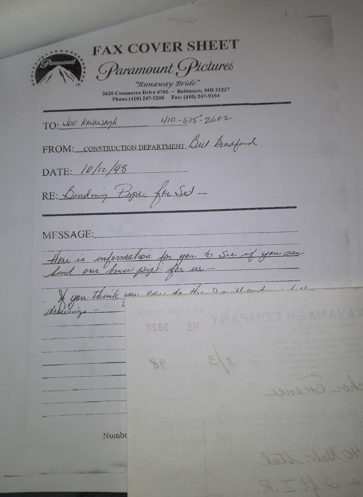 The Shop has a job to finish for a movie called “Runaway Bride.” They called a couple days ago and, of course, it’s a rush. It is being filmed in Berlin, MD and stars Julia Roberts and Richard Gere. They need some polished brass tube rolled for part of the set. There is a scene in a fancy store and they want shiny brass for it. They pick up and pay. I make a point of telling my parents about it. They live so close to Berlin. I’m sure they will be interested. Besides this pick up, Dave Hess comes by for some sculptural pieces along with a couple of our other regulars.