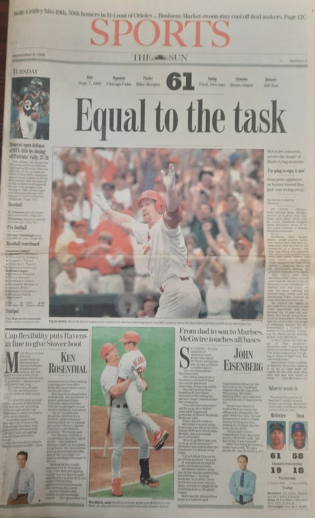 Summer is essentially over and it was a busy one. The Shop still has plenty of work but the volume slows a bit. It’s a seasonal thing. During the morning coffee break, the discussion is primarily about Cardinals First Baseman Mark McGwire. He hit his 62nd home run last night thus breaking Roger Maris’ single season record. That record has stood for my entire life and it’s impressive. I have seen him play when he was in the American League with the A’s. He’s the kind of hitter if he walks twice and hits a solo home run, you feel like you got him.