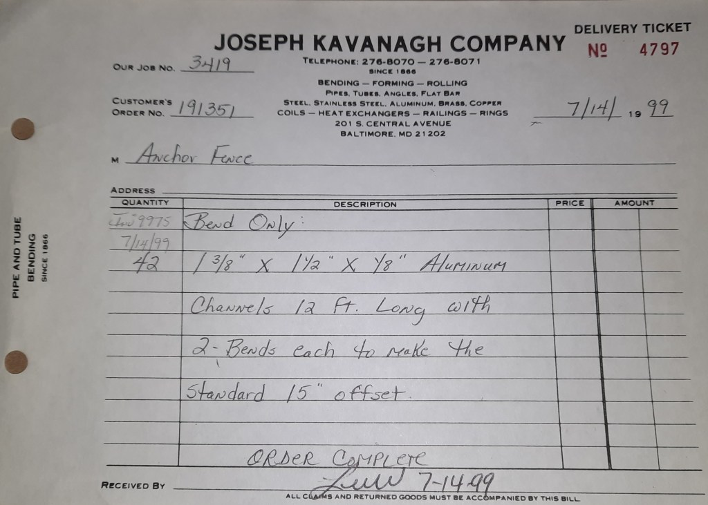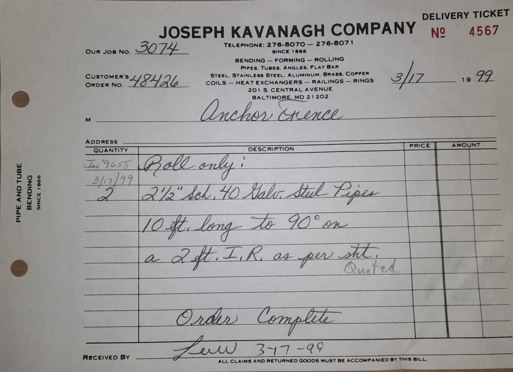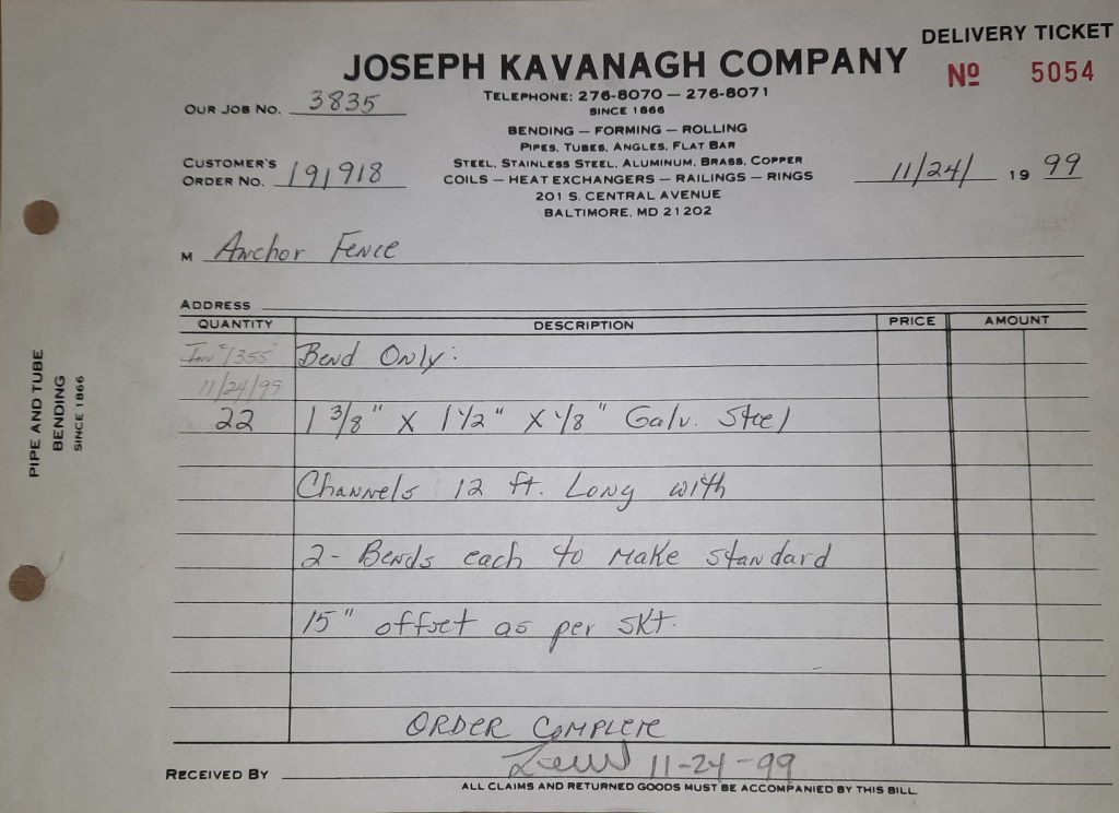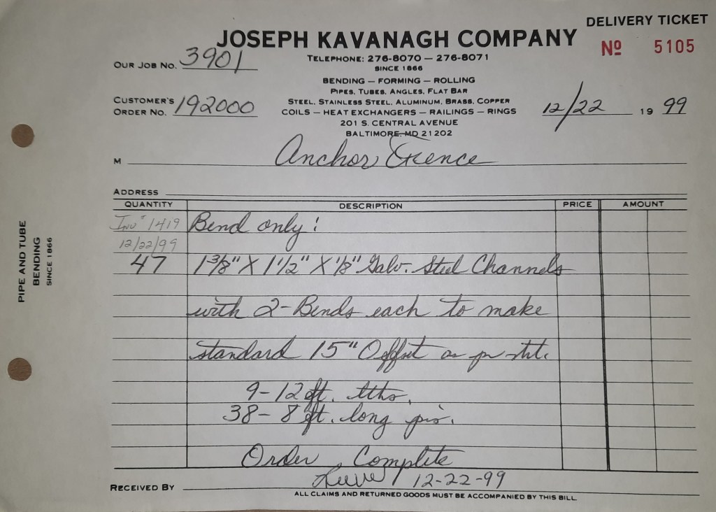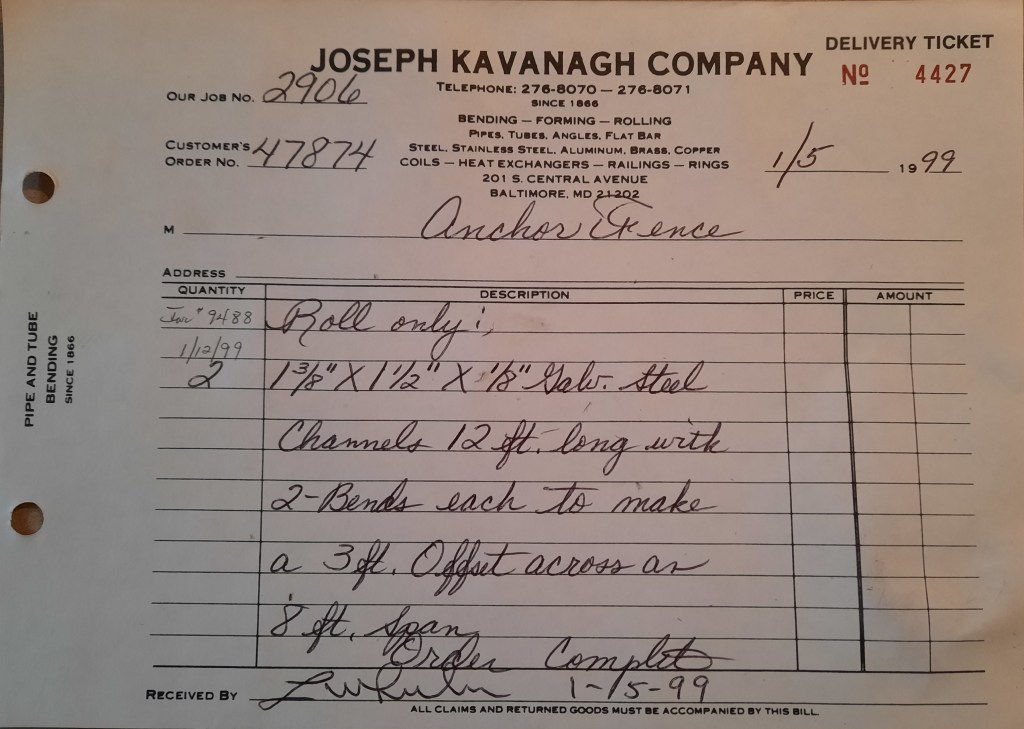 The Joseph Kavanagh Company begins yet another year at the corner of Pratt and Central. We moved here in 1911 and so far it has worked out pretty well. It’s 1999 now and I recall Kubrick’s film. A few years ago, 1999 seemed so far in the future but here we are. The Kavanagh’s and their crew return from our holiday vacation to a few jobs on the books including some work for Anchor Fence and Codd Fabricators. They are two of our most reliable customers and the boys get to it while I start taking calls and the year starts in earnest.