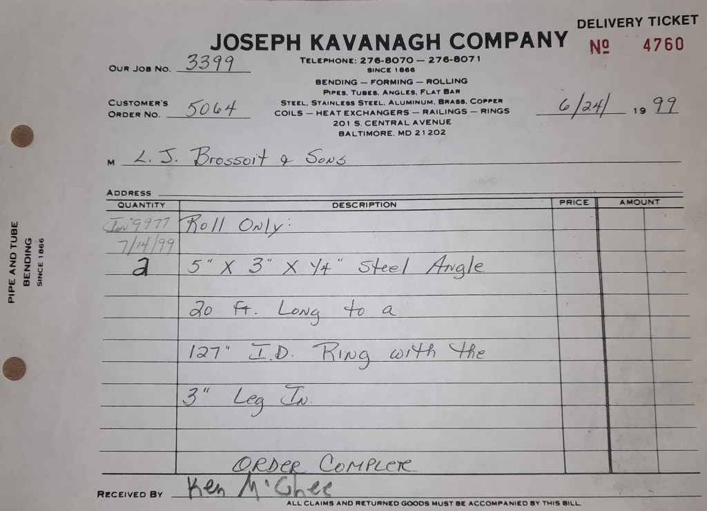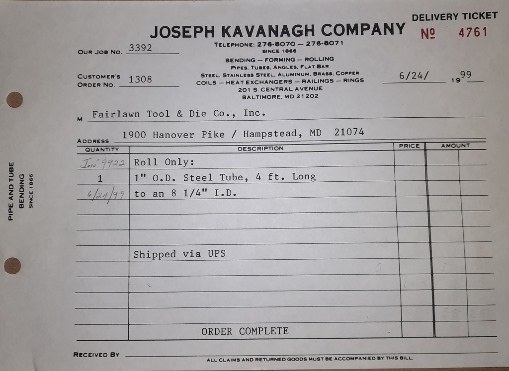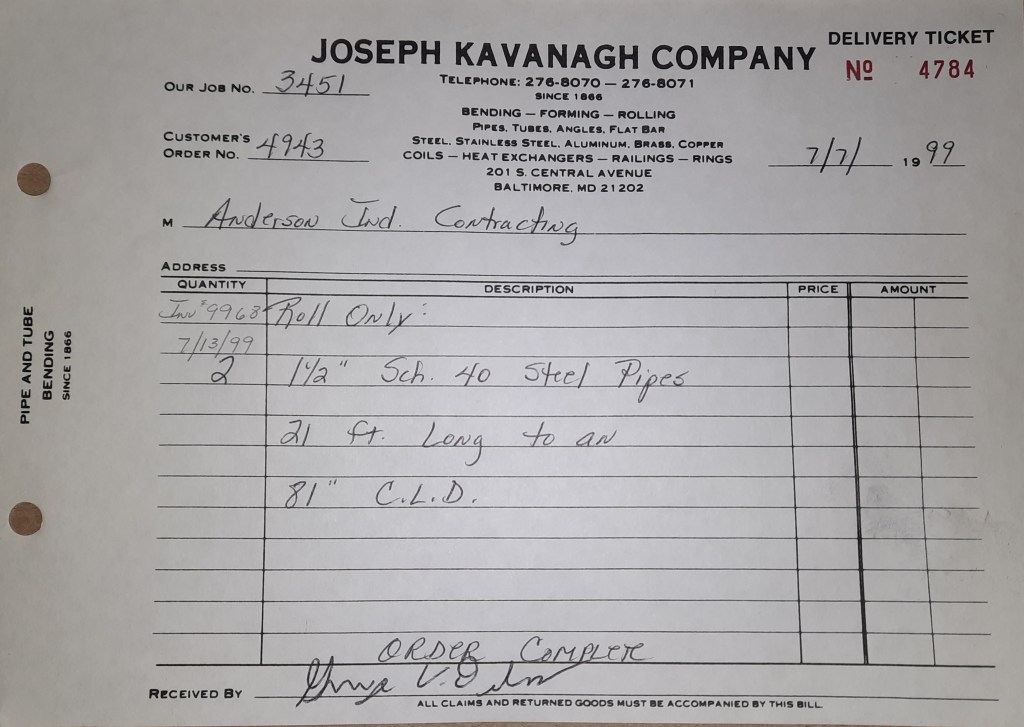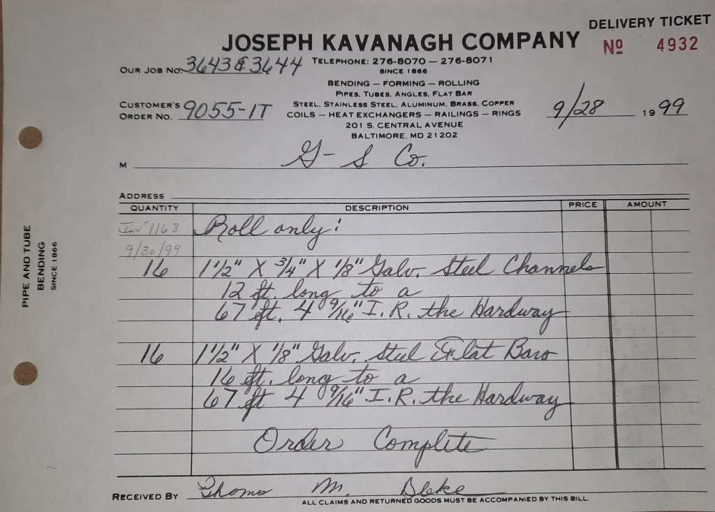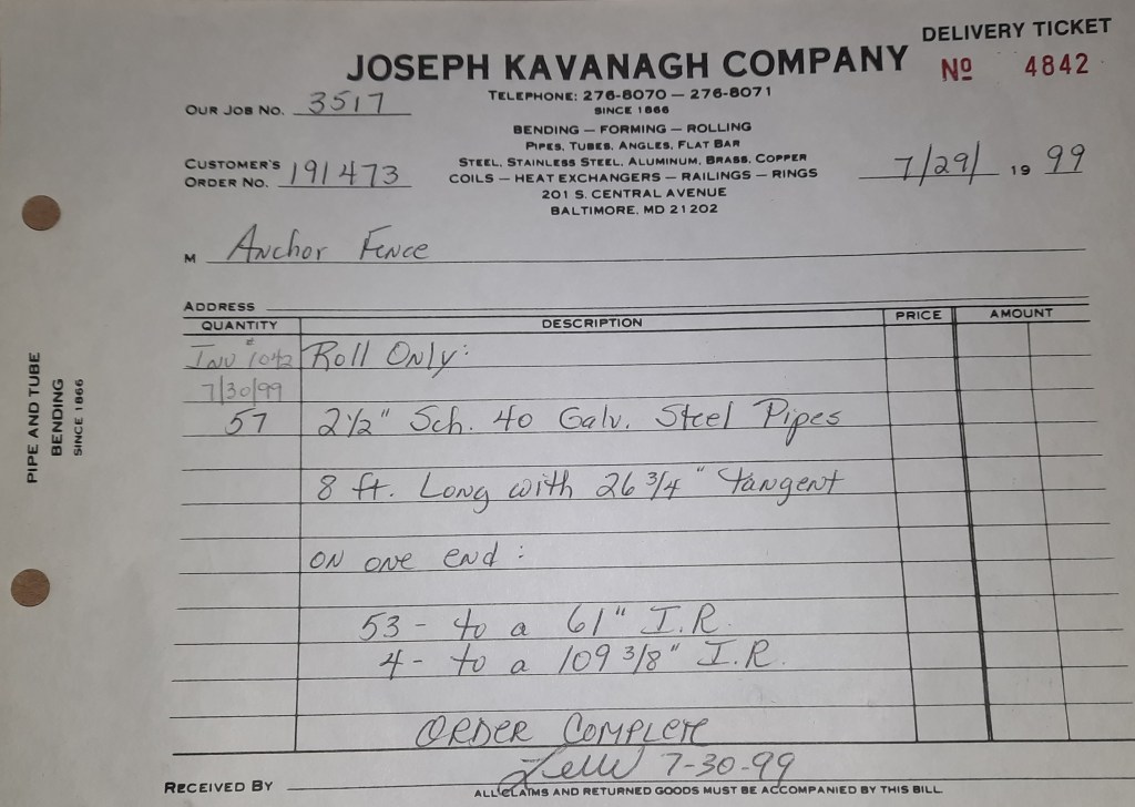 The Joseph Kavanagh Company begins yet another year at the corner of Pratt and Central. We moved here in 1911 and so far it has worked out pretty well. It’s 1999 now and I recall Kubrick’s film. A few years ago, 1999 seemed so far in the future but here we are. The Kavanagh’s and their crew return from our holiday vacation to a few jobs on the books including some work for Anchor Fence and Codd Fabricators. They are two of our most reliable customers and the boys get to it while I start taking calls and the year starts in earnest.