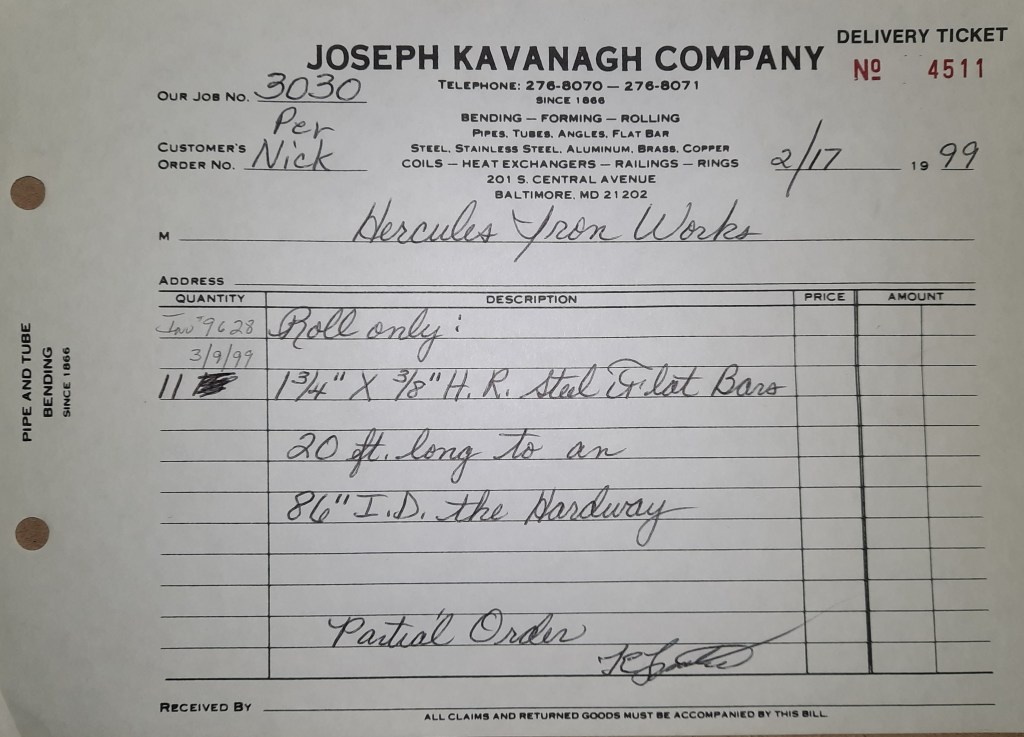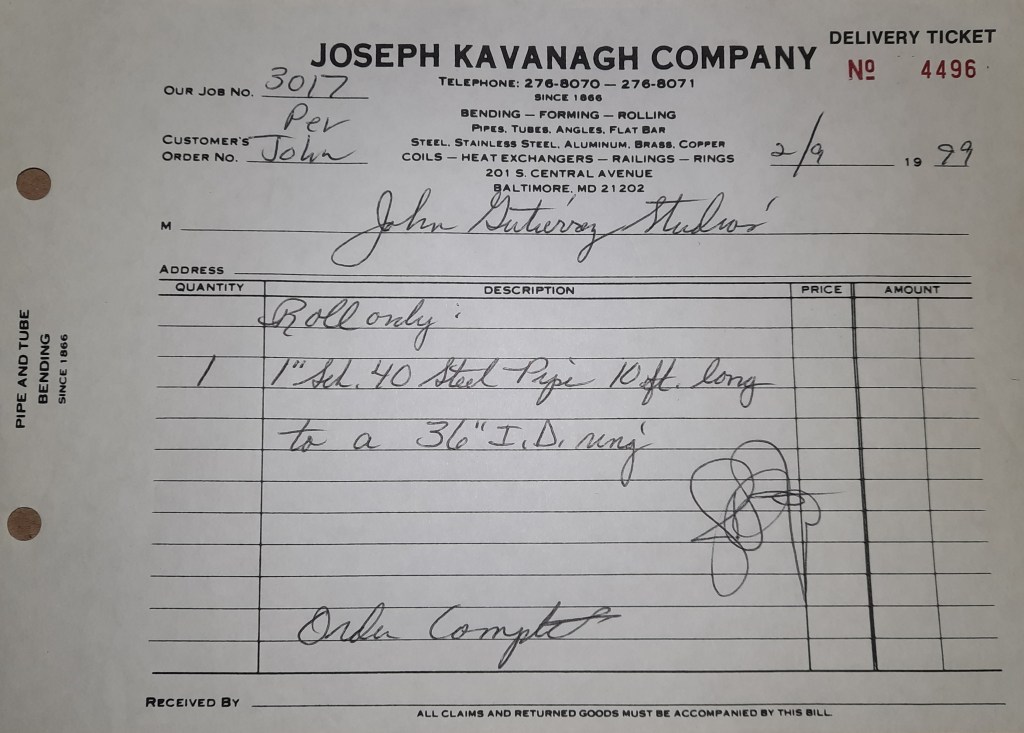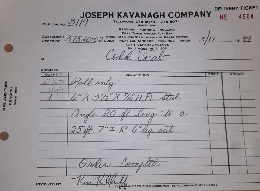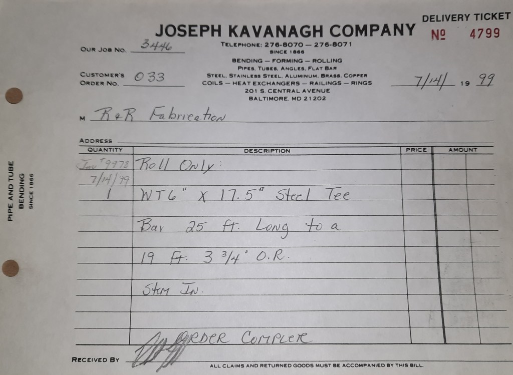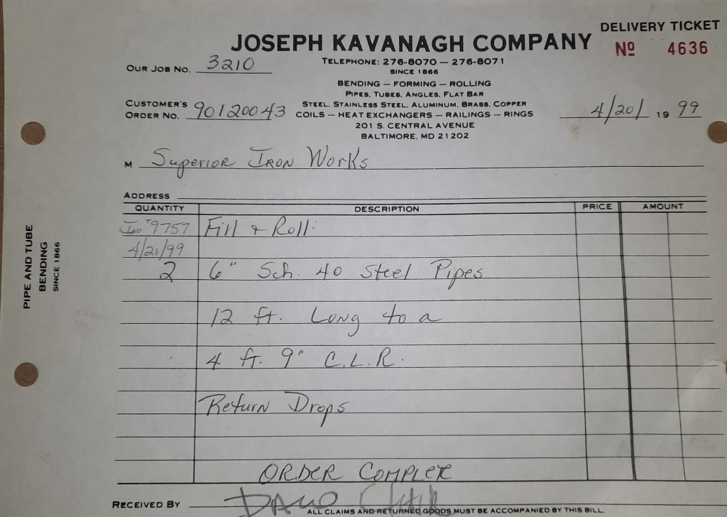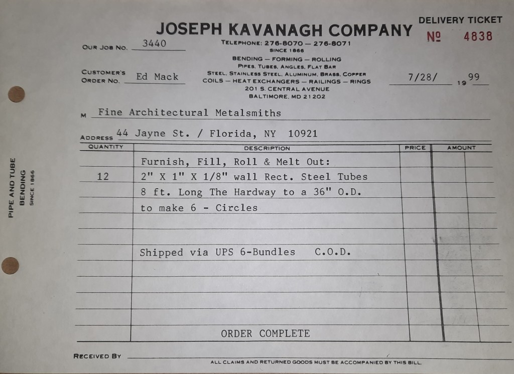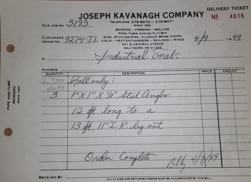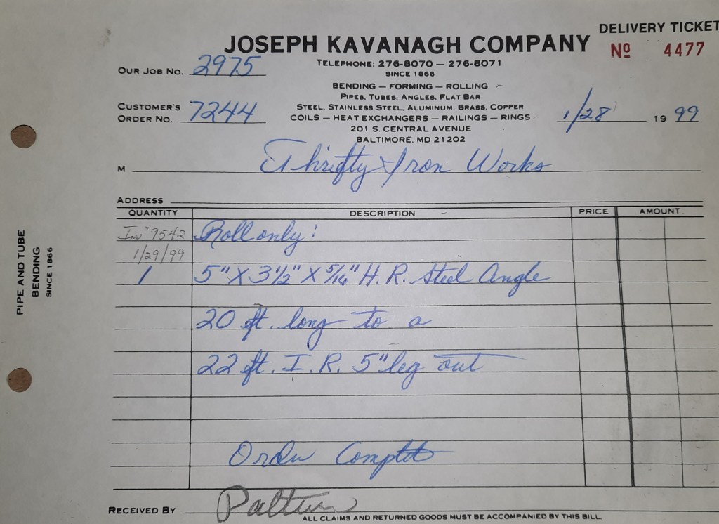 It’s unseasonably warm at the Shop on this Tuesday. February is usually Baltimore’s coldest month but so far the highs have been in the upper 40 degrees. As someone who hates the cold, I’ll take it. We’ve been steady if not busy to start the year and I’ll take that too. A few jobs are completed today and I fill out delivery tickets for R and R Fabricators, Dundalk Ornamental Iron Works and John Gutierrez Studios.
