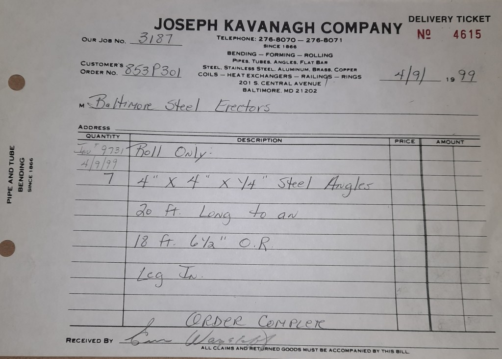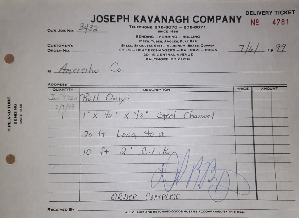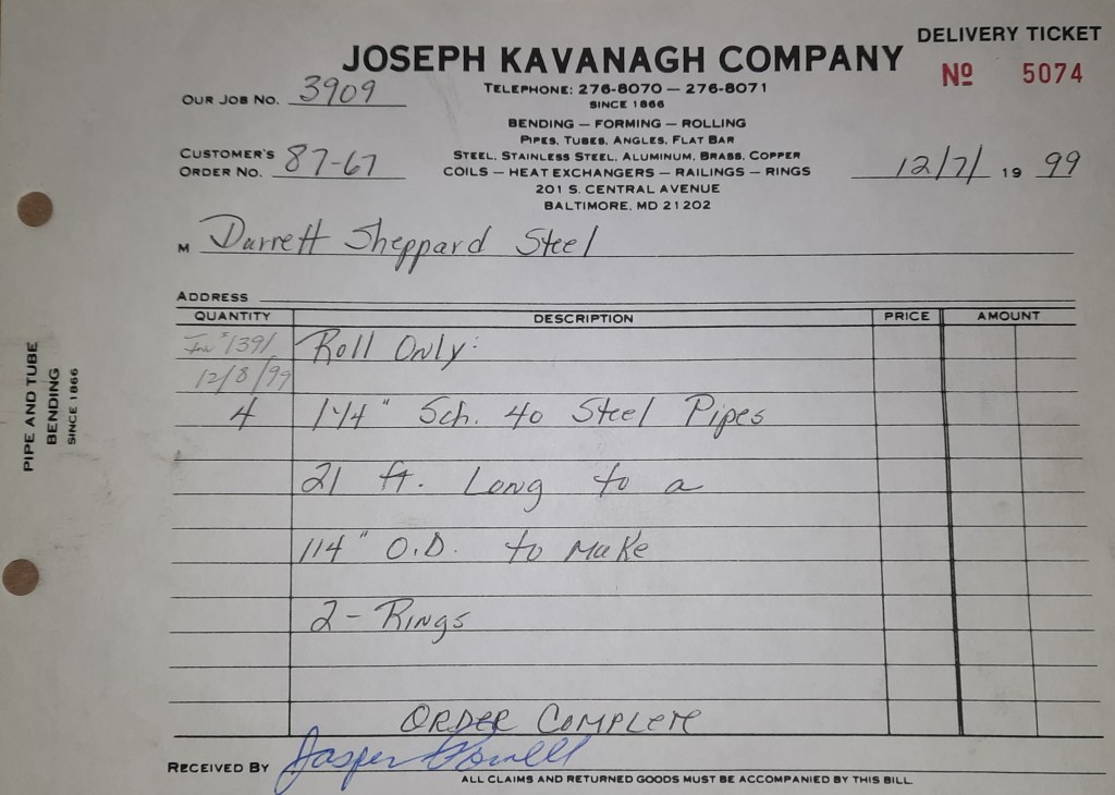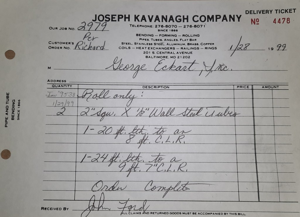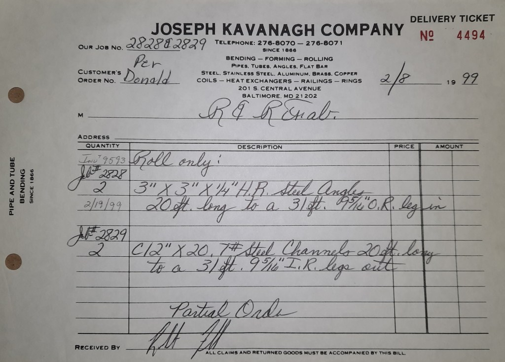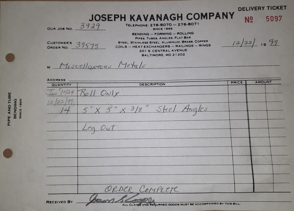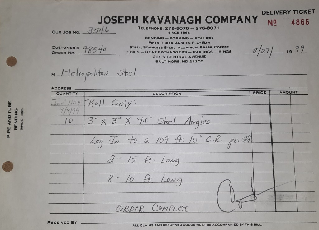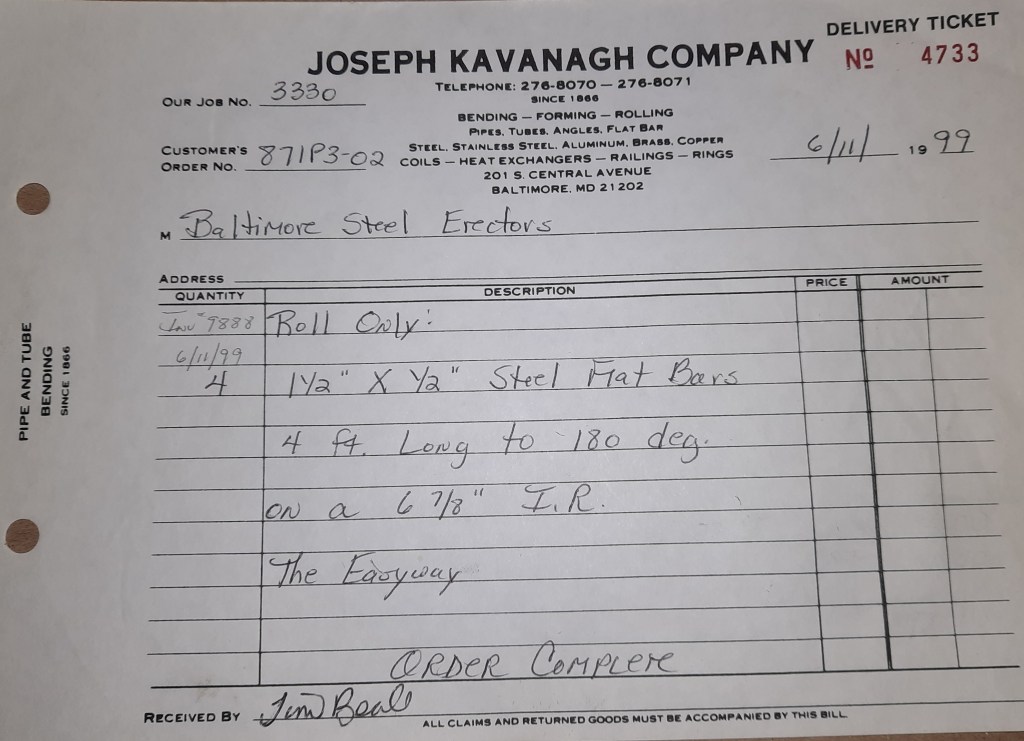 It’s unseasonably warm at the Shop on this Tuesday. February is usually Baltimore’s coldest month but so far the highs have been in the upper 40 degrees. As someone who hates the cold, I’ll take it. We’ve been steady if not busy to start the year and I’ll take that too. A few jobs are completed today and I fill out delivery tickets for R and R Fabricators, Dundalk Ornamental Iron Works and John Gutierrez Studios.