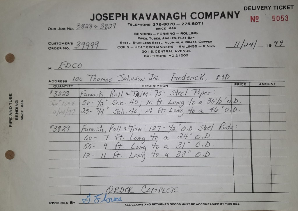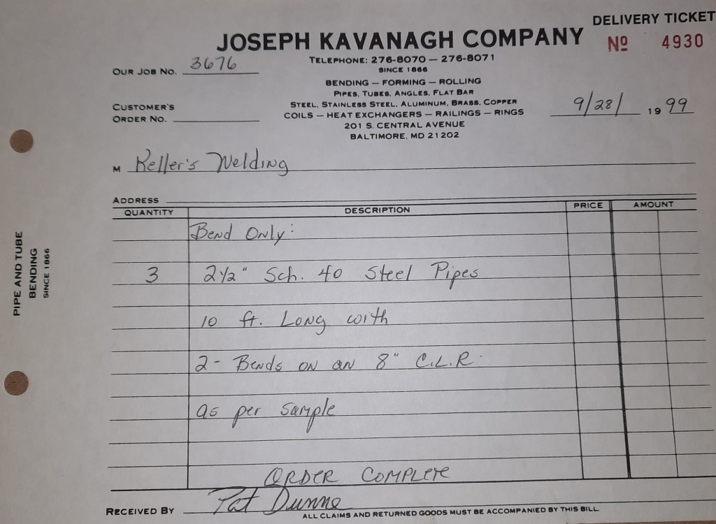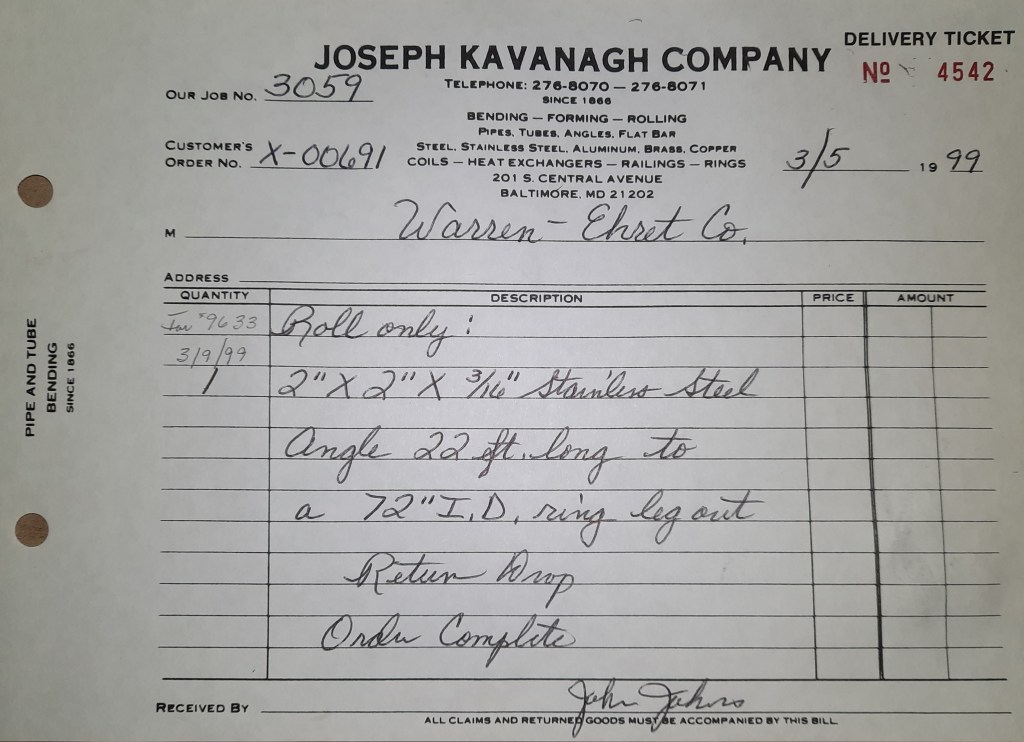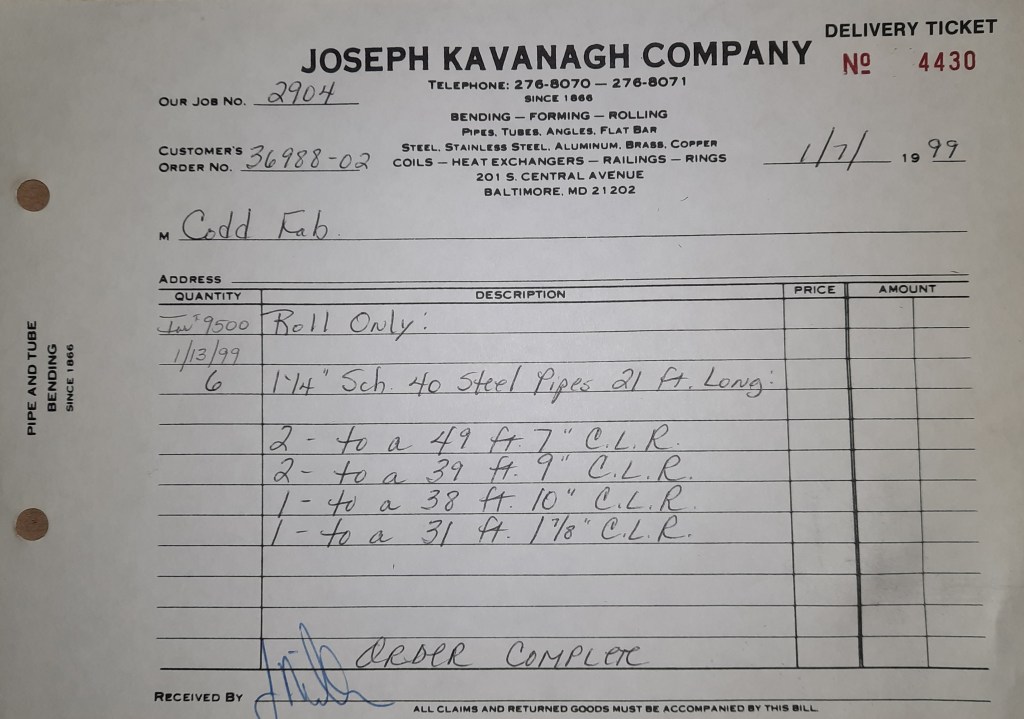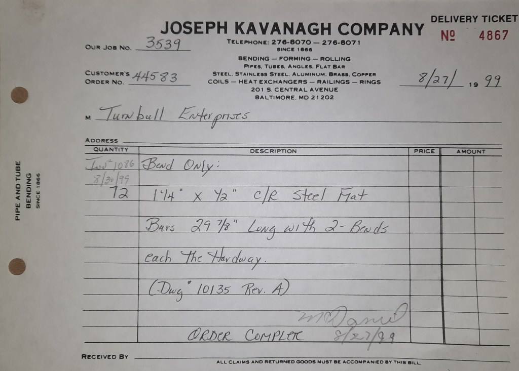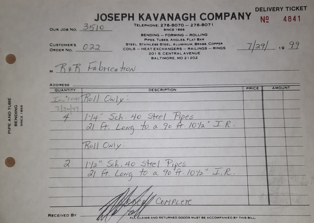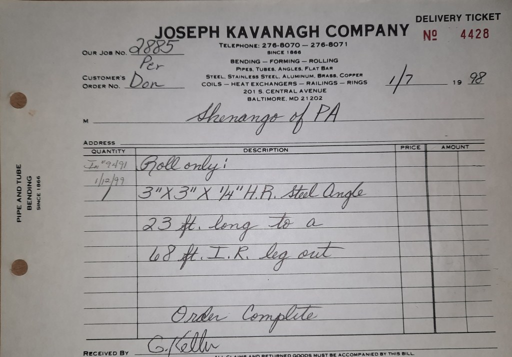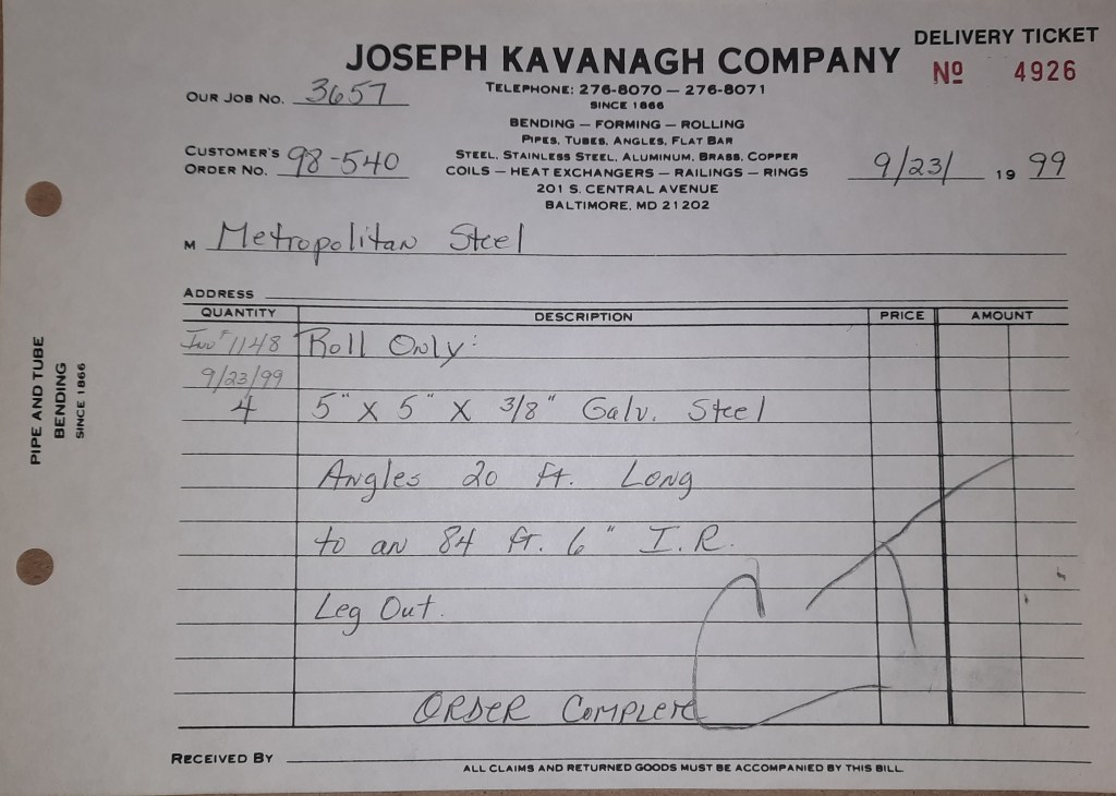 It’s unseasonably warm at the Shop on this Tuesday. February is usually Baltimore’s coldest month but so far the highs have been in the upper 40 degrees. As someone who hates the cold, I’ll take it. We’ve been steady if not busy to start the year and I’ll take that too. A few jobs are completed today and I fill out delivery tickets for R and R Fabricators, Dundalk Ornamental Iron Works and John Gutierrez Studios.